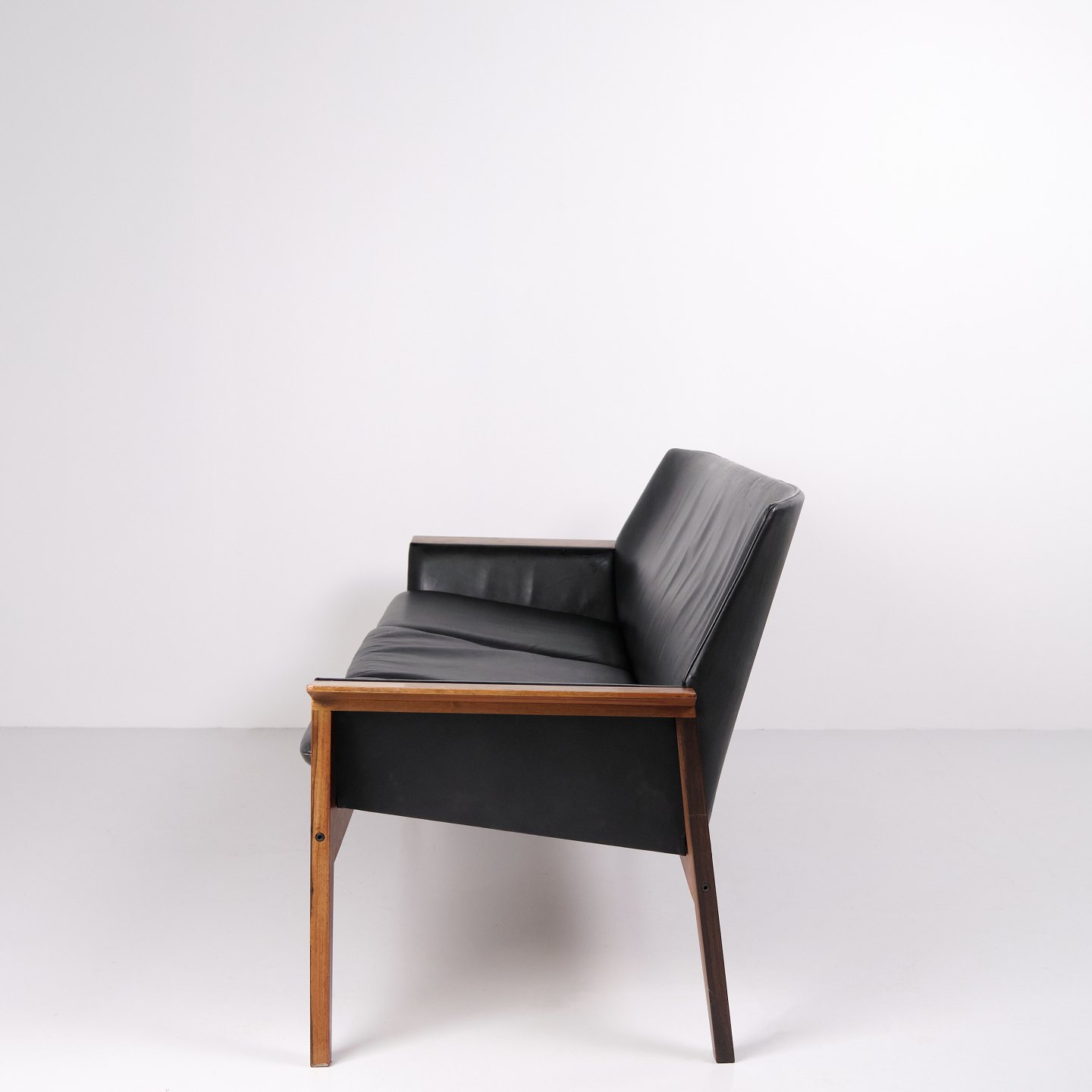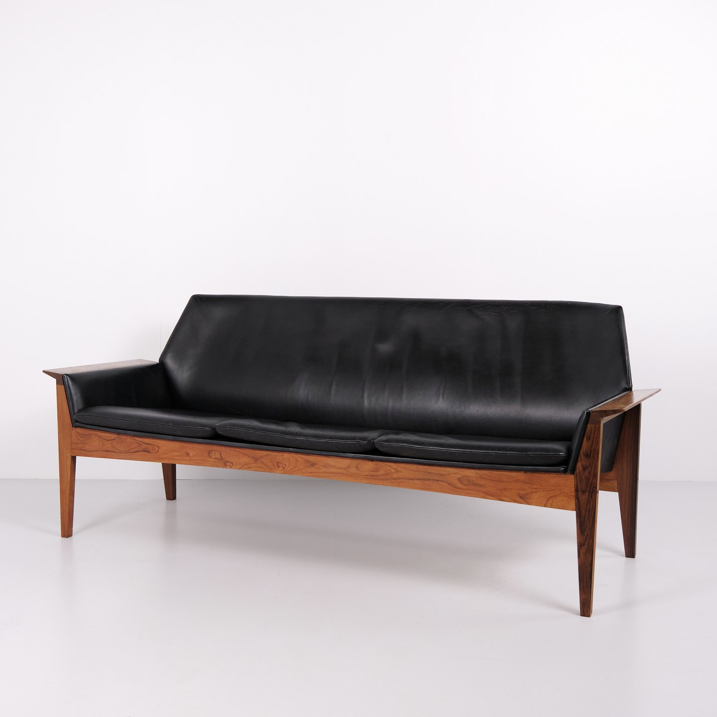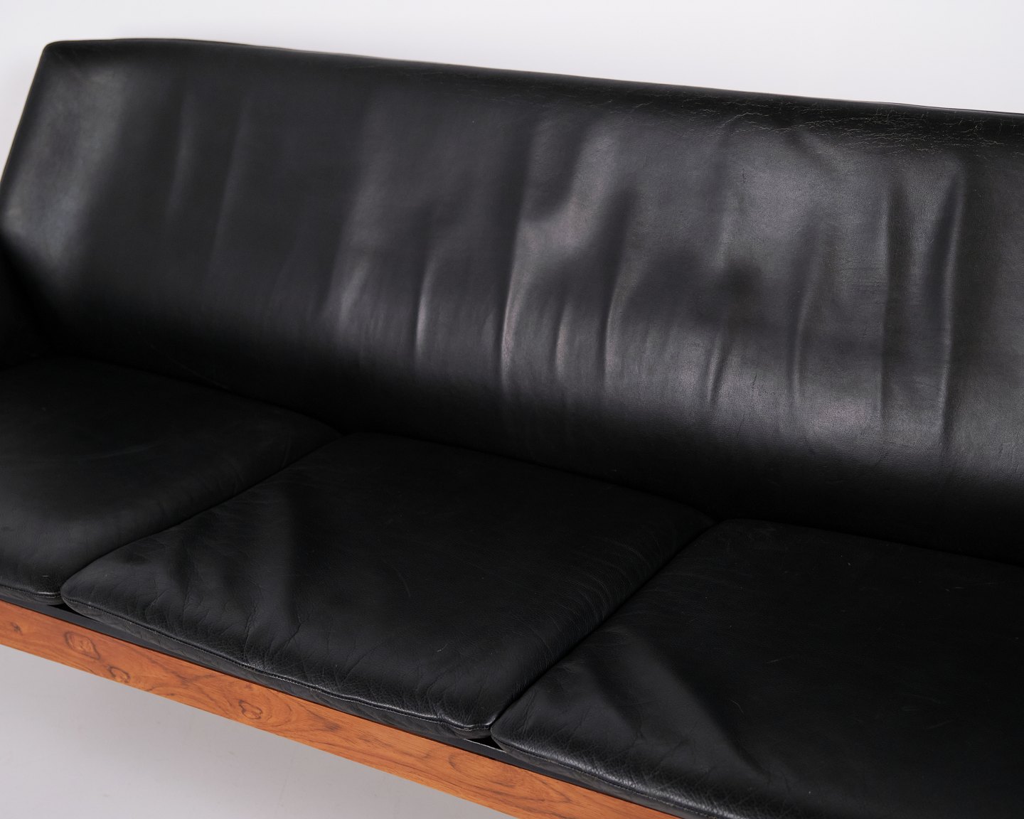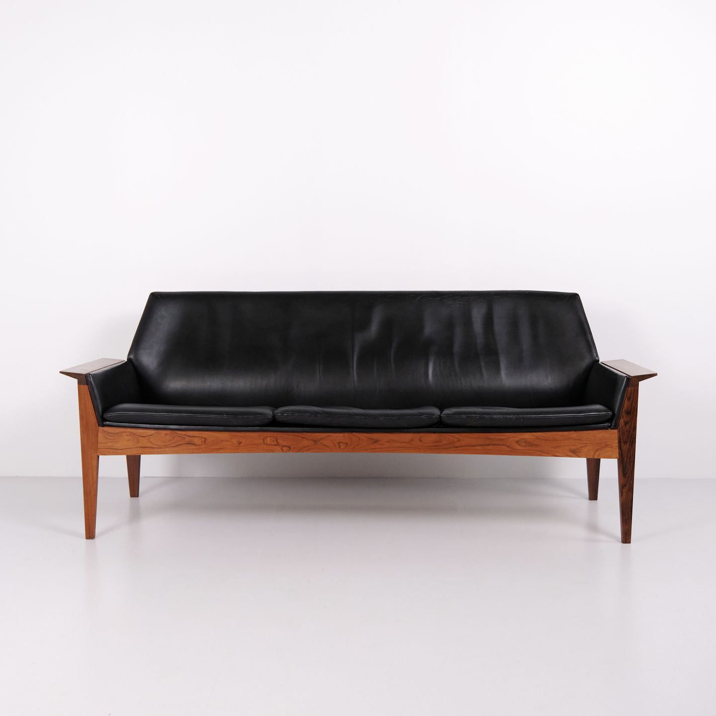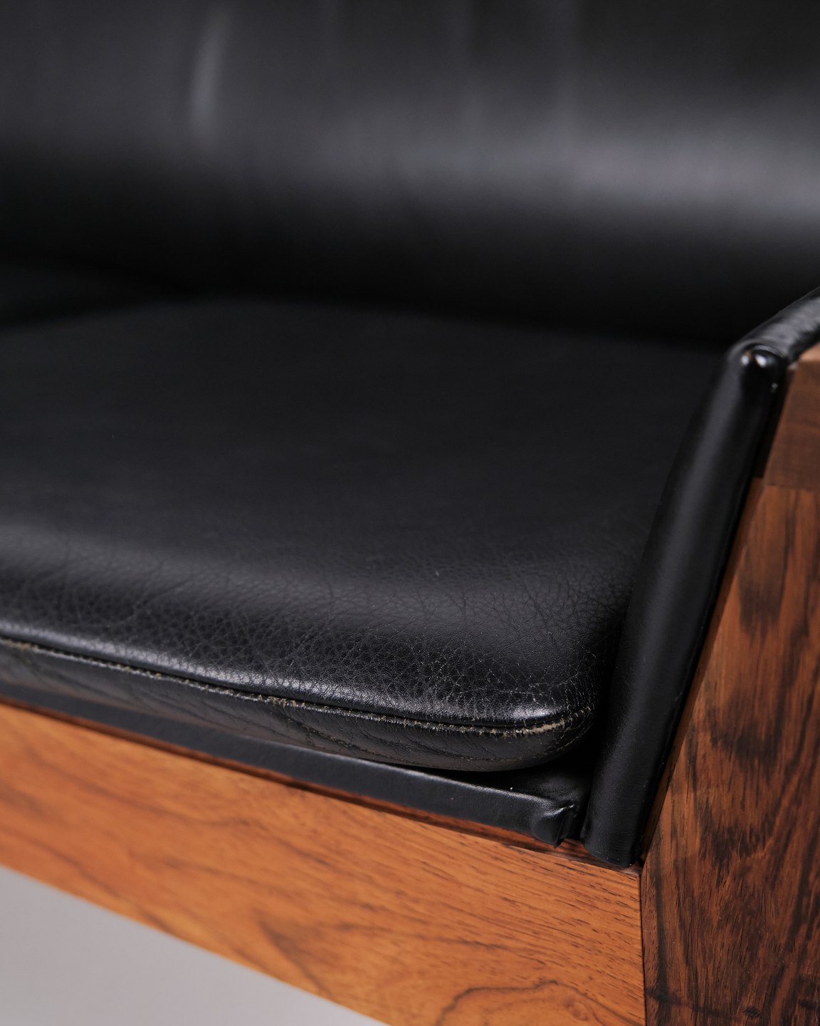 Three seater sofa designed by Steen Østergaard for Jason Møbler in the 1960s. Crafted with frame in Rio rosewood and original black leather upholstery. The model features clean lines, low proportions and a restrained design language typical of Danish modernism. Steen Østergaard trained as a cabinetmaker and studied at the School of Arts & Crafts in Copenhagen. He worked for Finn Juhl from 1962 to 1964 and established his own studio in 1966. Østergaard is known for his work with new materials, industrial production and furniture for Cado, France & Son and Abstracta.— Origin: Denmark
