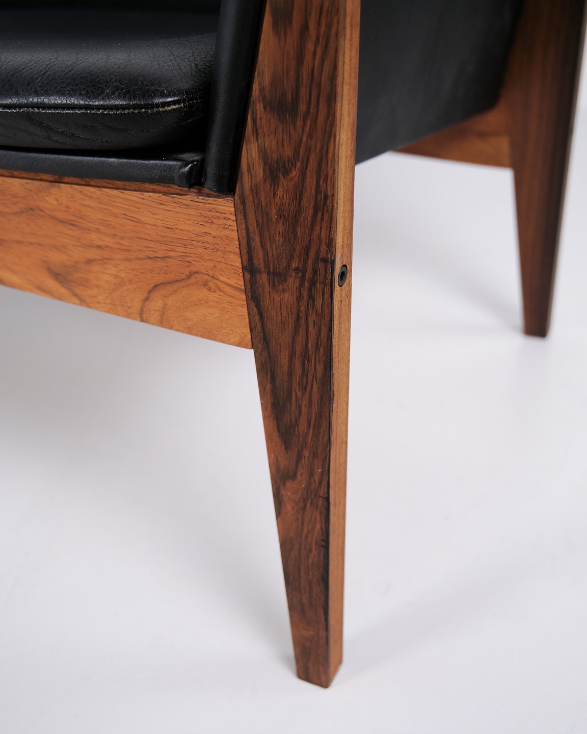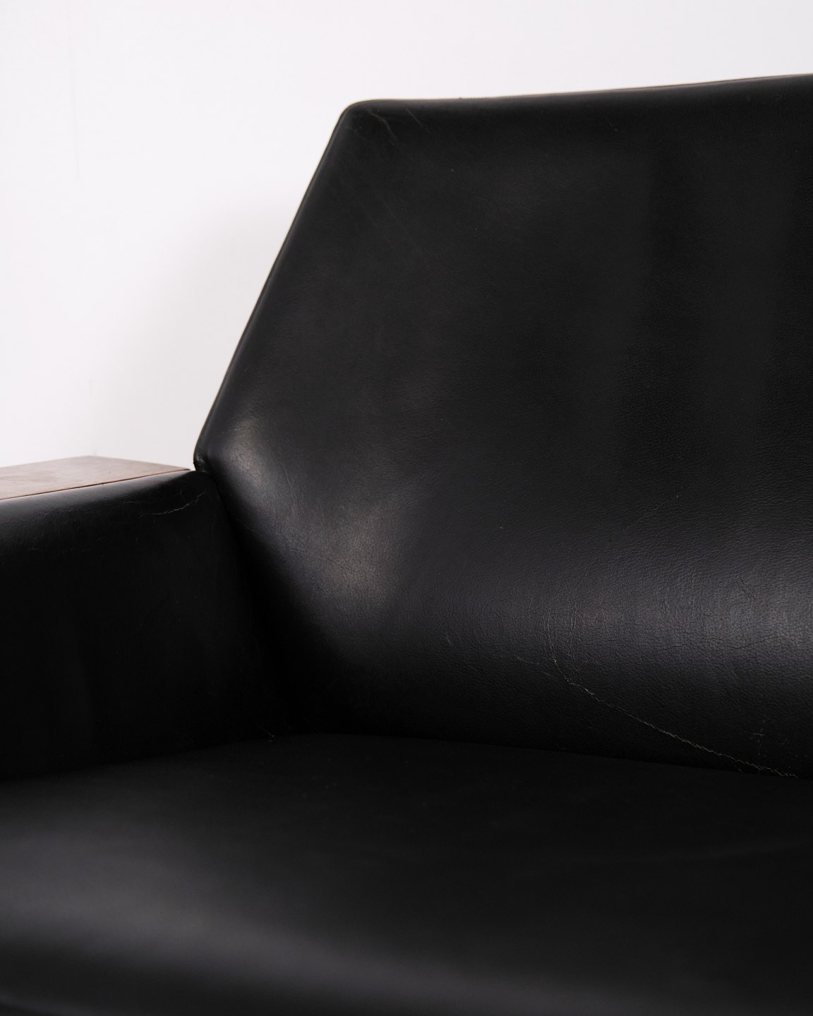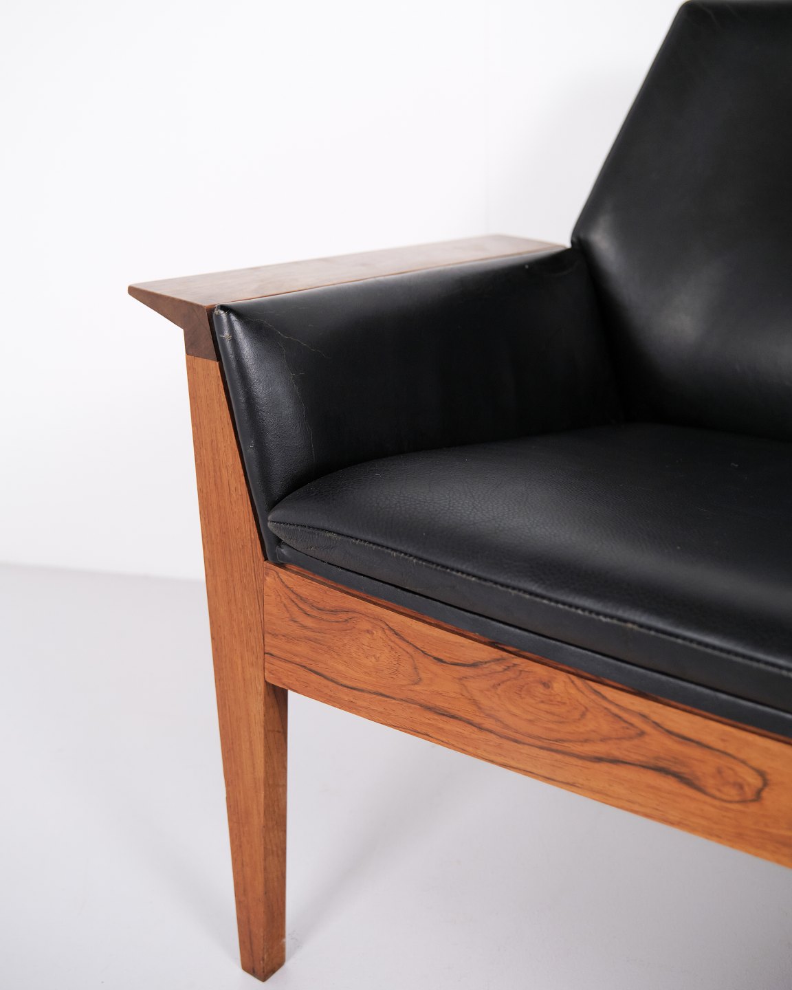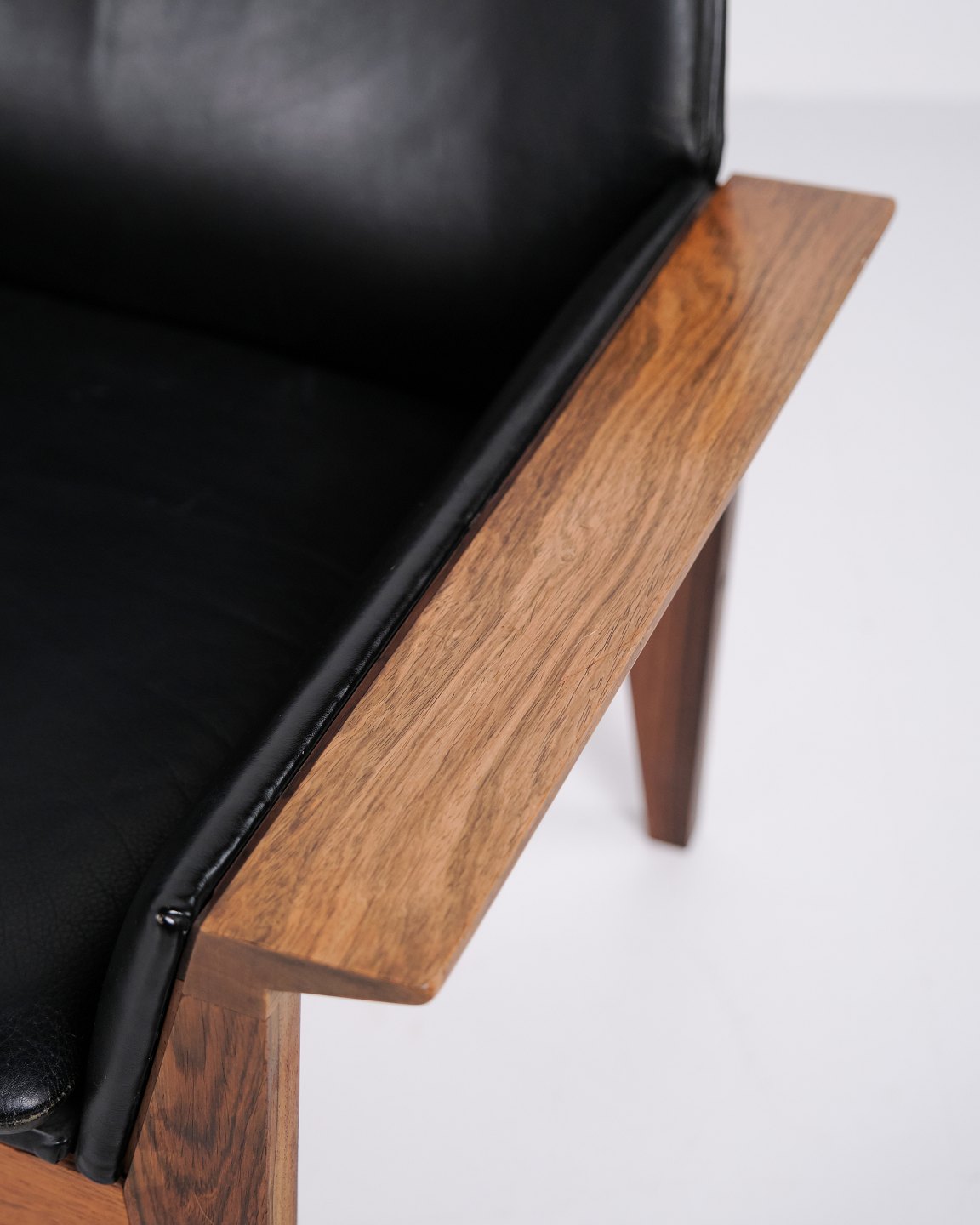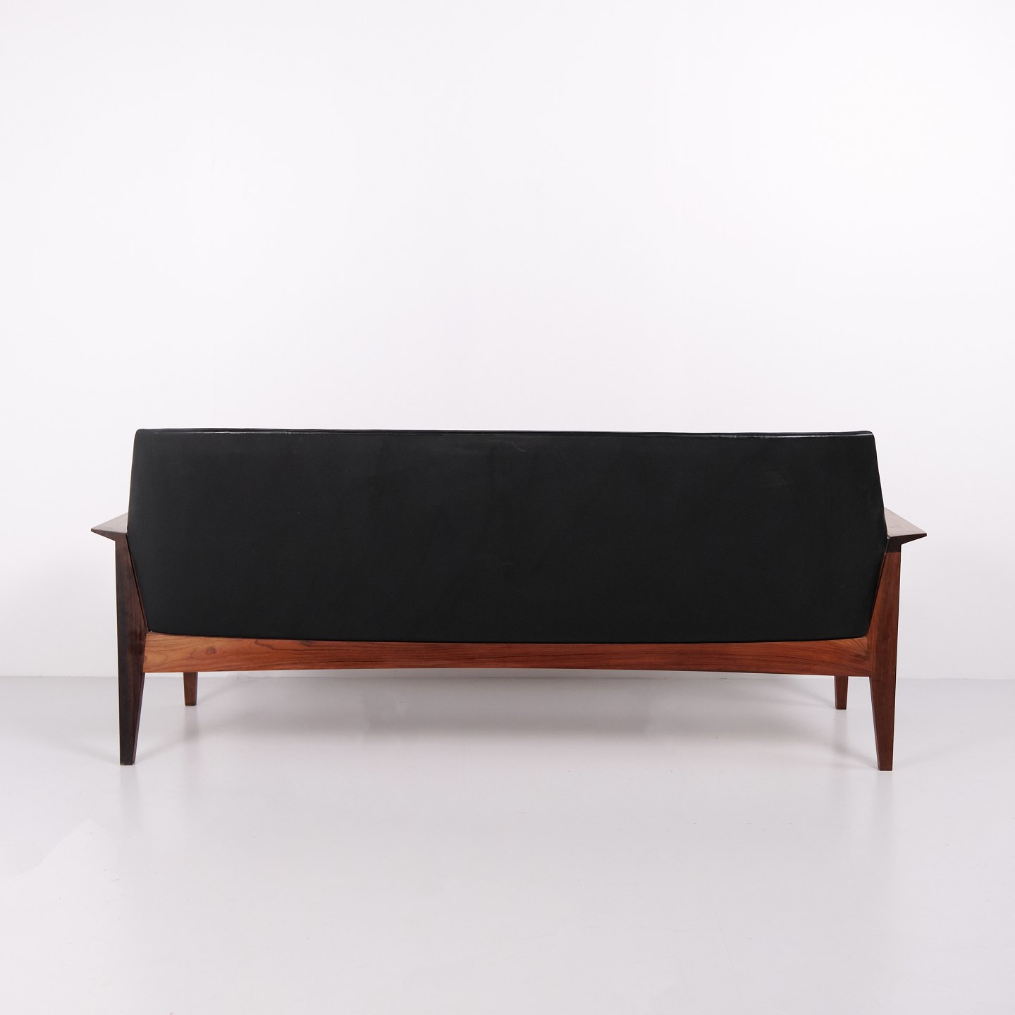 Three seater sofa designed by Steen Østergaard for Jason Møbler in the 1960s. Crafted with frame in Rio rosewood and original black leather upholstery. The model features clean lines, low proportions and a restrained design language typical of Danish modernism. Steen Østergaard trained as a cabinetmaker and studied at the School of Arts & Crafts in Copenhagen. He worked for Finn Juhl from 1962 to 1964 and established his own studio in 1966. Østergaard is known for his work with new materials, industrial production and furniture for Cado, France & Son and Abstracta.— Origin: Denmark