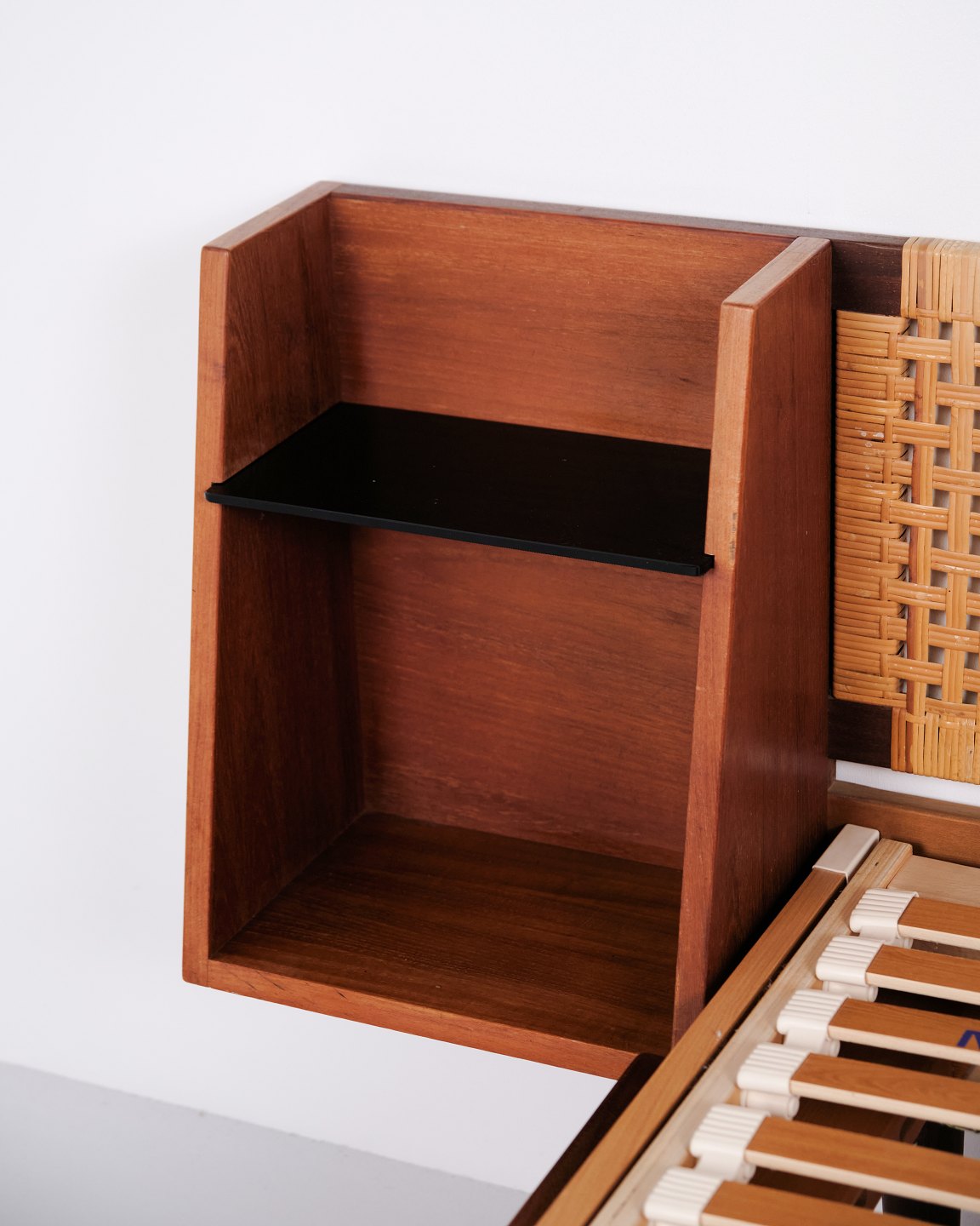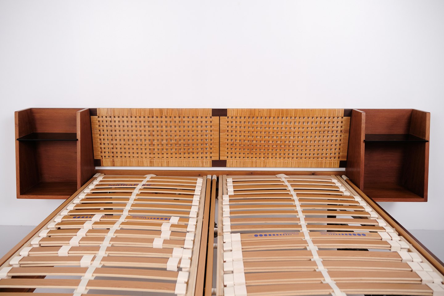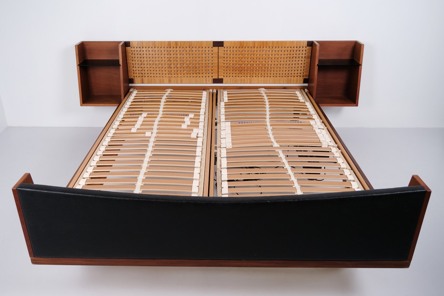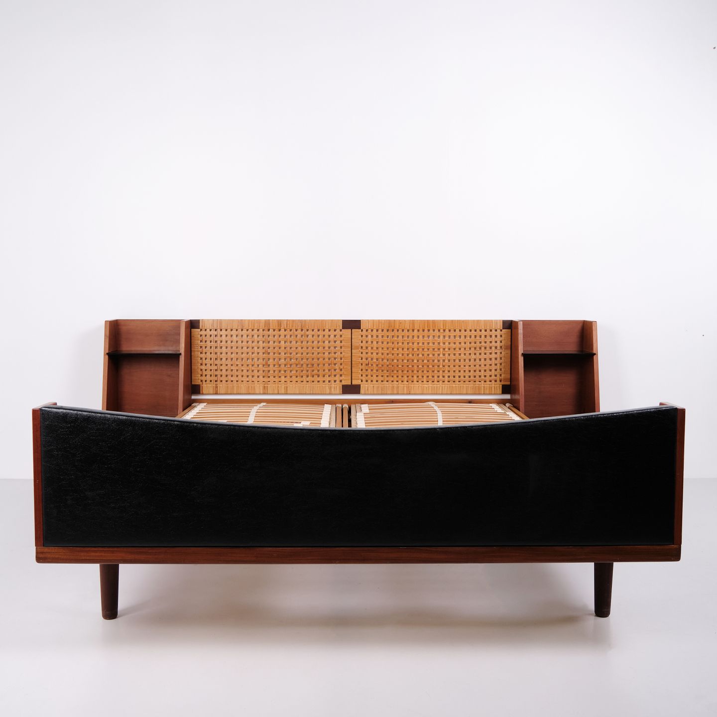 Model GE 701 double bed designed by Hans J. Wegner and manufactured by Getama in the 1950s. Crafted in veneered and solid teak. Headboard and footboard with cane weaving and black faux leather. Headboard with integrated bedside tables featuring black glass shelves and lower shelf. Brass fittings. Hans J. Wegner collaborated with Getama for many years and designed several teak furniture models for home interiors and bedrooms.— Origin: Denmark