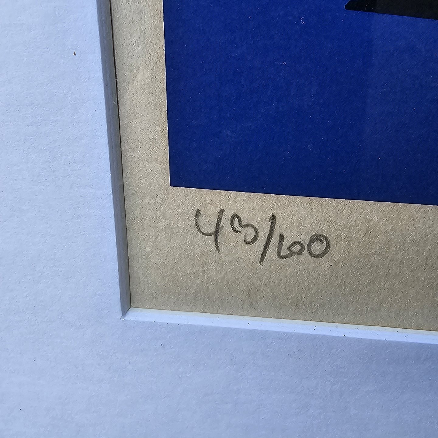 Litografi med abstrakt motiv i sort og blå monteret i sølvrammeKunstner Benny Dorè (født 1948), signeret