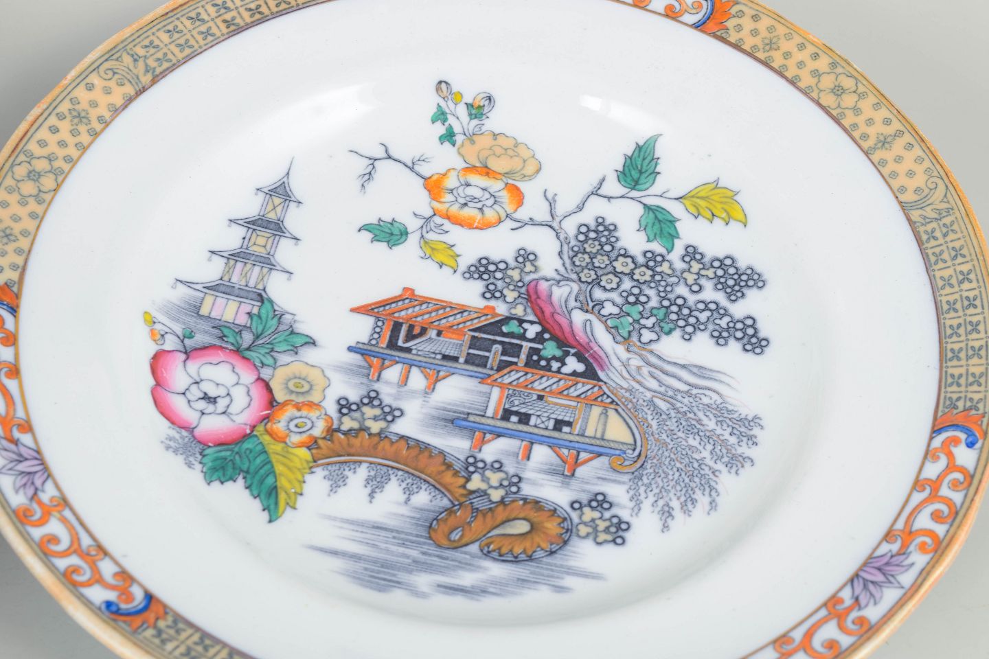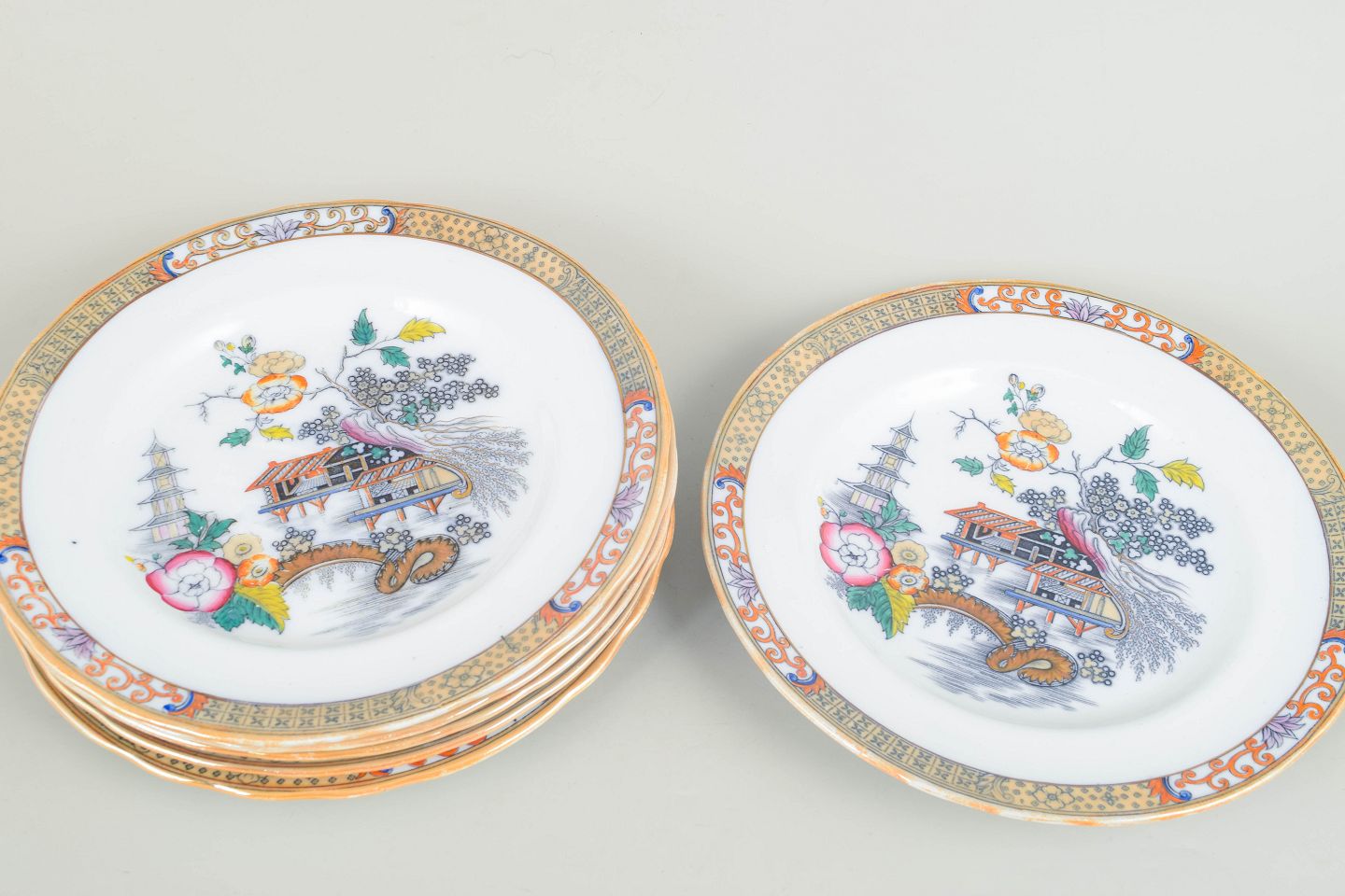 Rörstrand Japan series, set of six dinner plates.Dinner plates in faience with oriental-inspired decoration in polychrome colours and finely detailed painting in Japanese style, characteristic of Rörstrand’s japonisme production from the early 20th century.