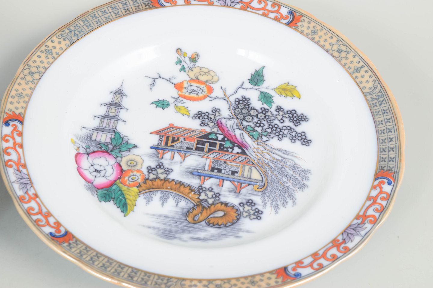 Rörstrand Japan series, set of six dinner plates.Dinner plates in faience with oriental-inspired decoration in polychrome colours and finely detailed painting in Japanese style, characteristic of Rörstrand’s japonisme production from the early 20th century.