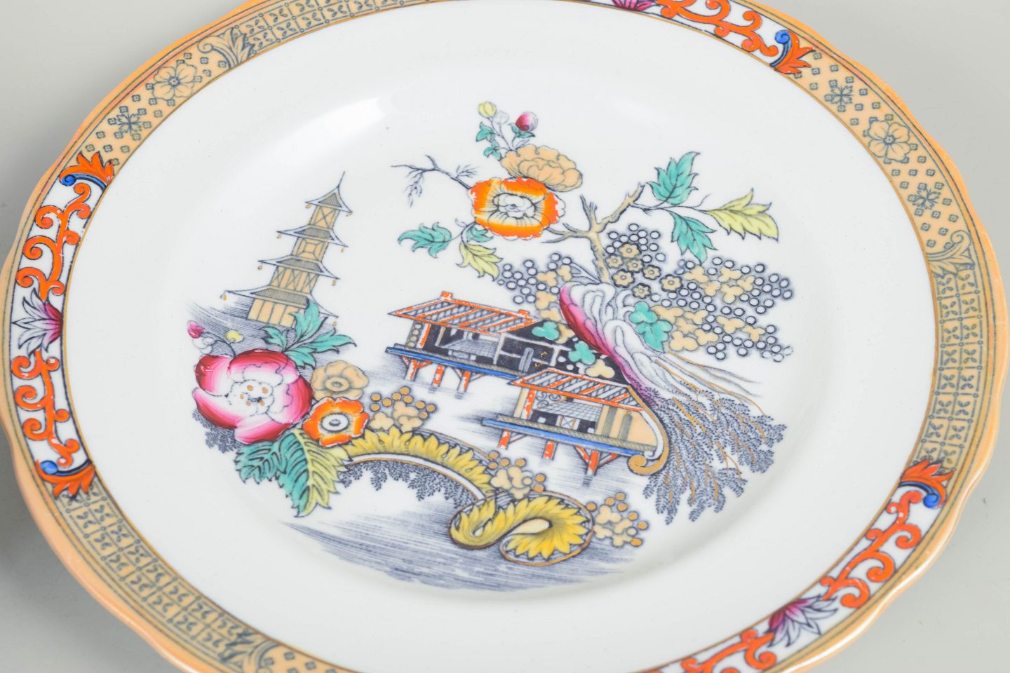 Rörstrand Japan series, set of five dinner plates.Dinner plates in faience with oriental-inspired decoration in polychrome colours and finely detailed painting in Japanese style, characteristic of Rörstrand’s japonisme production from the early 20th century.