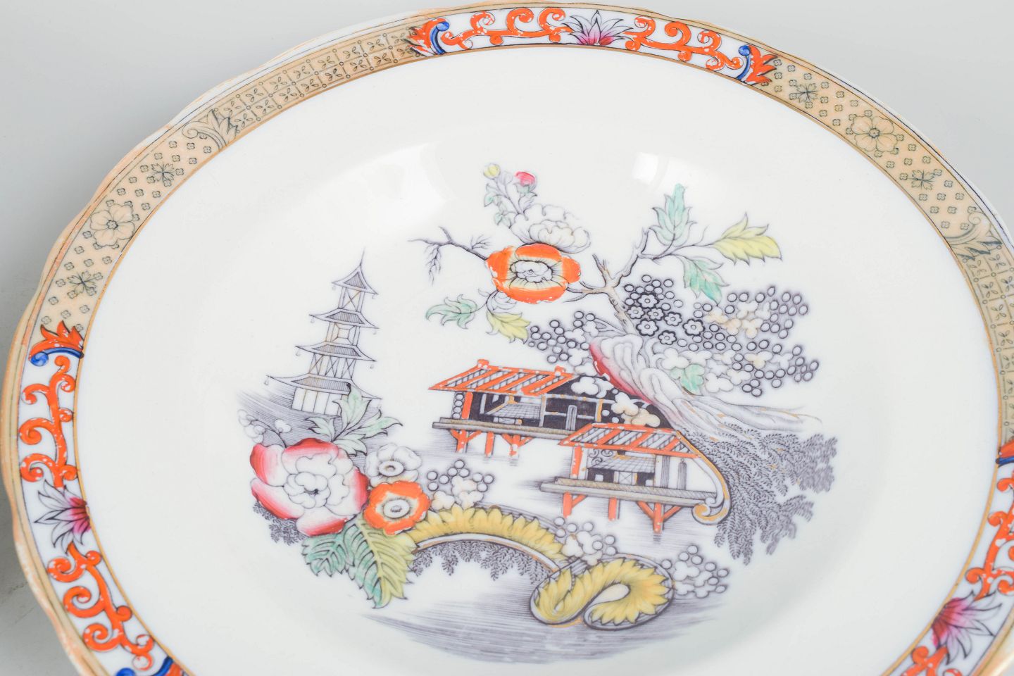 Rörstrand Japan series, set of six deep plates.Deep plates in faience with oriental-inspired decoration in polychrome colours and finely detailed painting in Japanese style, characteristic of Rörstrand’s japonisme production from the early 20th century.