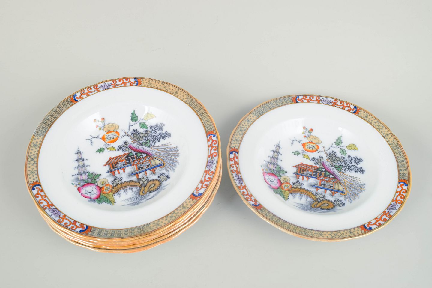 Rörstrand Japan series, set of six deep plates.Deep plates in faience with oriental-inspired decoration in polychrome colours and finely detailed painting in Japanese style, characteristic of Rörstrand’s japonisme production from the early 20th century.