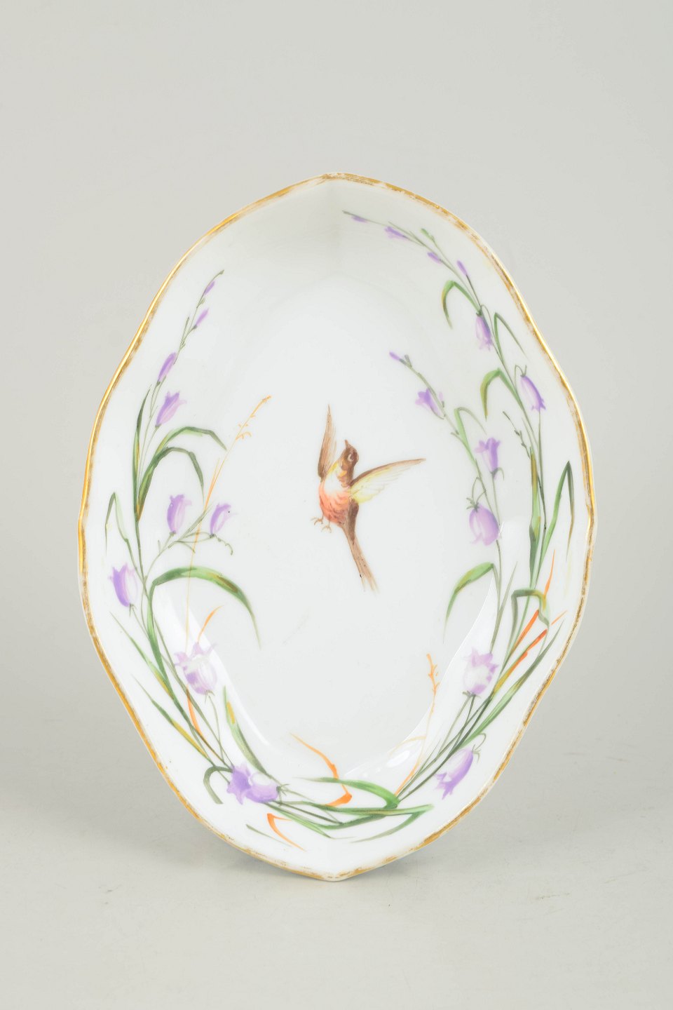Royal Copenhagen, oval dish with bird motif.Antique oval dish in hand-painted porcelain featuring a central bird motif surrounded by floral decoration in purple and green tones, finished with a gilded rim.