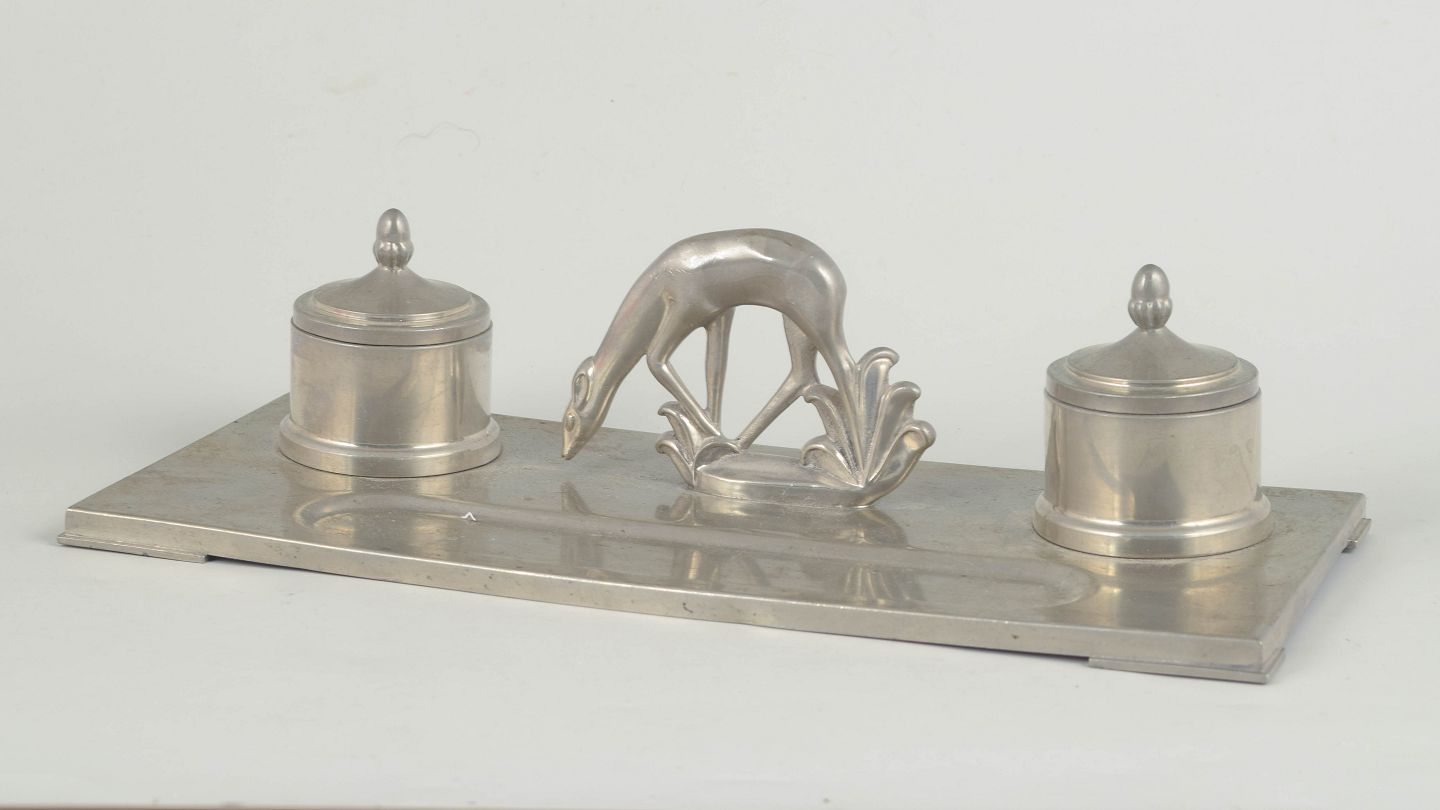 Carl Einar Borgström for Ystad Tenn, pewter ink well.Rectangular pewter ink well with two containers and a sculptural deer figure at the centre. One glass insert is missing. Marked on the base.