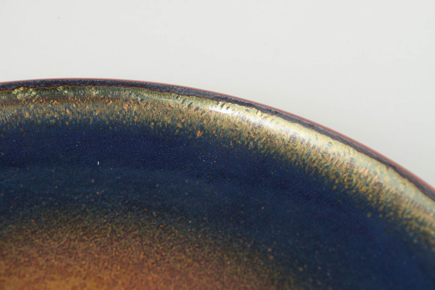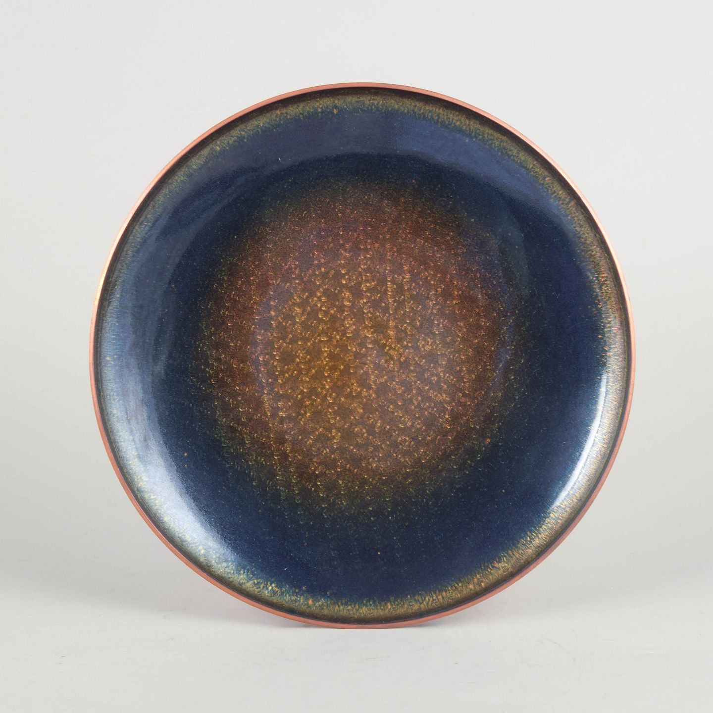 David Andersen, enamel dish.Handmade dish in enamel on copper with a deep blue glaze and golden iridescent centre, characteristic of Scandinavian enamel work from the period. Marked on the base.