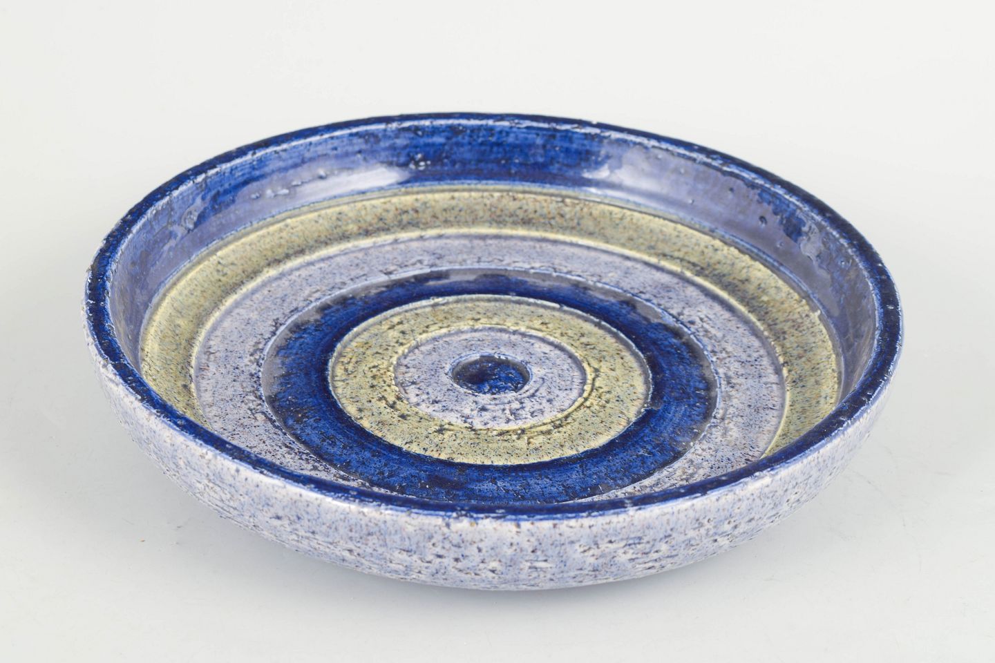 Aldo Londi for Bitossi, dish.Handmade circular ceramic dish with concentric rings and characteristic glaze in blue, cream and sandy tones. Produced in the 1970s in Bitossi’s distinctive artistic style.