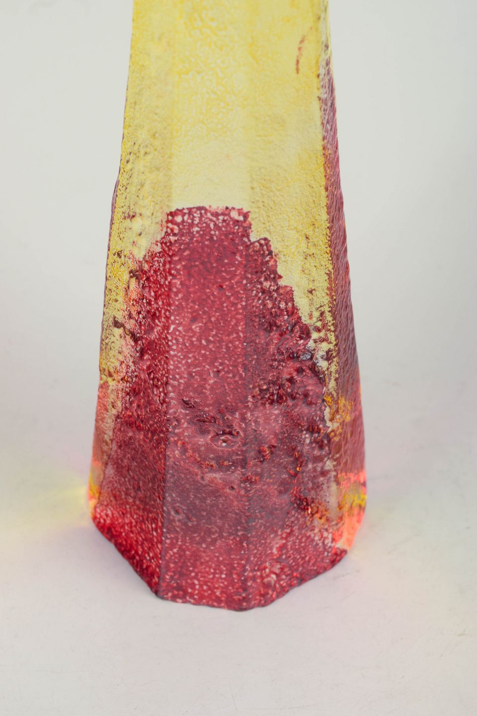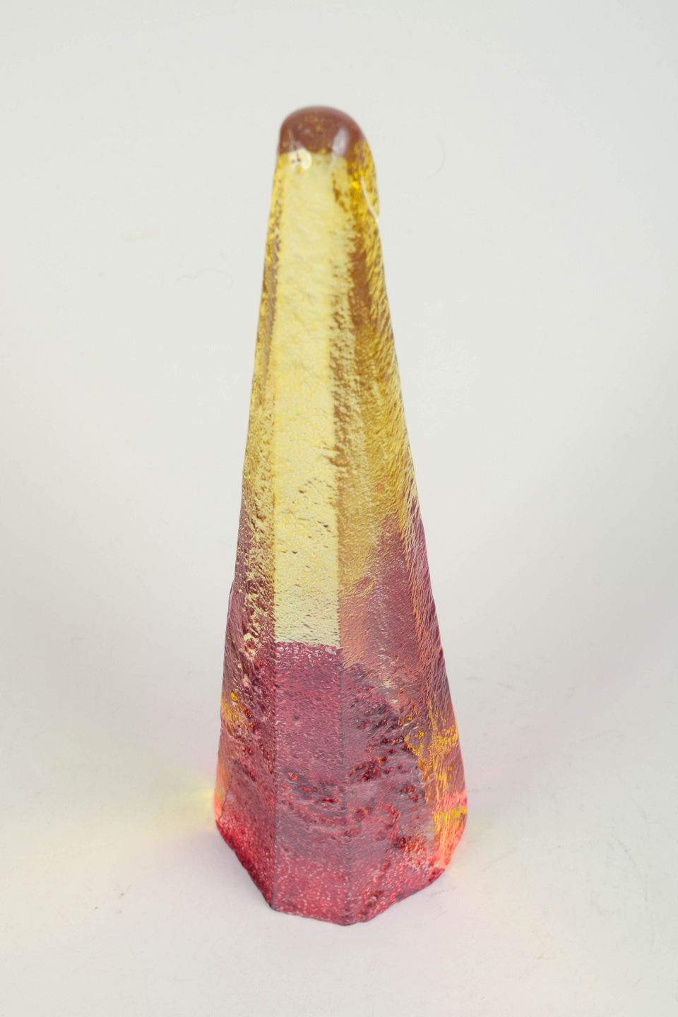 Björn Hultqvist for Bergdala, unique art glass object.Tall conical sculptural form in mouth-blown glass with encased colours in yellow, red and clear tones. Signed Bergdala B. Hultqvist.