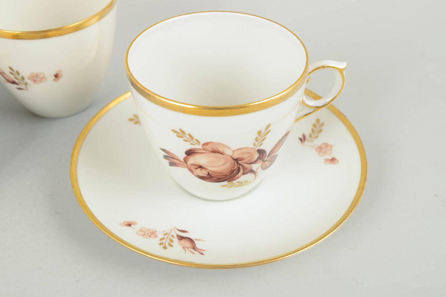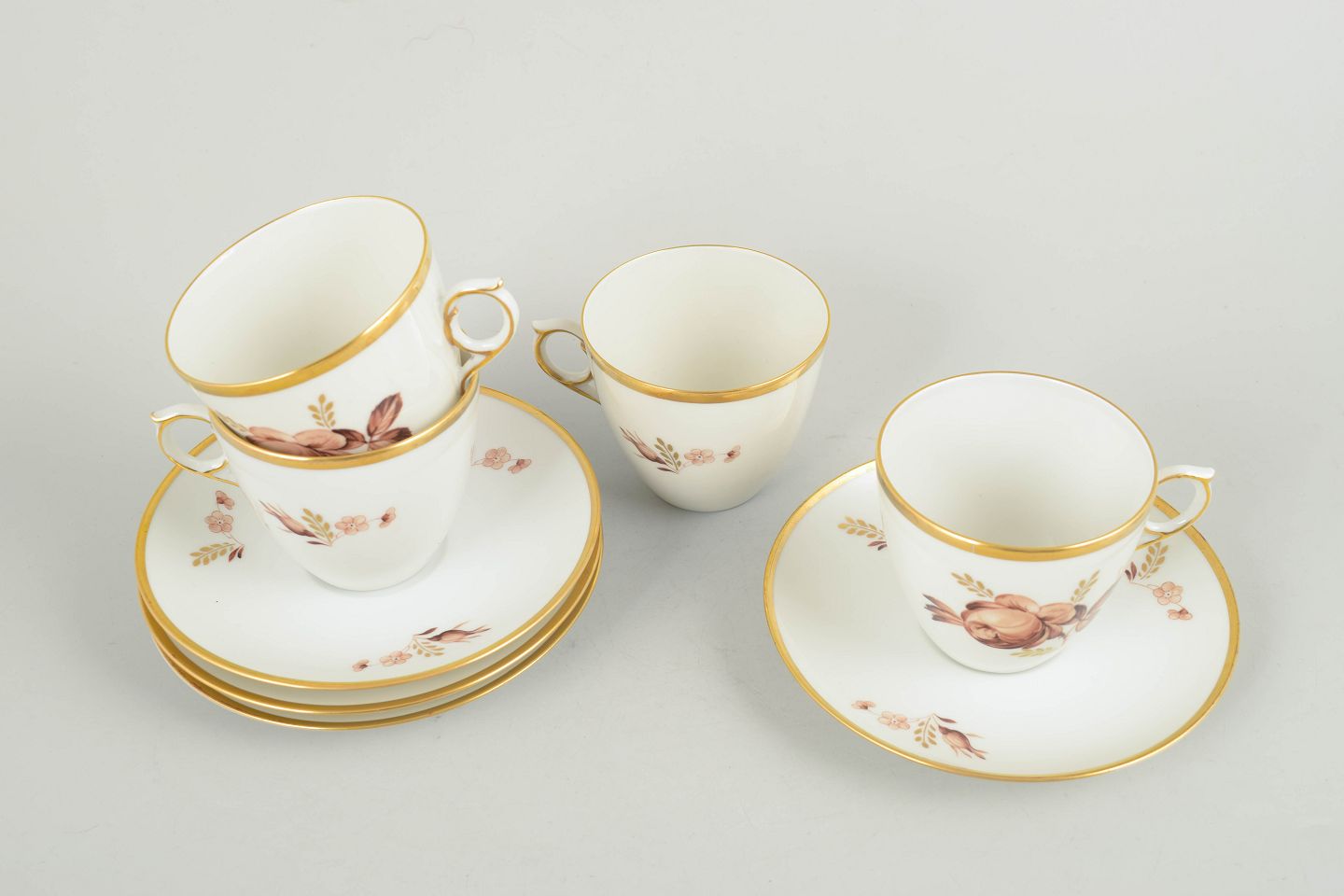 Royal Copenhagen brown rose, set of four coffee cups with saucers.Coffee cups with matching saucers in white porcelain with brown floral decoration and gilded rim, model 688/9069, from the 1970s, first factory quality.