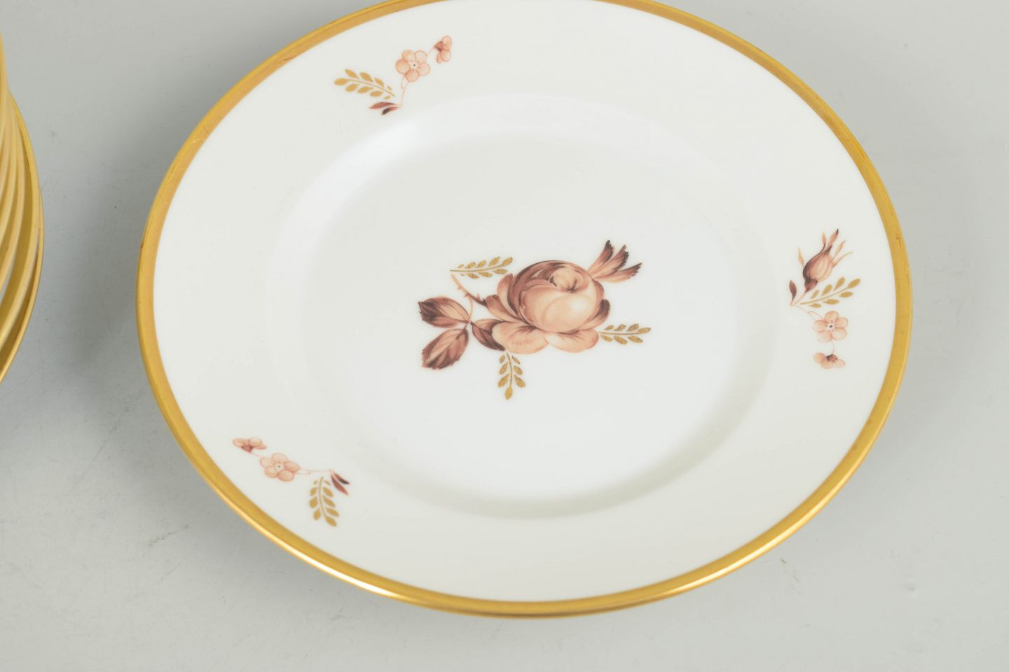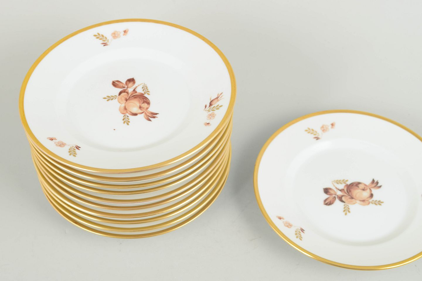 Royal Copenhagen brown rose, set of eleven plates.Decorative porcelain plates in white porcelain with brown floral decoration and gilded rim, model 688/9633, from the 1970s, first factory quality.