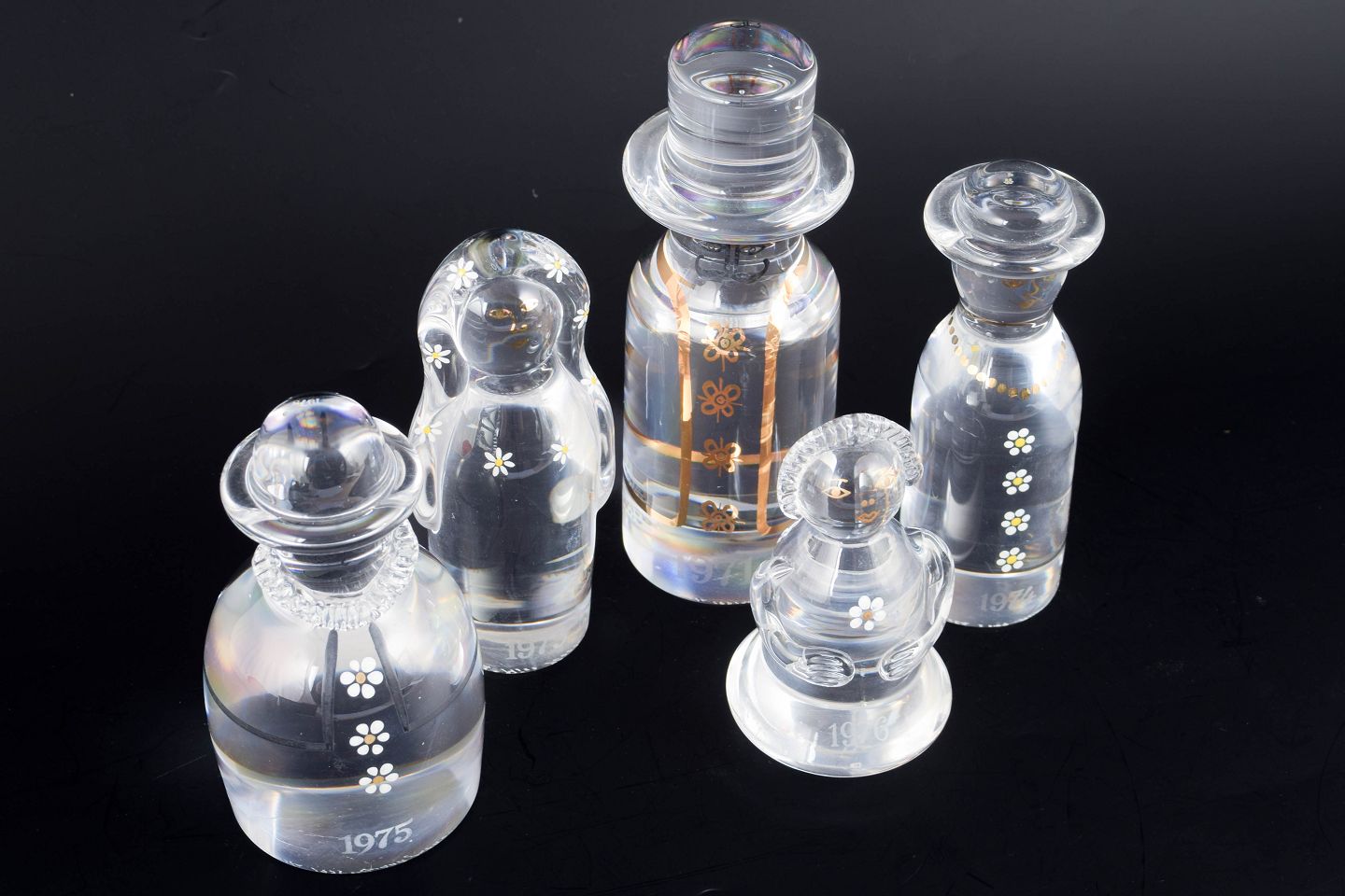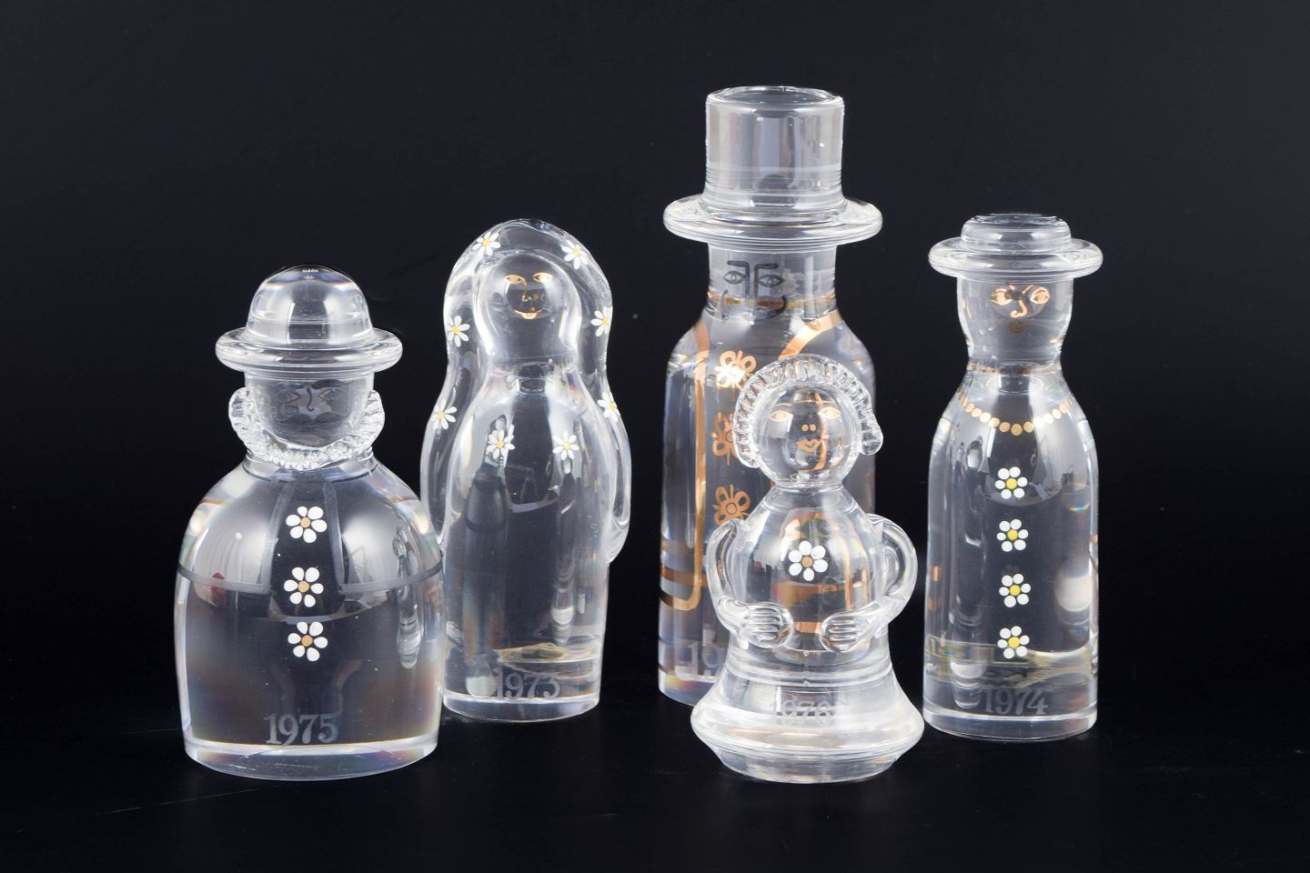 Kosta Boda, set of five “Family” glass figures.Handmade art glass figures in clear glass with simple, stylised forms and decorative white and gilt floral motifs, representing a family group.