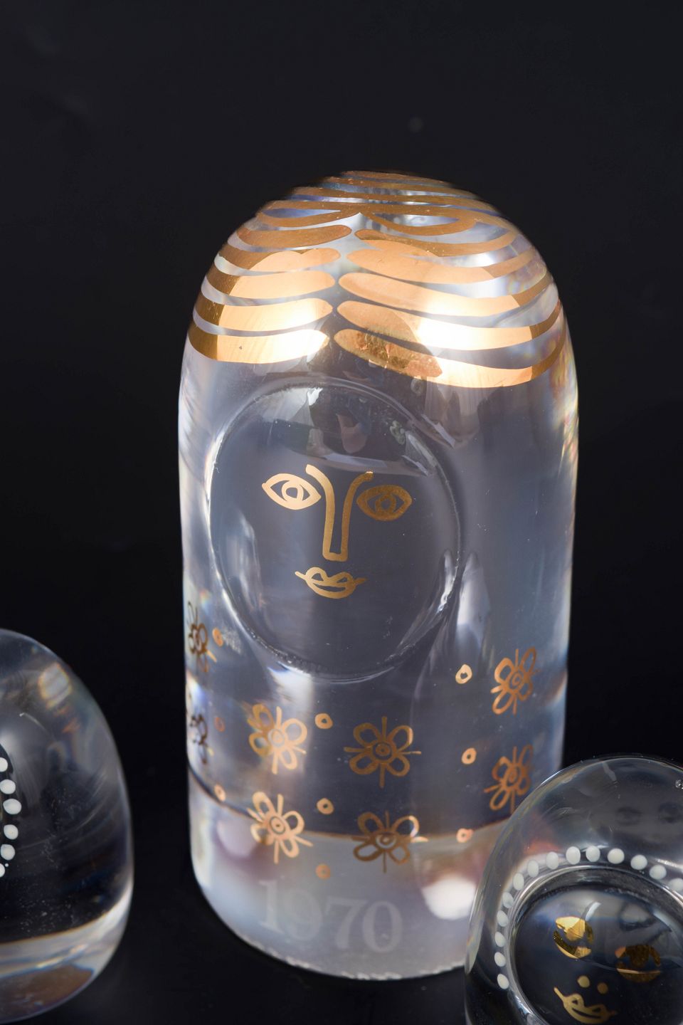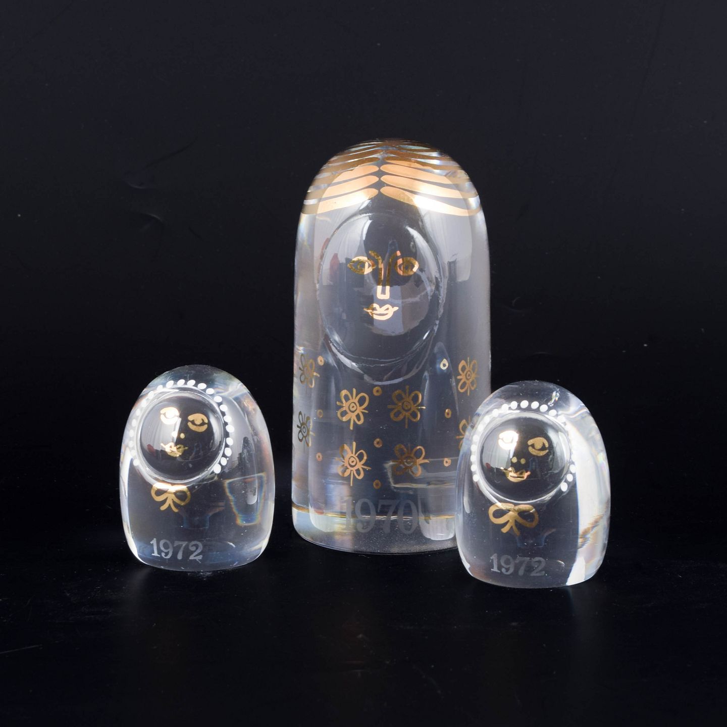 Kosta Boda, set of three “Family” glass figures.Handmade art glass figures in clear glass with stylised faces and decorative white and gilt floral motifs, formed as a smaller family group.