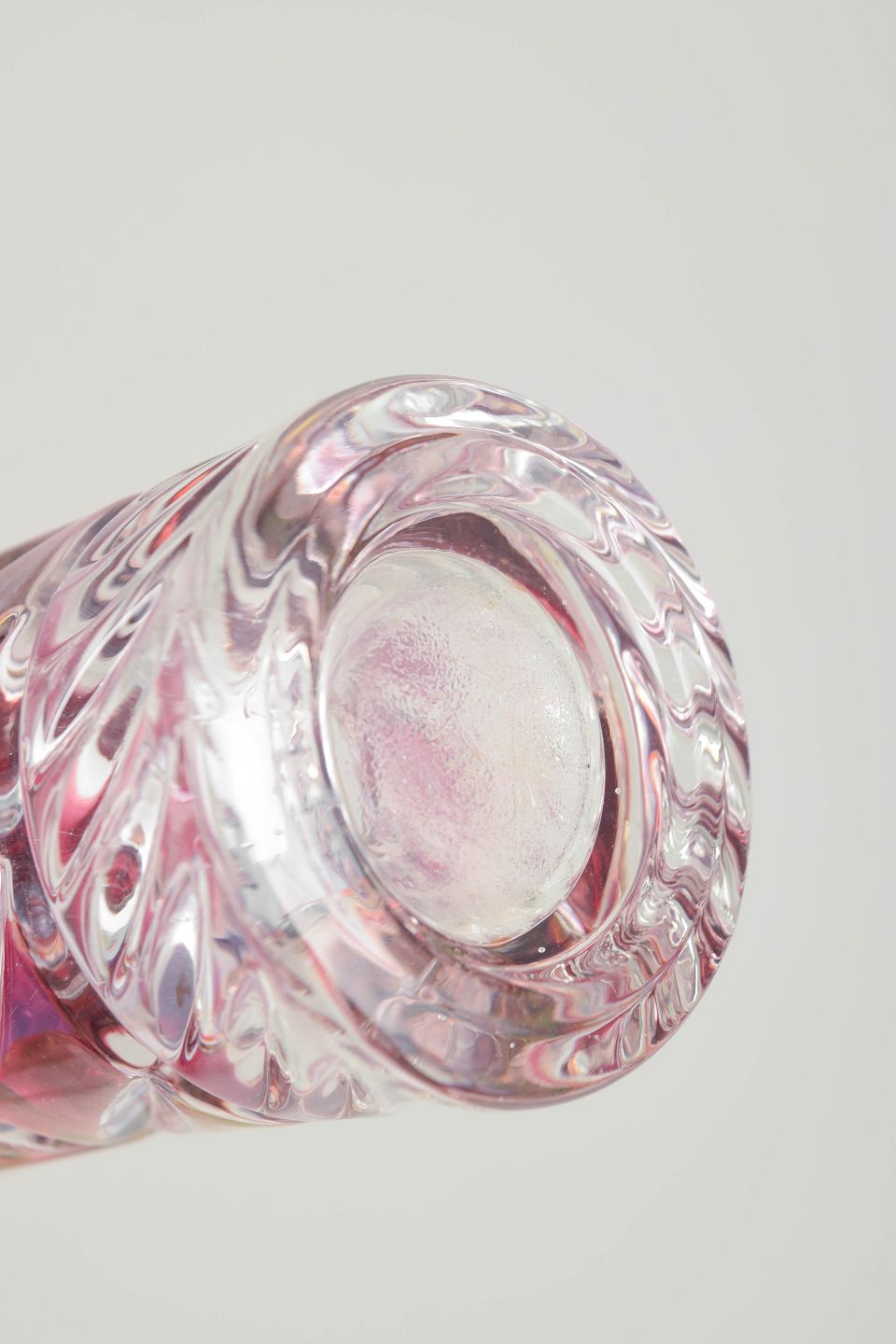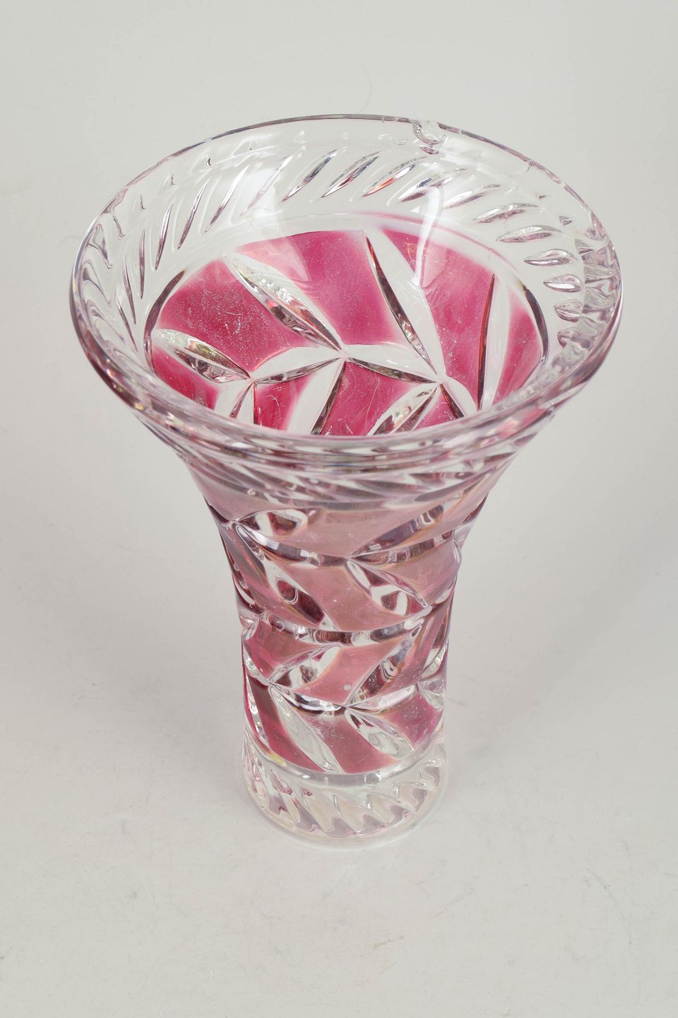 Bohemian crystal glass, vase.Pressed and cut crystal in clear and pink tinted glass with spiral and geometric cut decoration.
