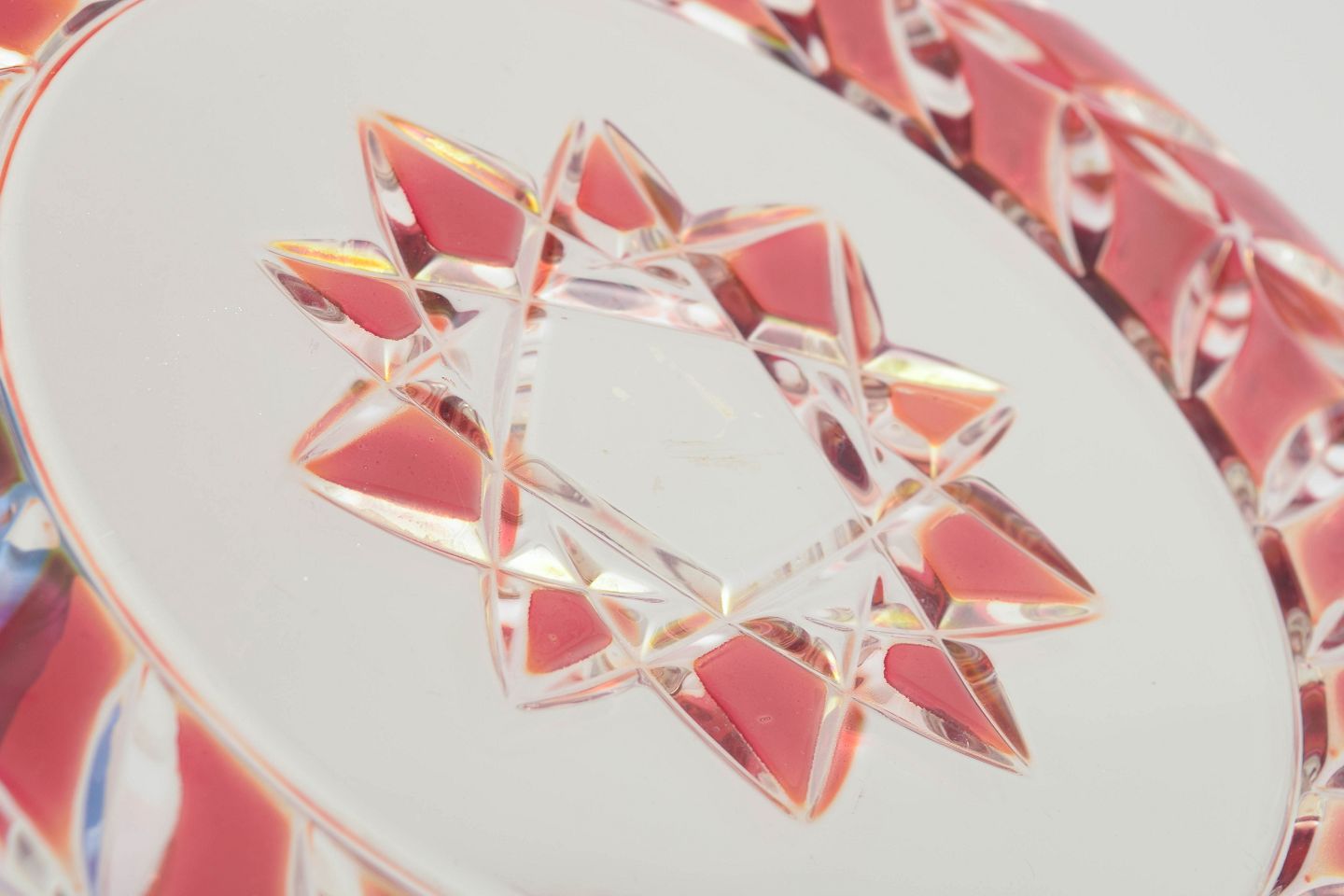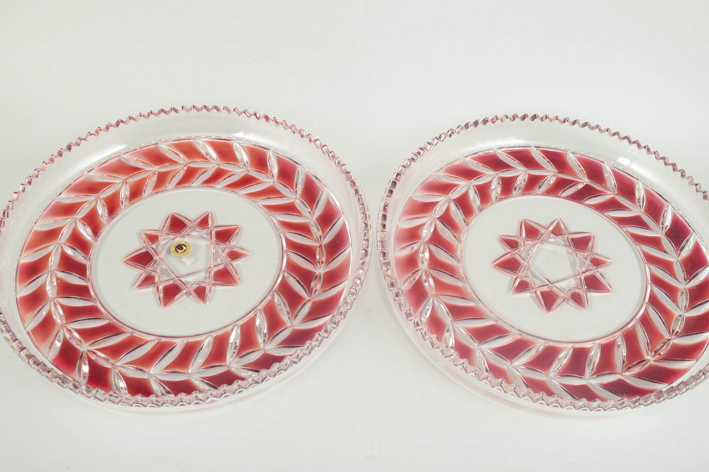 Bohemian crystal glass, pair of large dishes.Pressed and cut crystal dishes in clear and pink tinted glass with geometric star pattern and faceted edges.