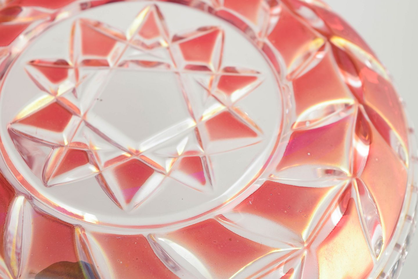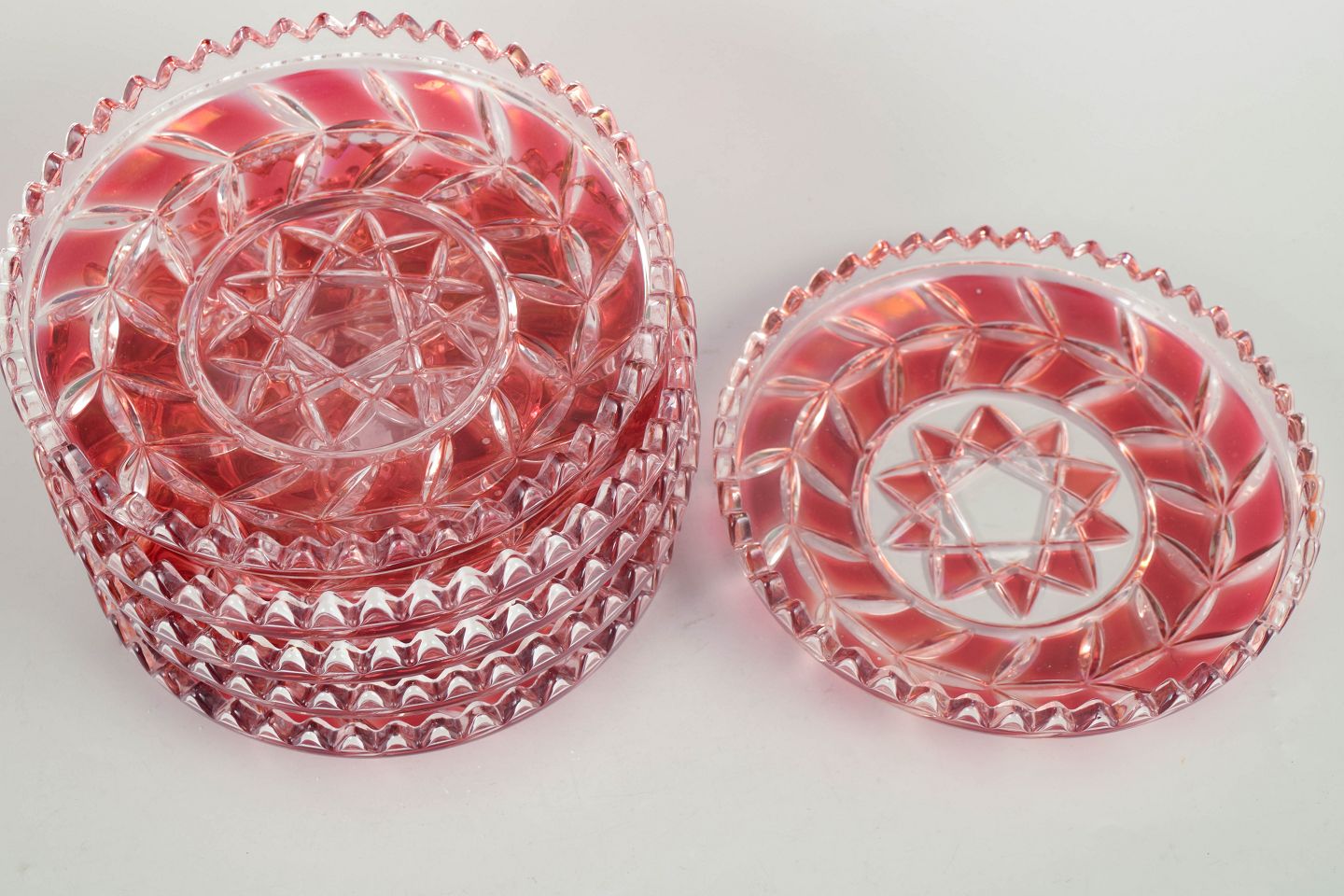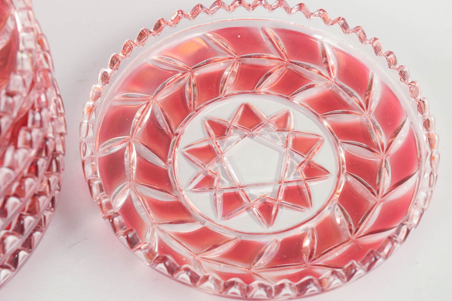 Pressed and cut crystal plates in clear and pink tinted glass with geometric star pattern and faceted edges.