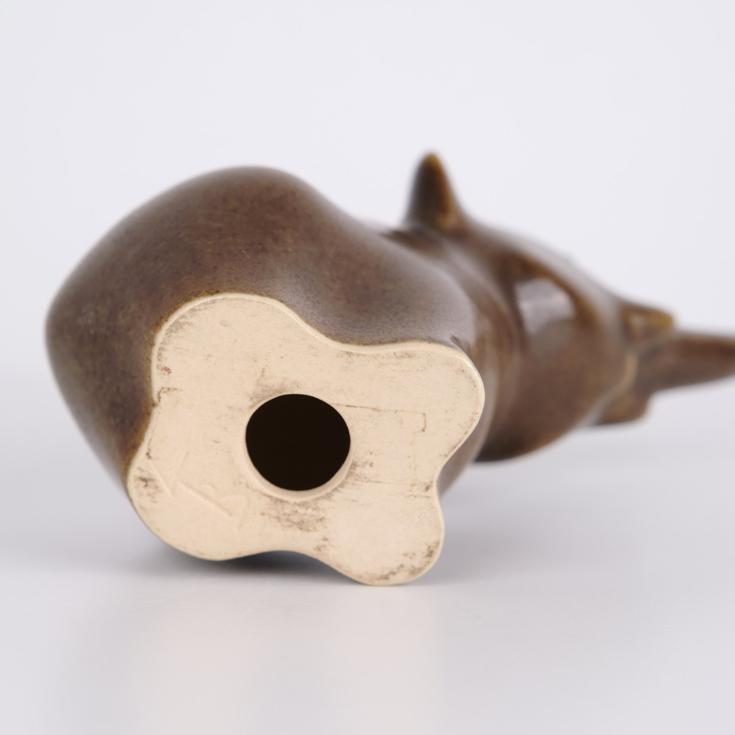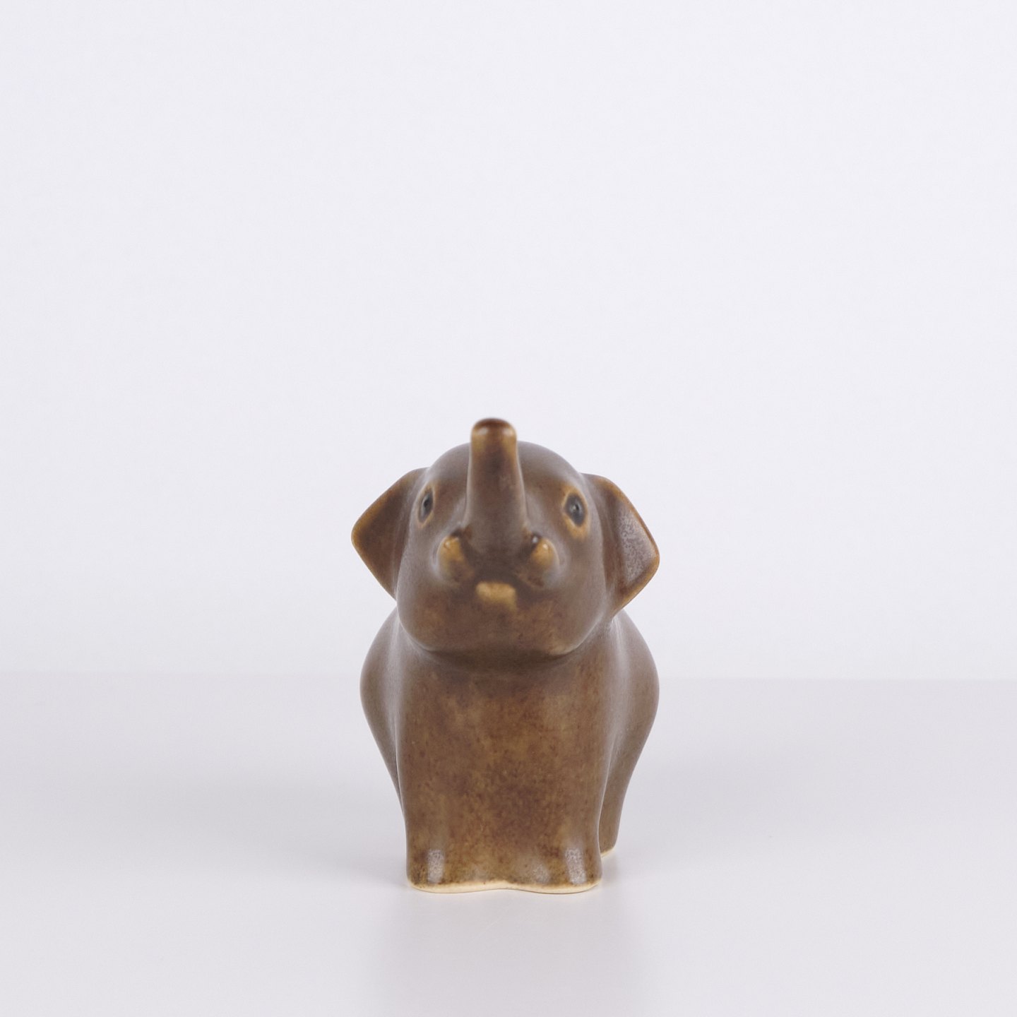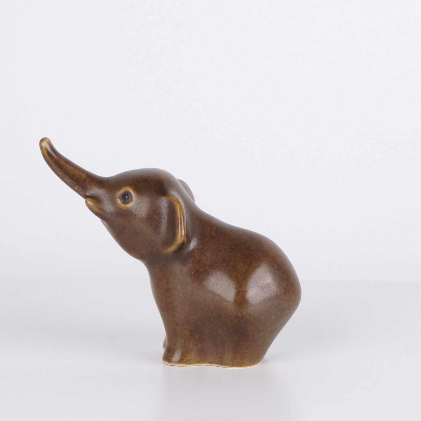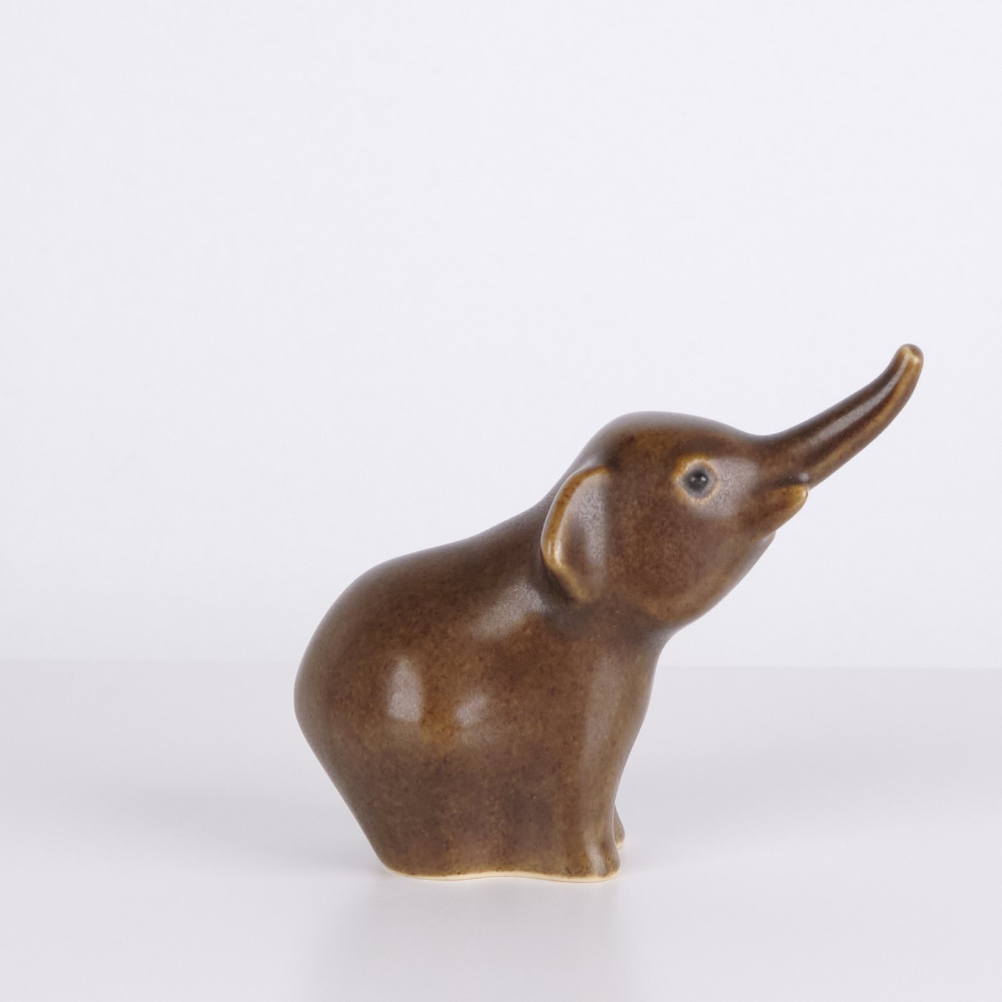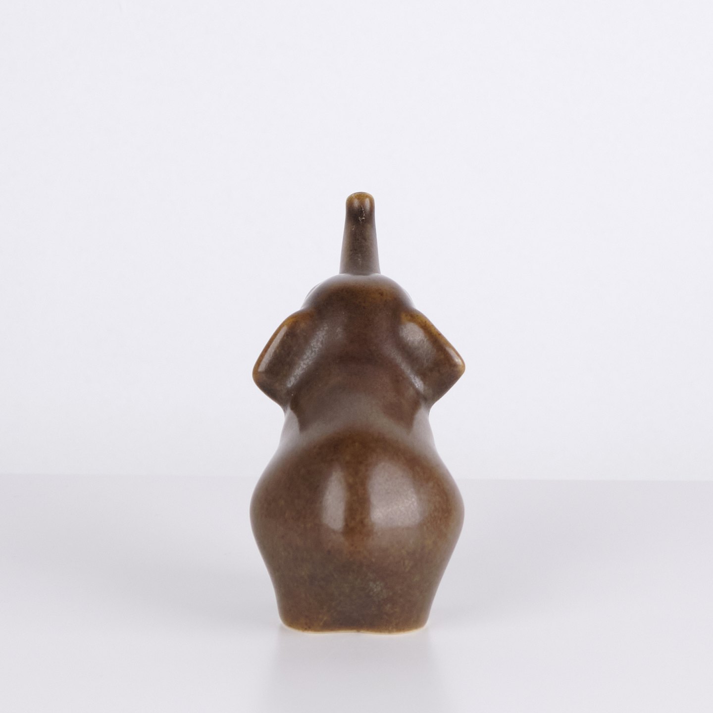 Elephant figure by Knud Basse made in brown glazed ceramic. The figure is modeled with raised trunk and rounded forms, creating a lively and decorative expression. A classic example of Danish animal ceramics, where simple lines and characterful motifs are central. Sought-after figure among collectors of Knud Basse and Danish ceramics.— Origin: Denmark