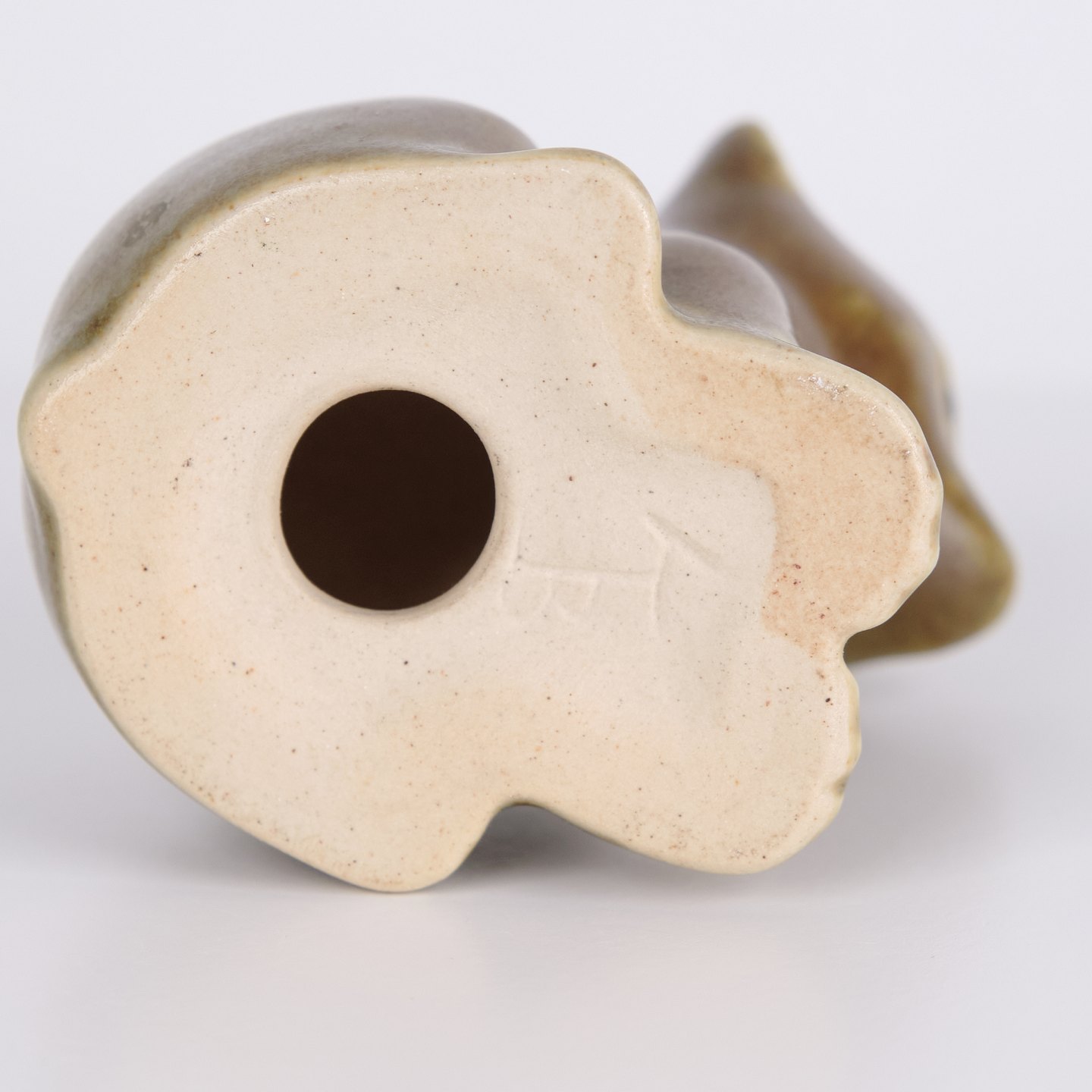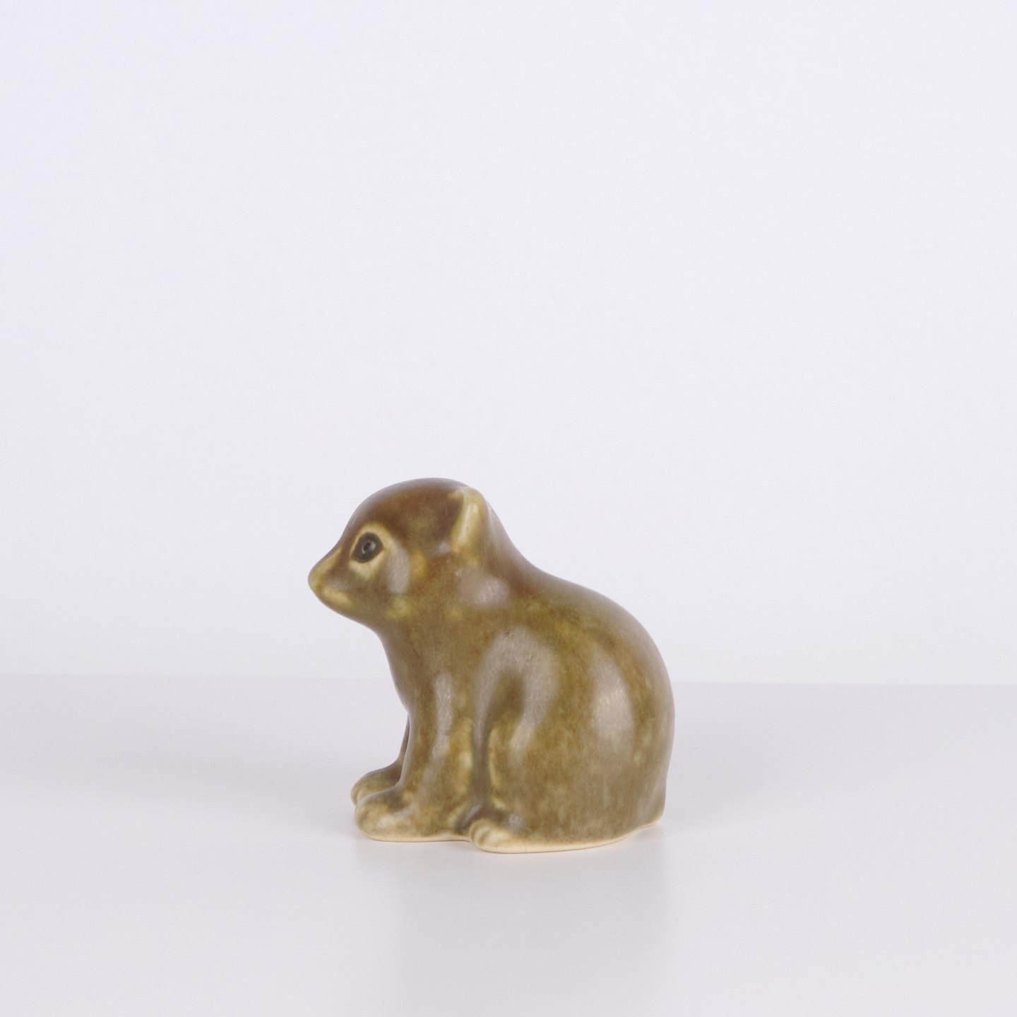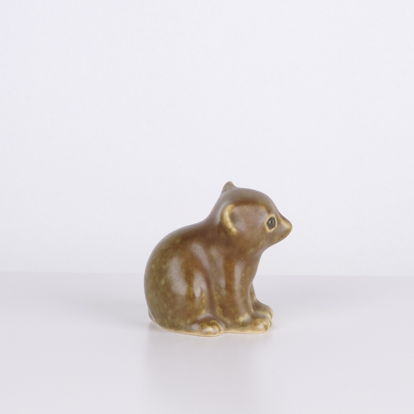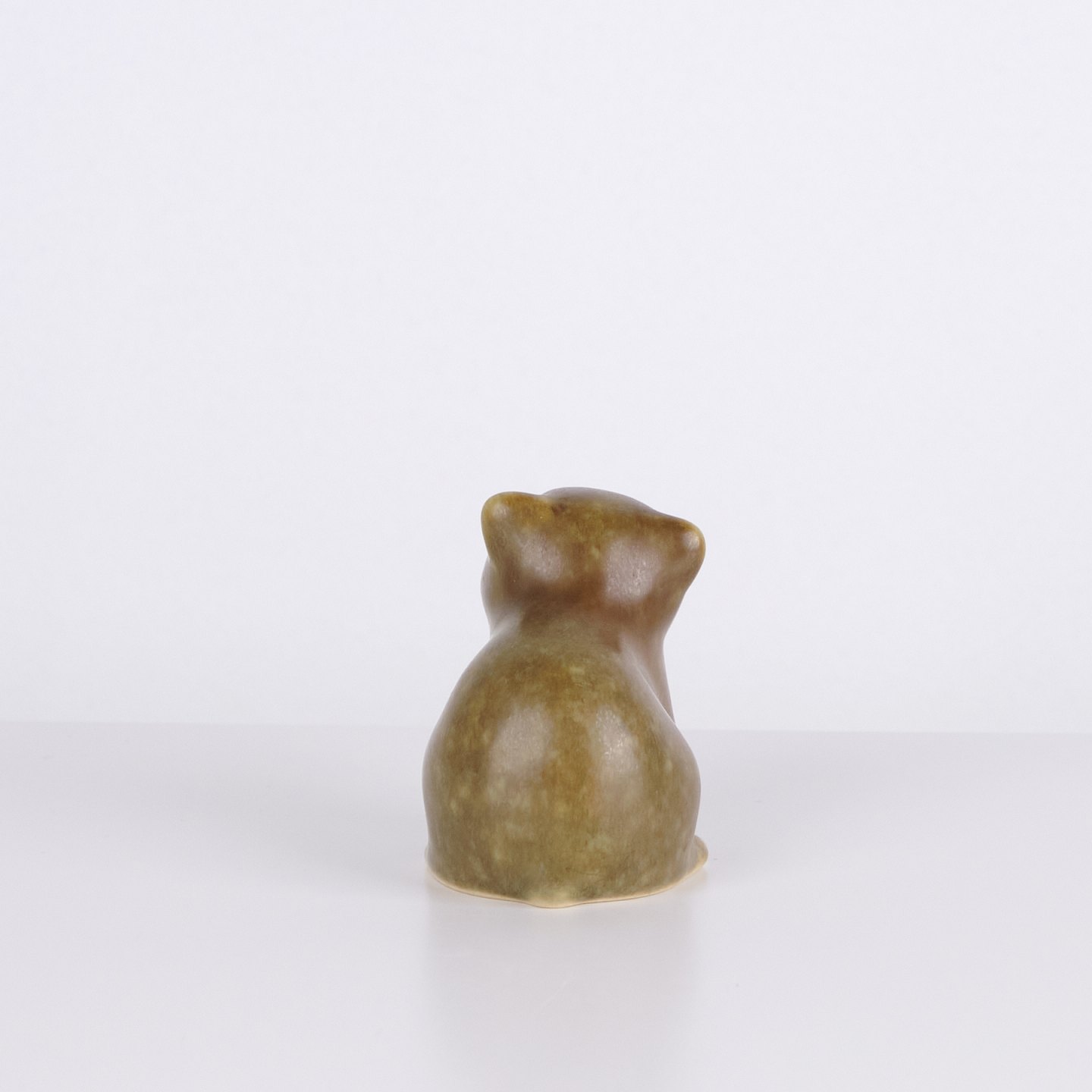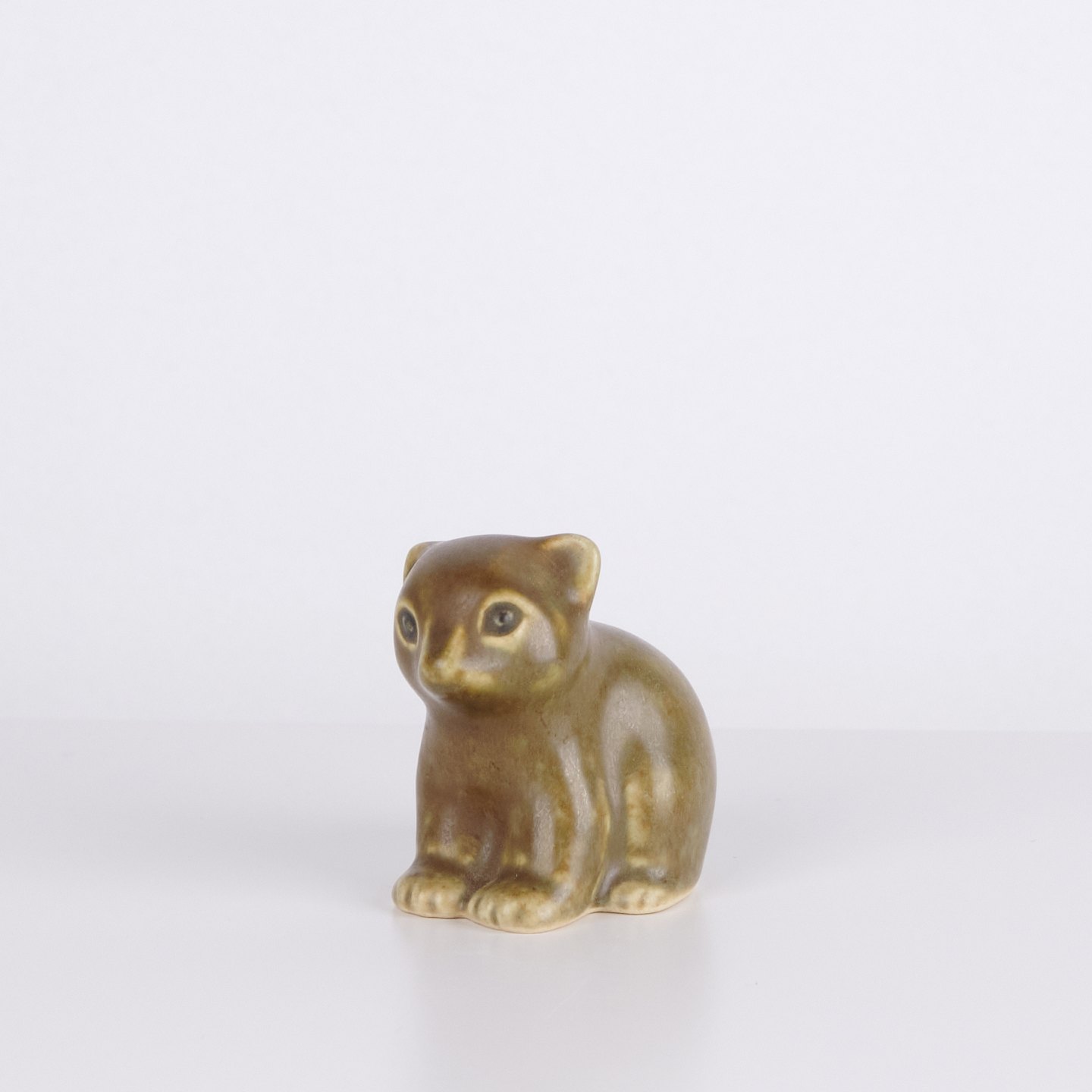 Cat figure by Knud Basse made in brown glazed ceramic. The model shows a seated cat with accentuated eyes and rounded body form.— Origin: Denmark
