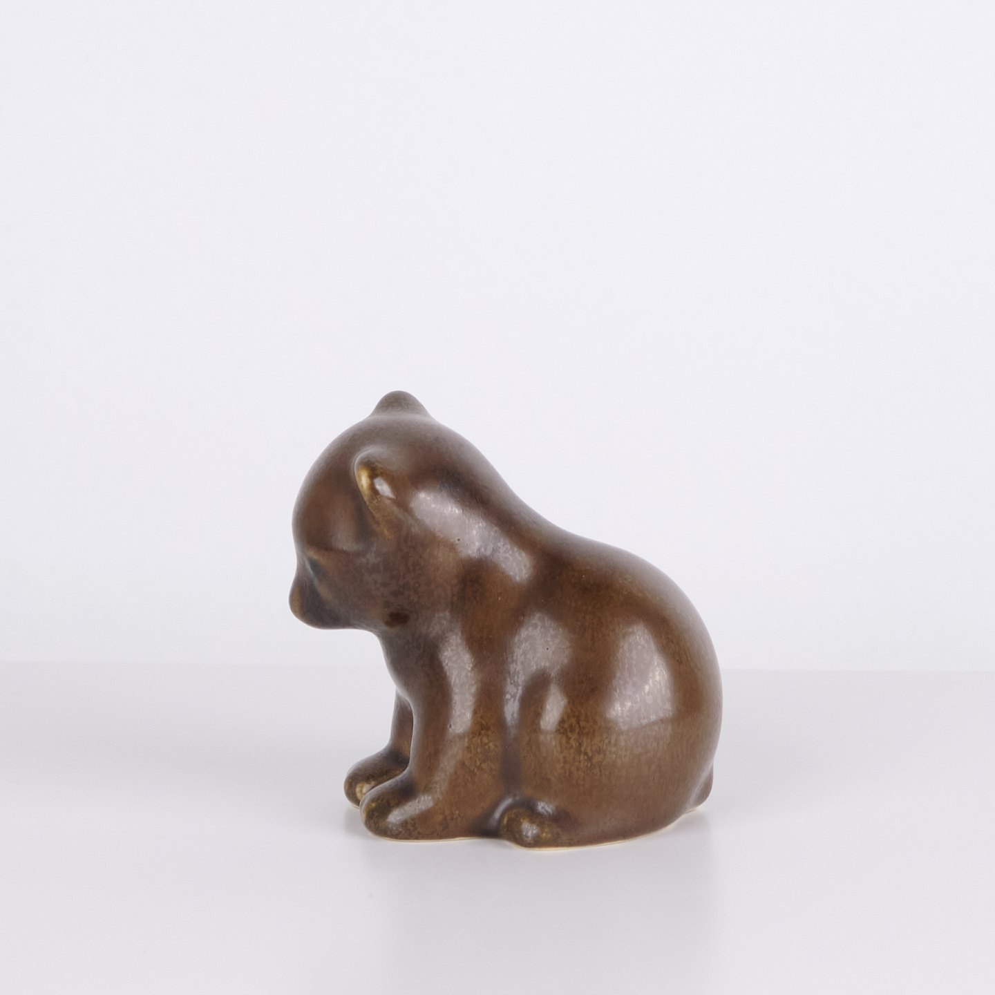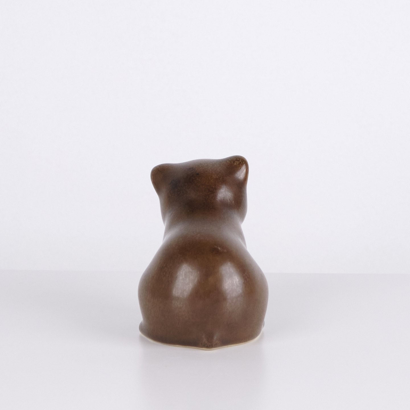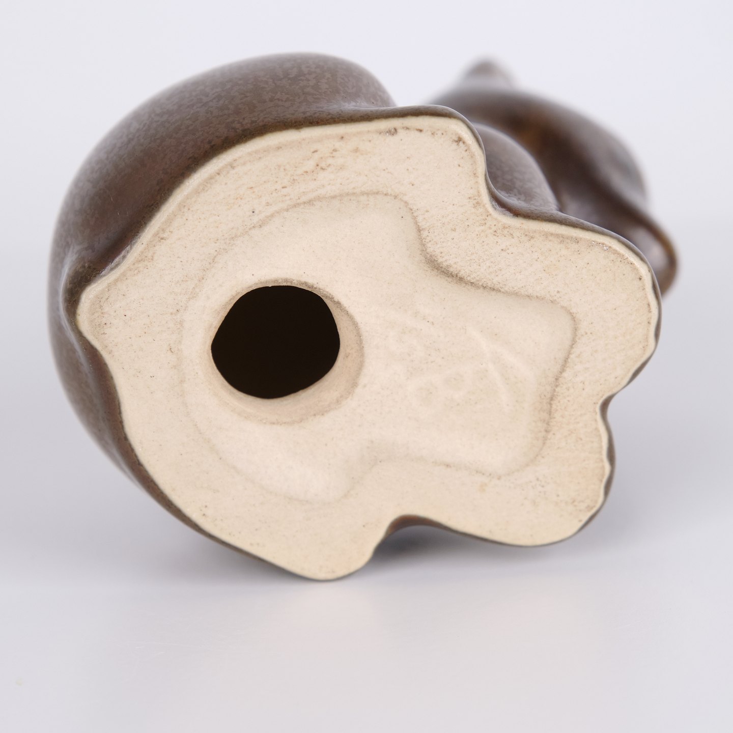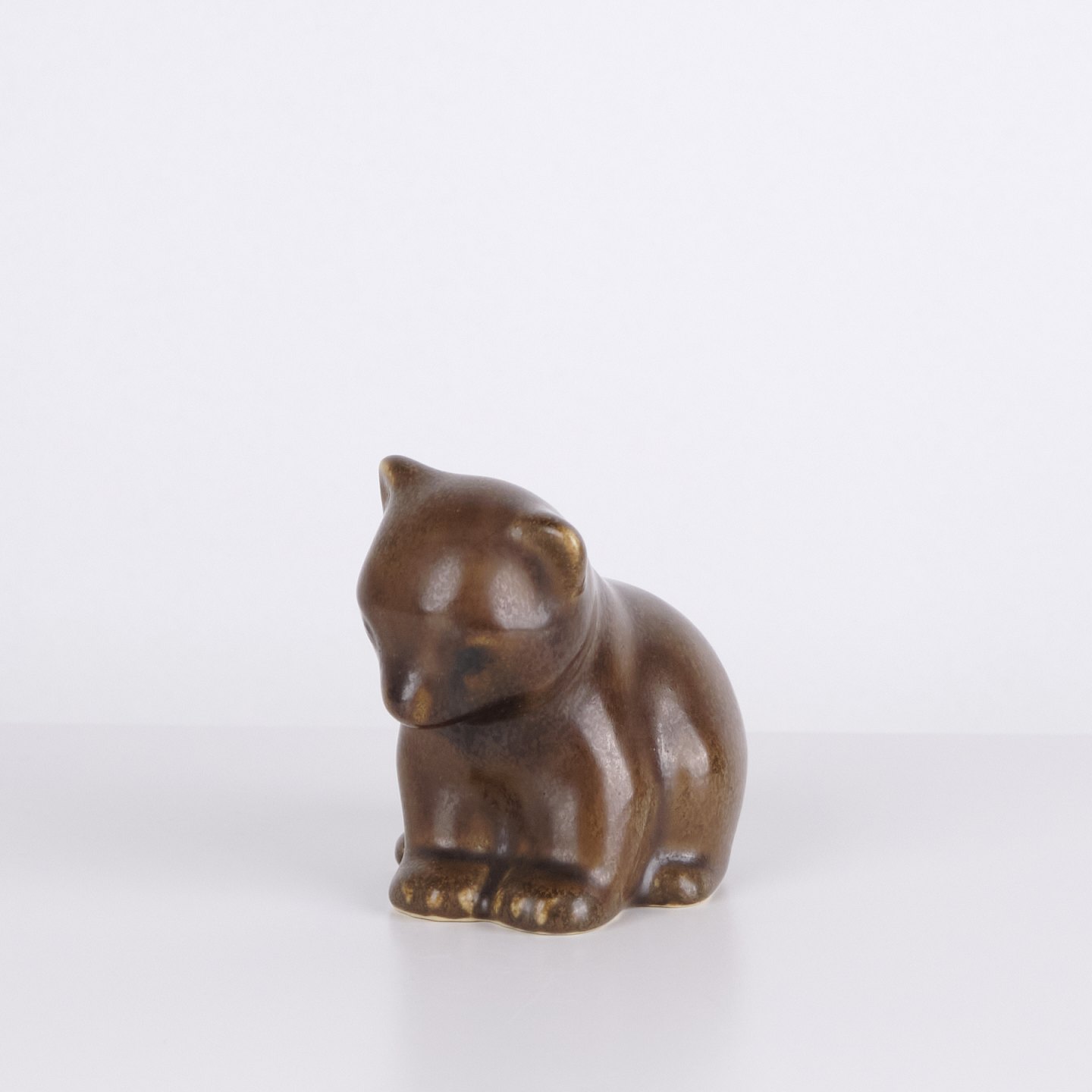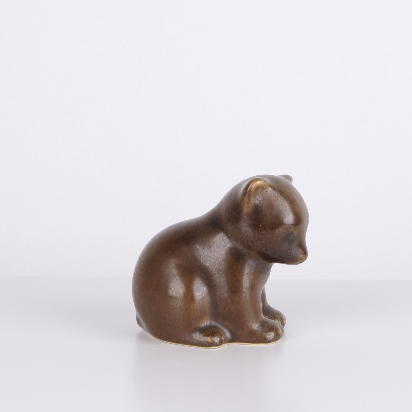 Bear figure by Knud Basse made in brown glazed ceramic. The figure is modeled in a seated form with slightly bent head and rounded lines, creating a calm and characteristic expression. A fine example of Knud Basse’s popular animal figures and Danish art pottery from the mid-century period.— Origin: Denmark