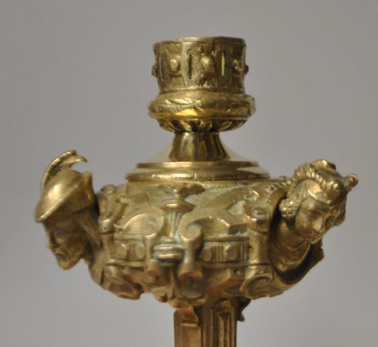Pair of French bronze candlesticks, 19th century. With decorations in the form of faces. On three legs. H.: 17 cm.Item number: 29164