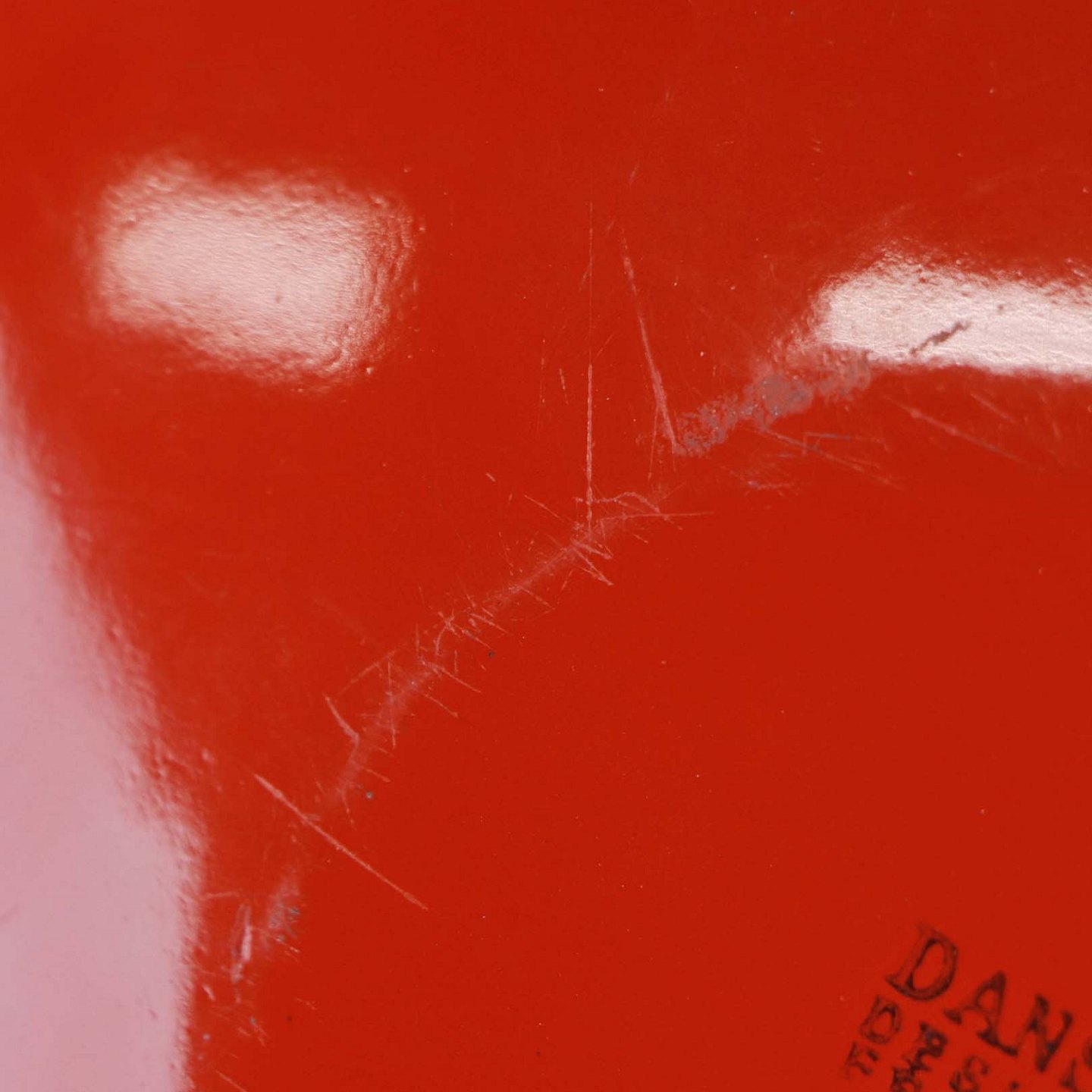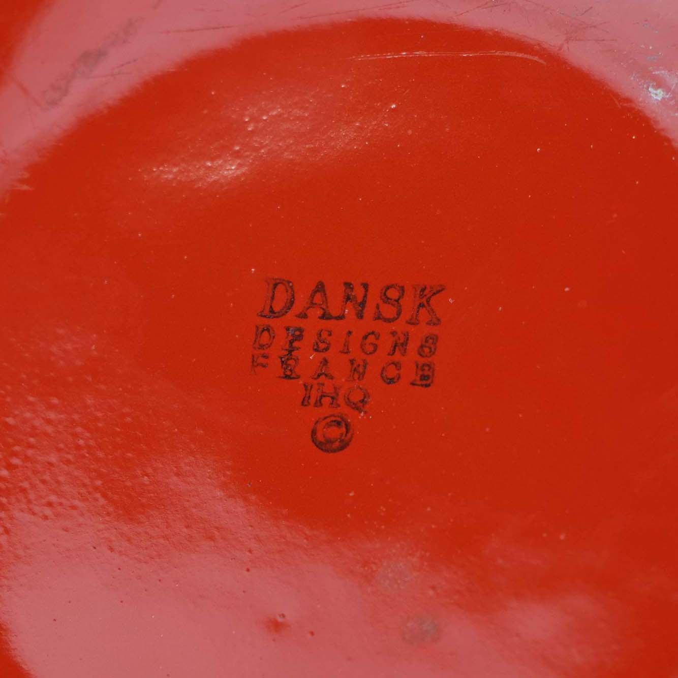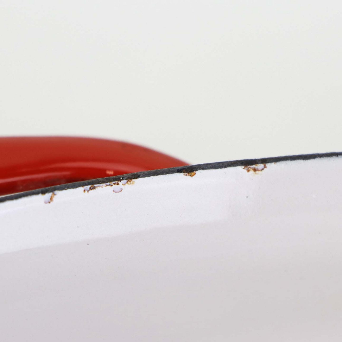 Kasserolle med låg fra serien Kobenstyle fremstillet i metal og belagt i rød og hvid emalje. Model FranceFormgiver Jens Harald Quistgaard