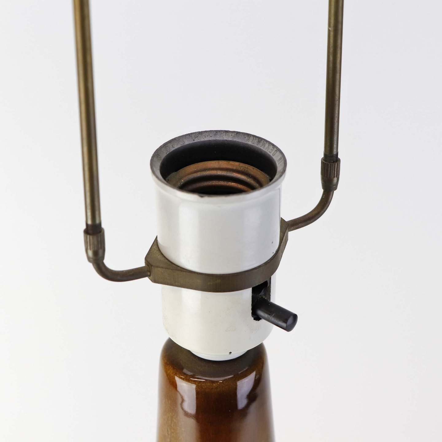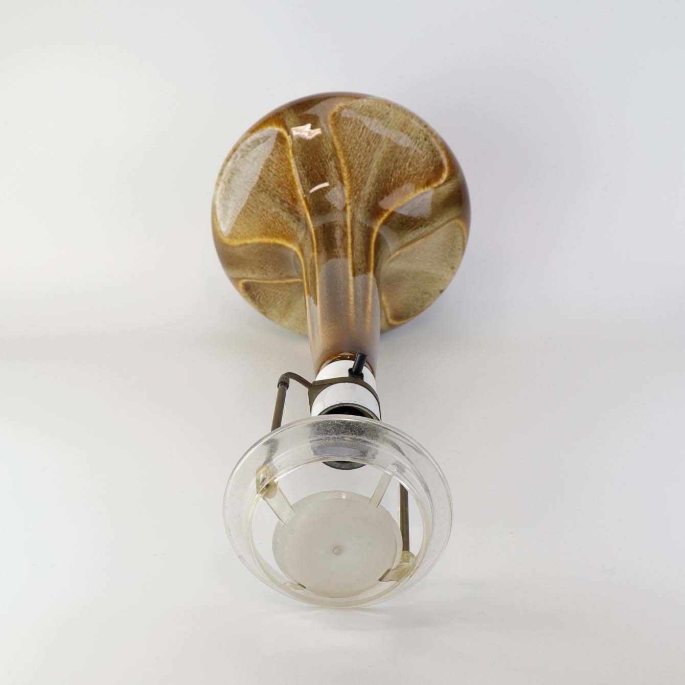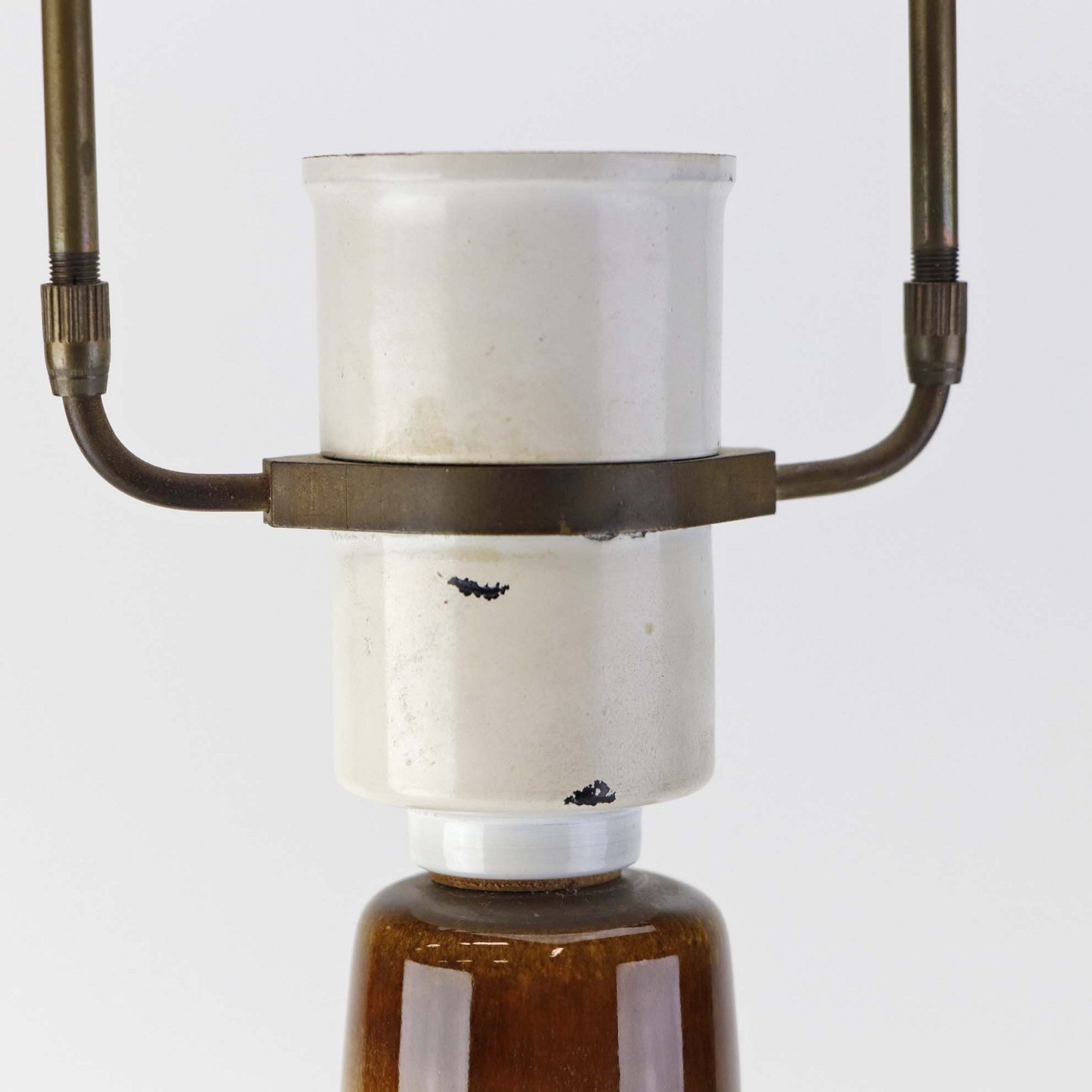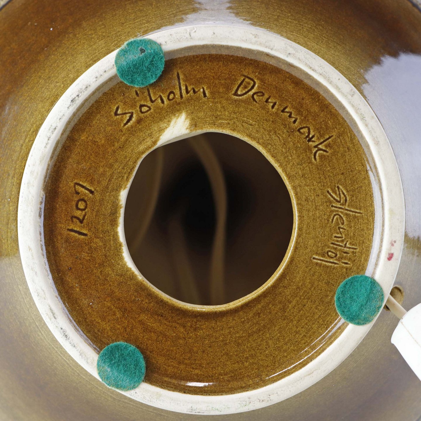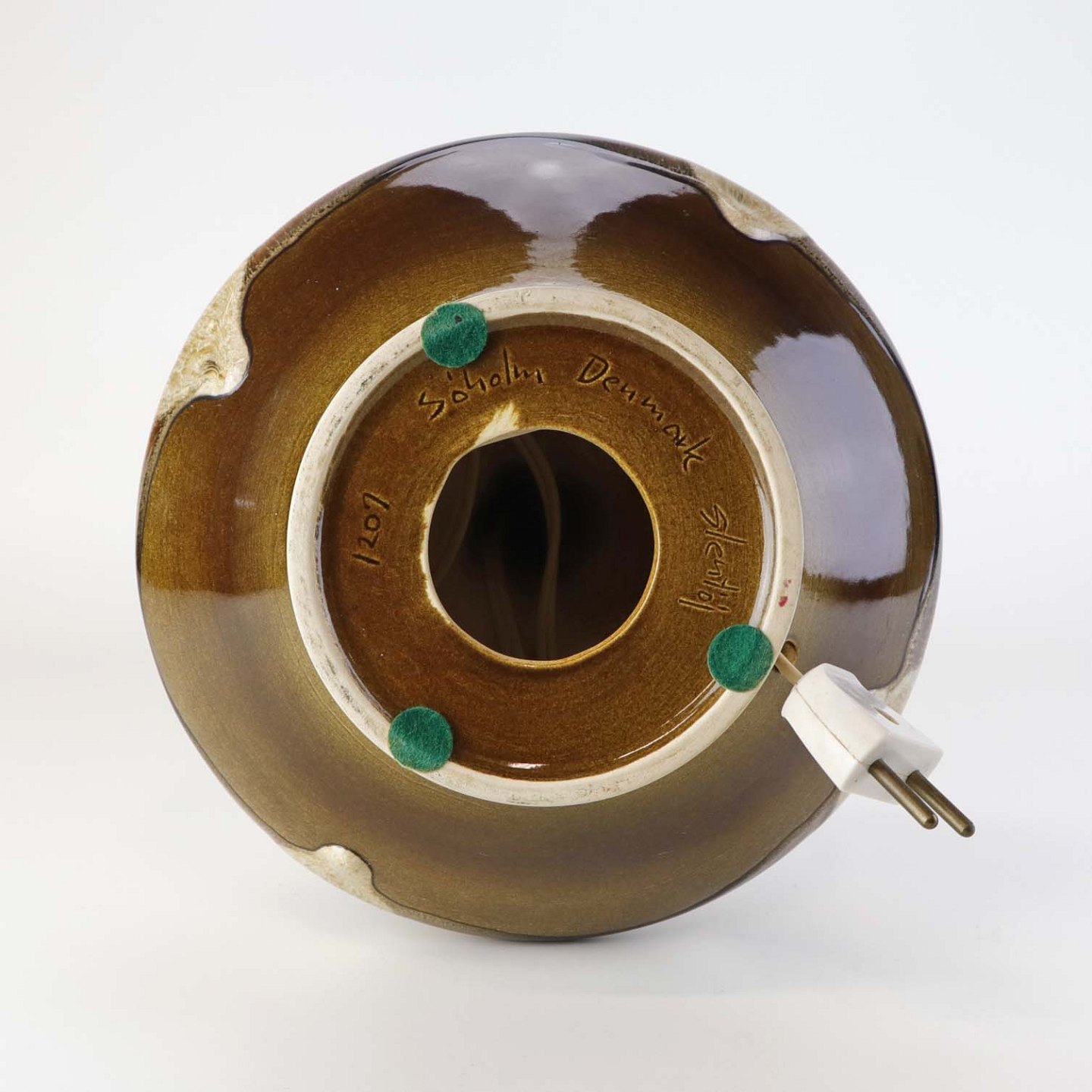 Lampefod i stentøj med harepelslignende glasur i brunlige nuancer. Ledningen ligger indeni foden. Nr. 1207Producent Søholm, Denmark