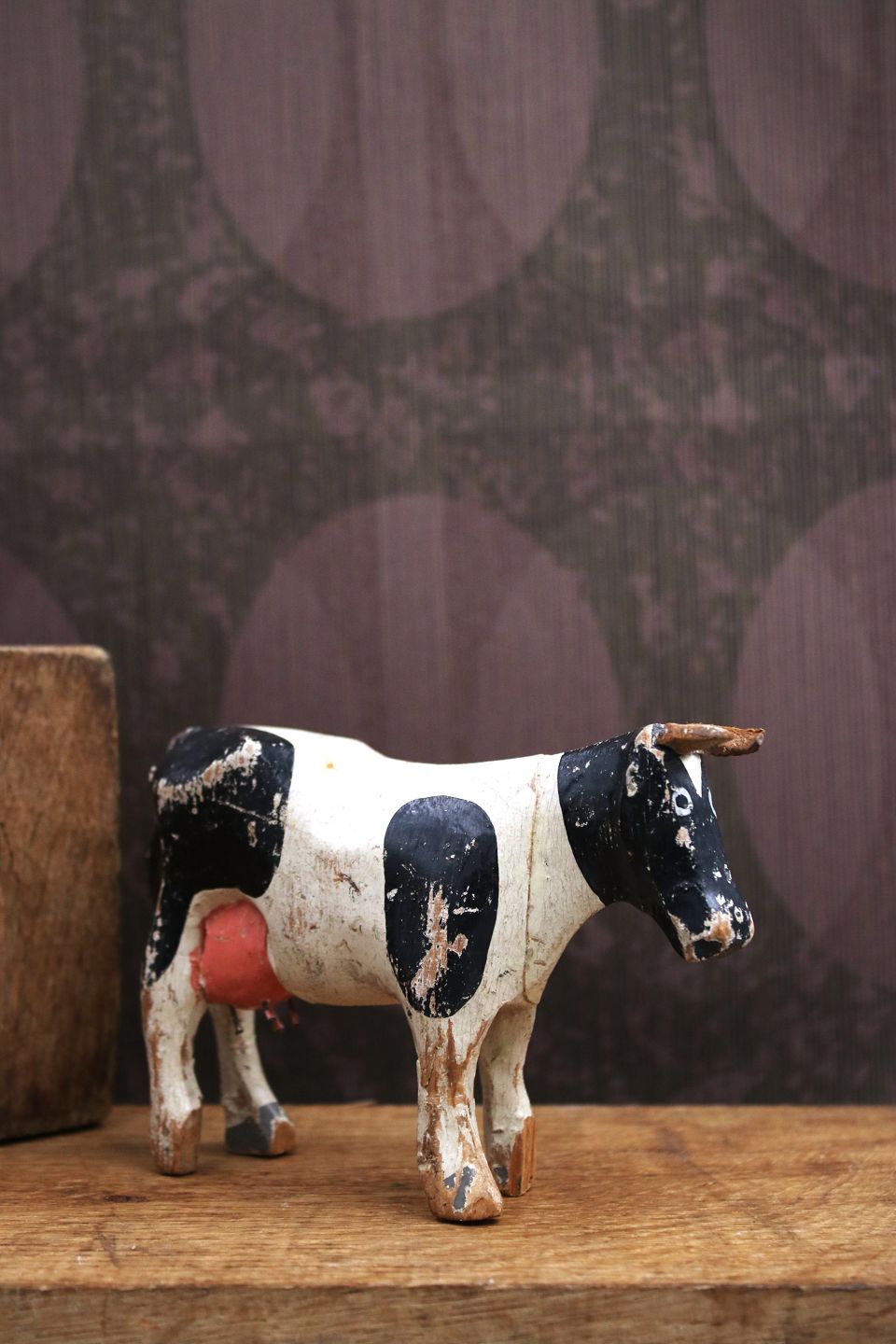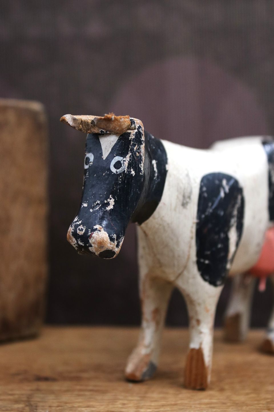 Decorative, old dairy cow in carved wood with fine original painting, horns and tail in leather. H: 9cm. L: 13.5cm. Dealer