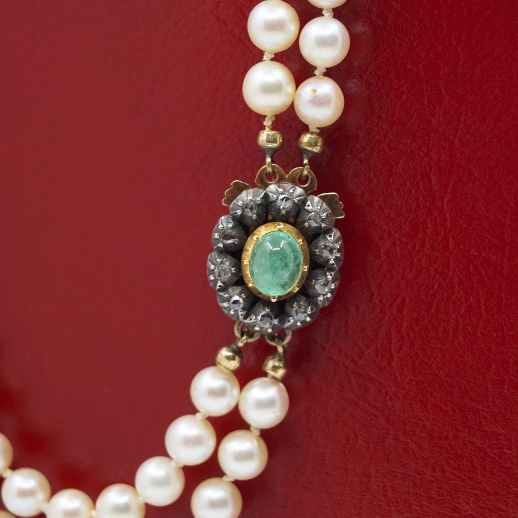 A double pearl necklace, with clasp of 14k white gold and gold, adorned with diamonds and an emerald.Length of the chain 43 cm.