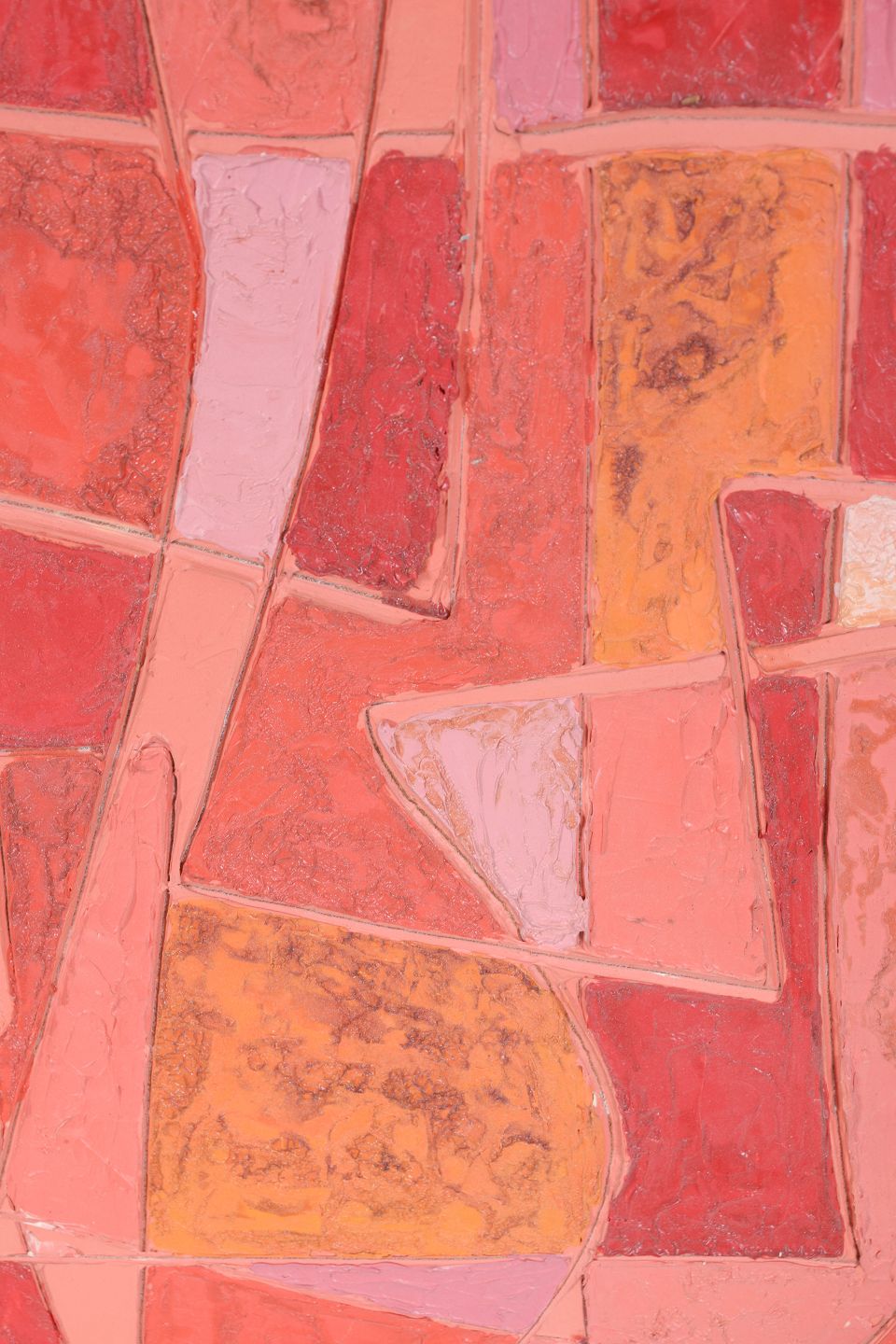 Vita Thymann, oil on board, listed Danish artist.Abstract expressionist composition structured in a mosaic-like arrangement with warm red and pink tonalities, where segmented planes and rhythmic divisions create a dynamic and decorative visual field. Signed VT.