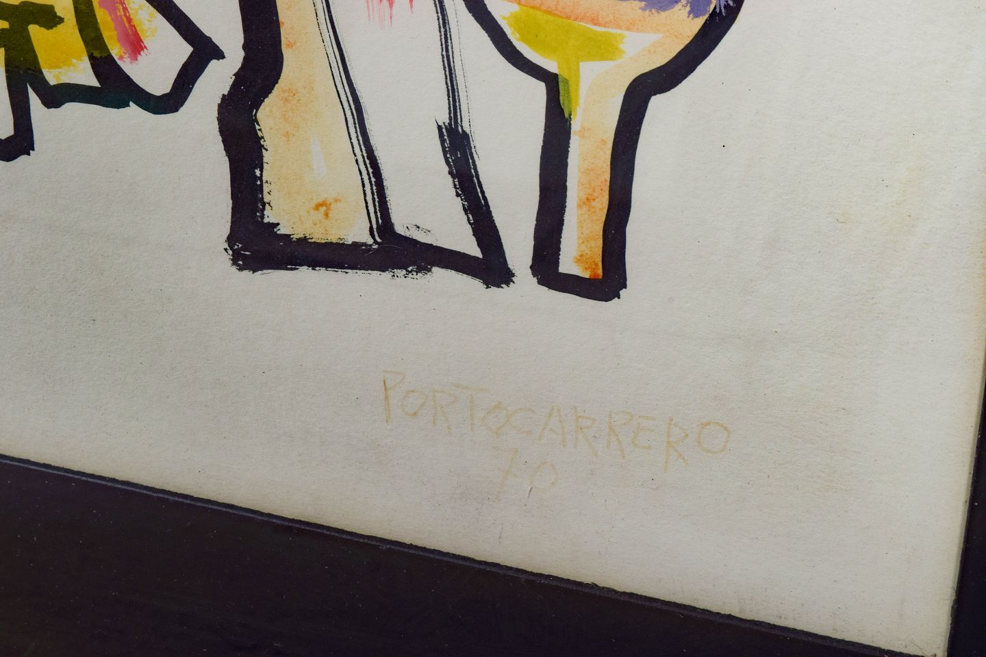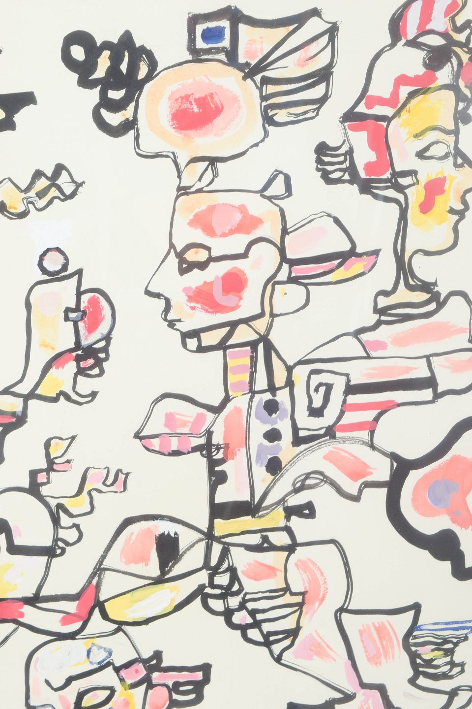 René Portocarrero — gouache on paper, listed Cuban visual artist.Complex figurative composition featuring stylized and fragmented human figures constructed in a decorative, almost mosaic-like visual language. The work is executed with a characteristic linear structure and fields of color in warm tones. Signed and dated 1970.