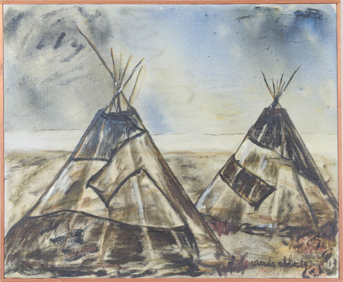 Ursula Ekberg, oil on canvas, listed Swedish visual artist.Modernist landscape motif from Lapland depicting Sámi tents in an expressive and slightly abstracted composition. Executed in subdued earthy tones with a free brushstroke, signed.