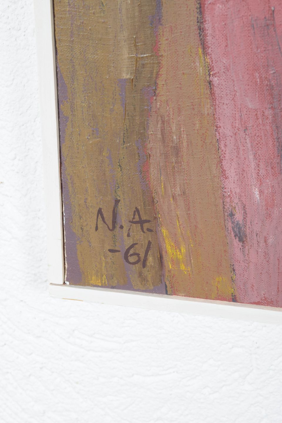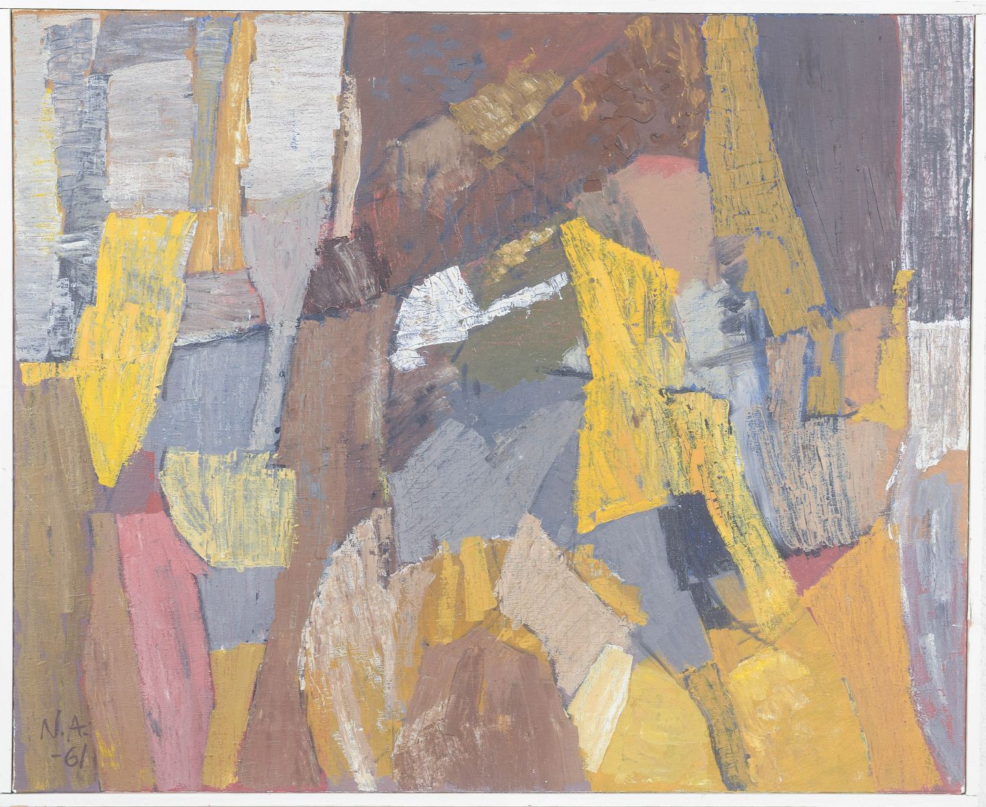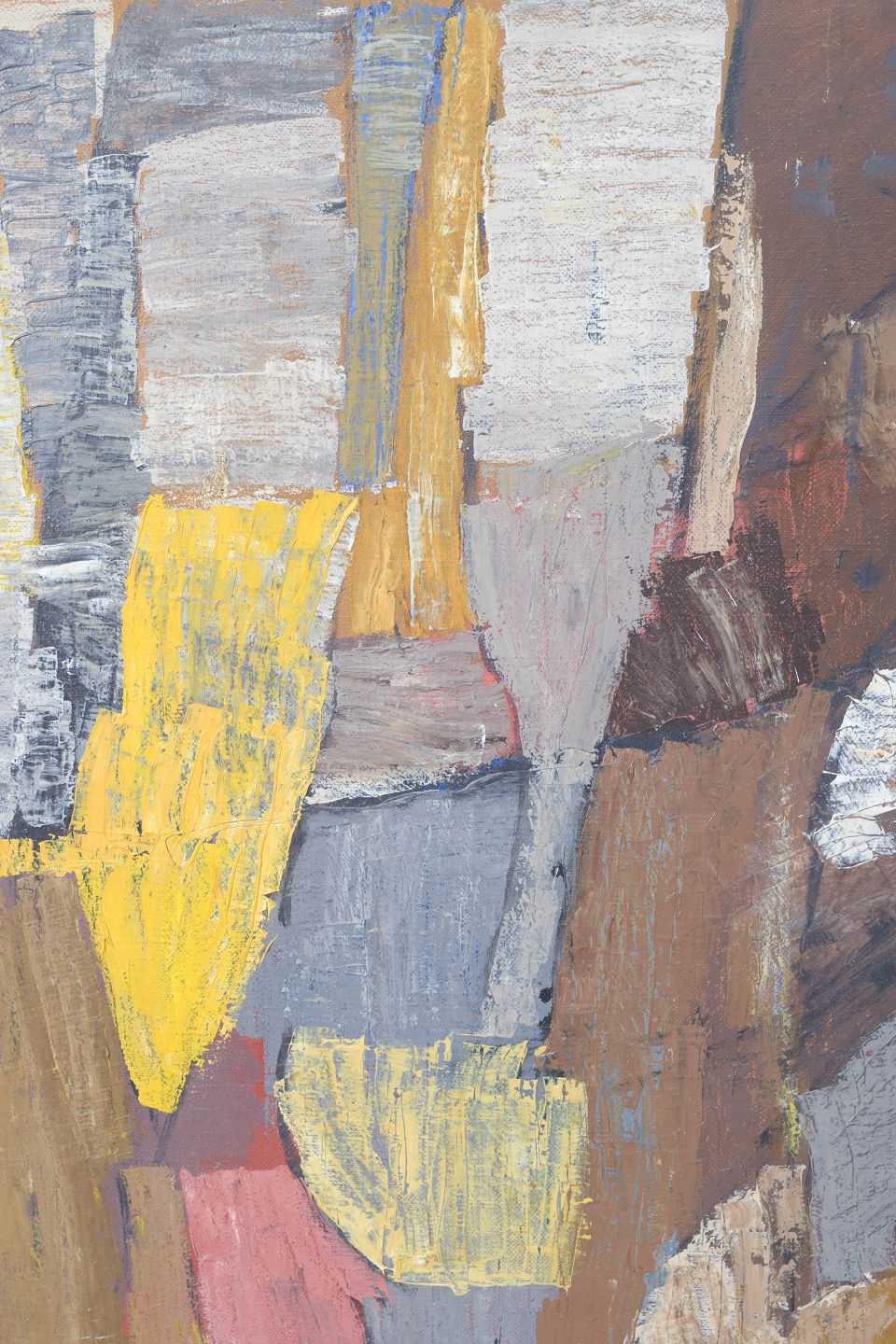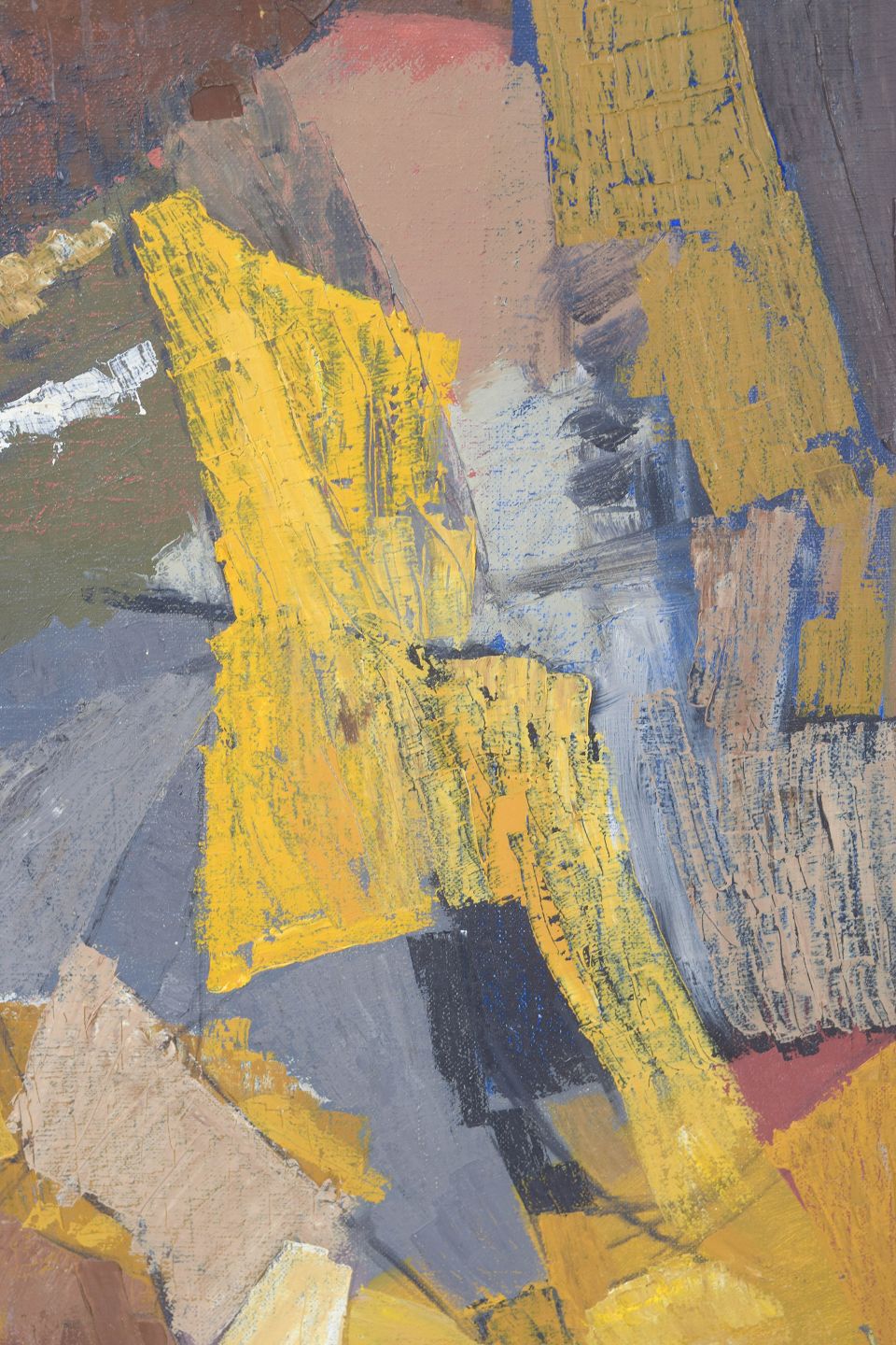 Niels Andersen, oil on canvas, Swedish visual artist.Abstract composition with powerful brush and palette knife work in earth tones and yellow hues.