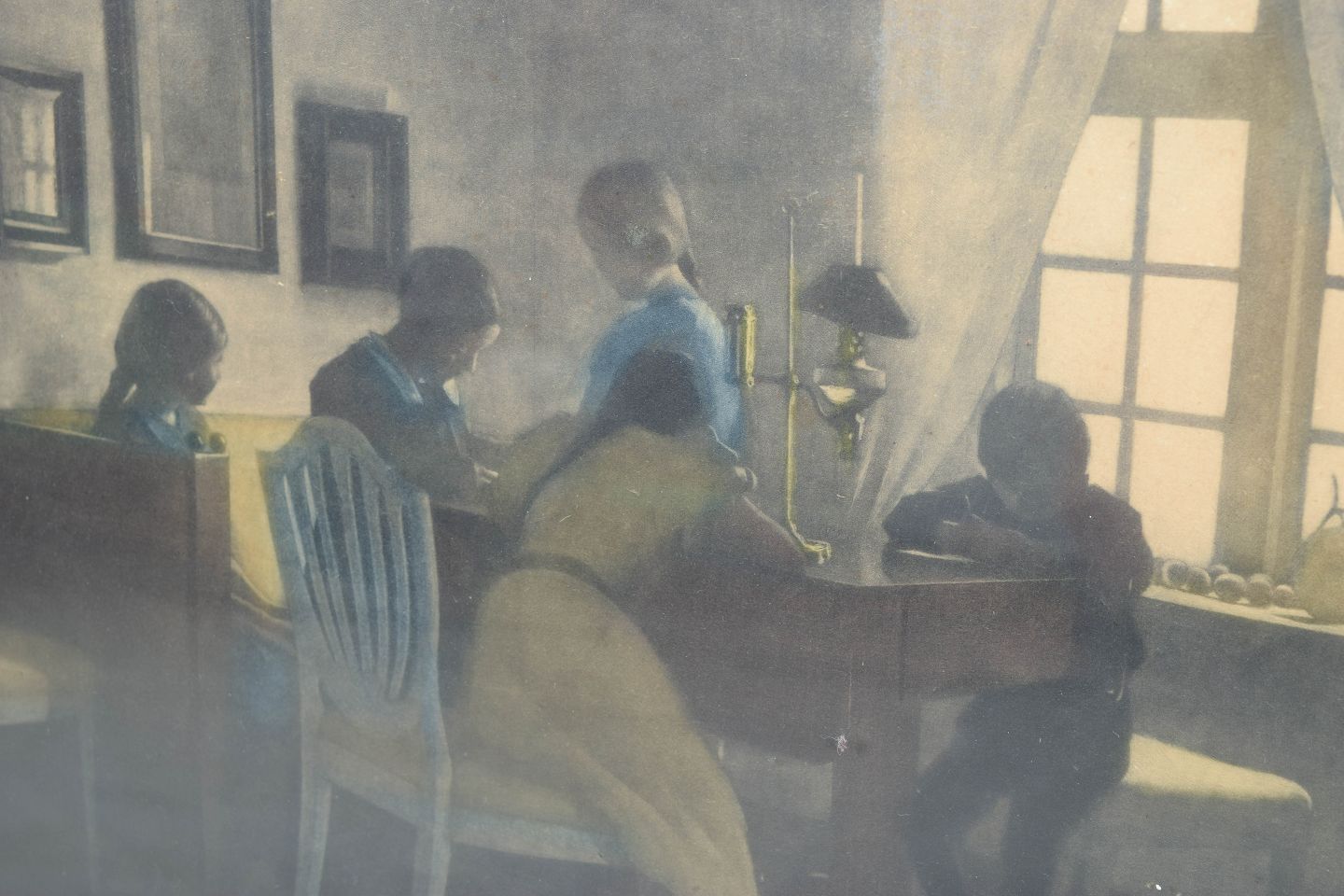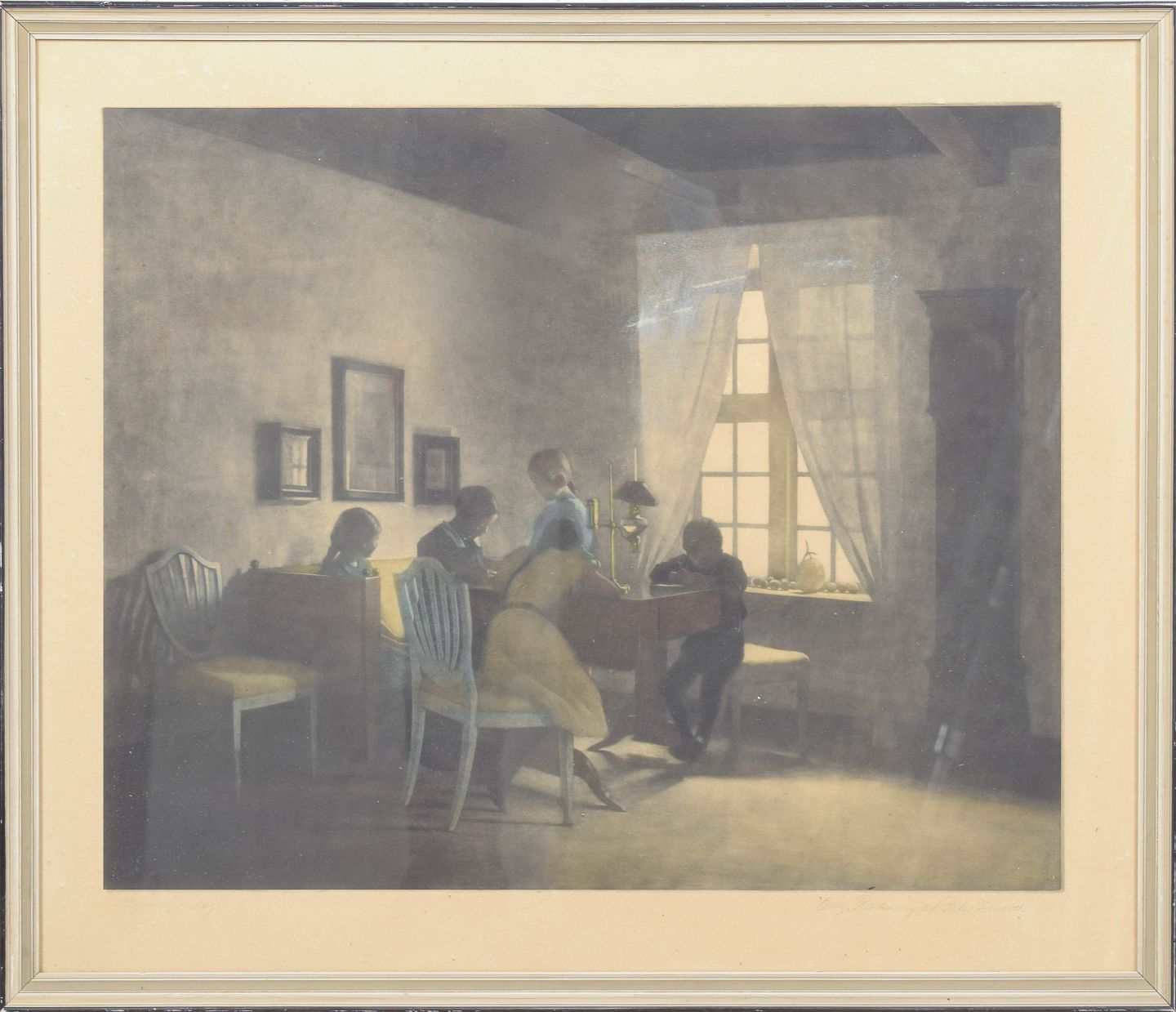 Peter Ilsted, color mezzotint, “Rainy Day”, listed Danish artist.Quiet interior scene depicting figures gathered around a table in subdued light, executed as a color mezzotint in Ilsted’s characteristic tonal and atmospheric style. Signed in pencil.