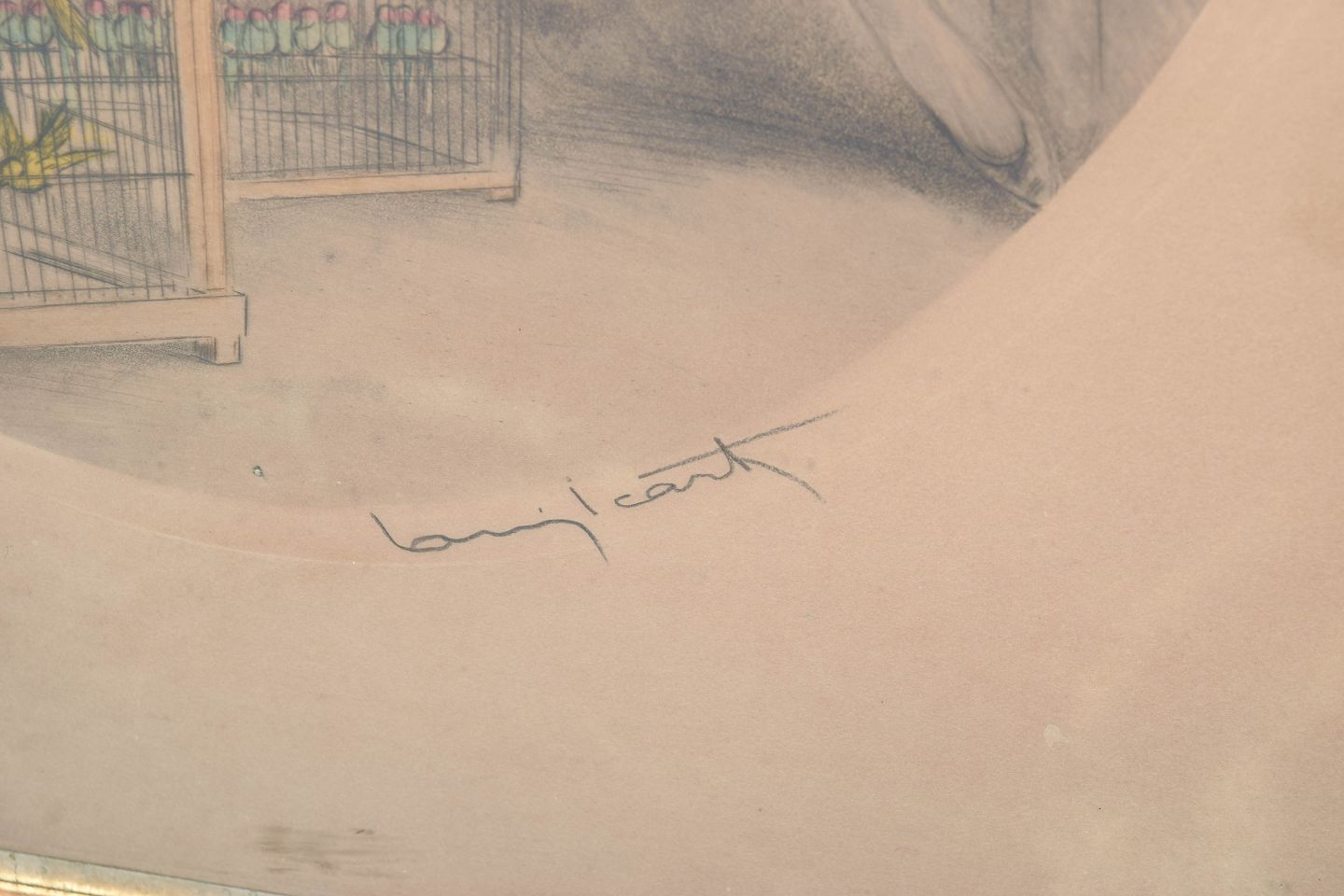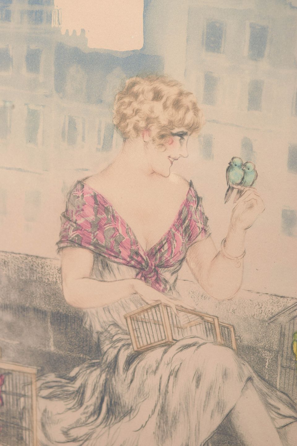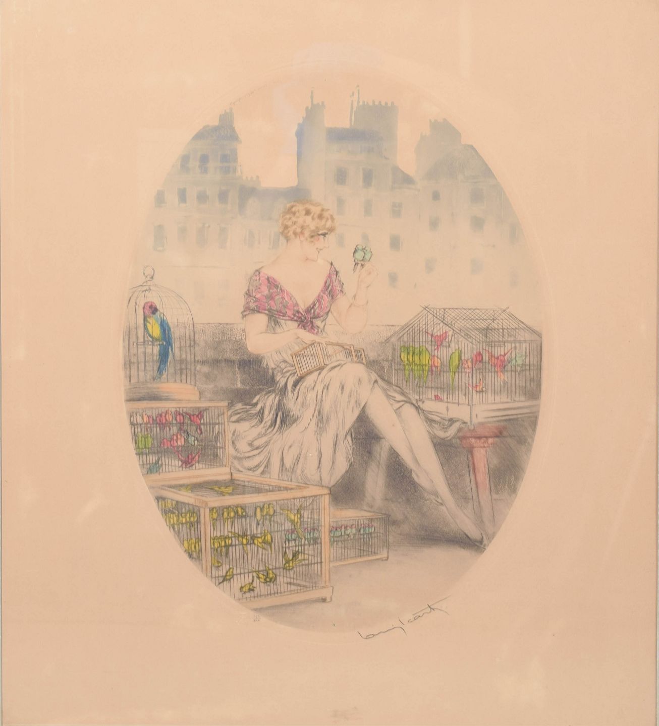 Elegant and decorative composition depicting a seated woman surrounded by birdcages, executed in Icart’s characteristic Art Deco style with refined linework and delicate colouring. Signed in pencil.