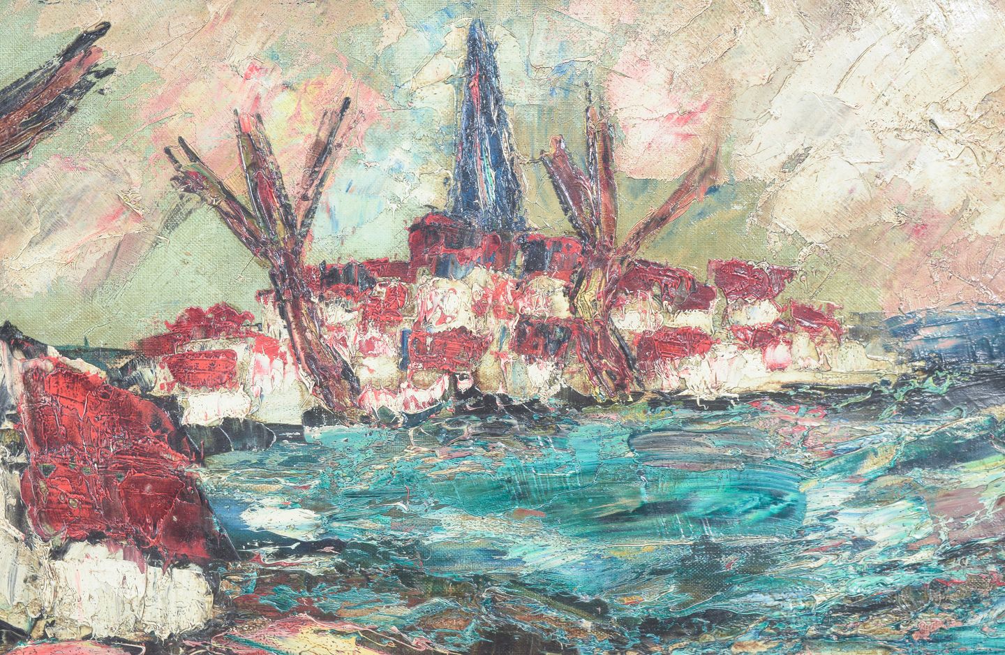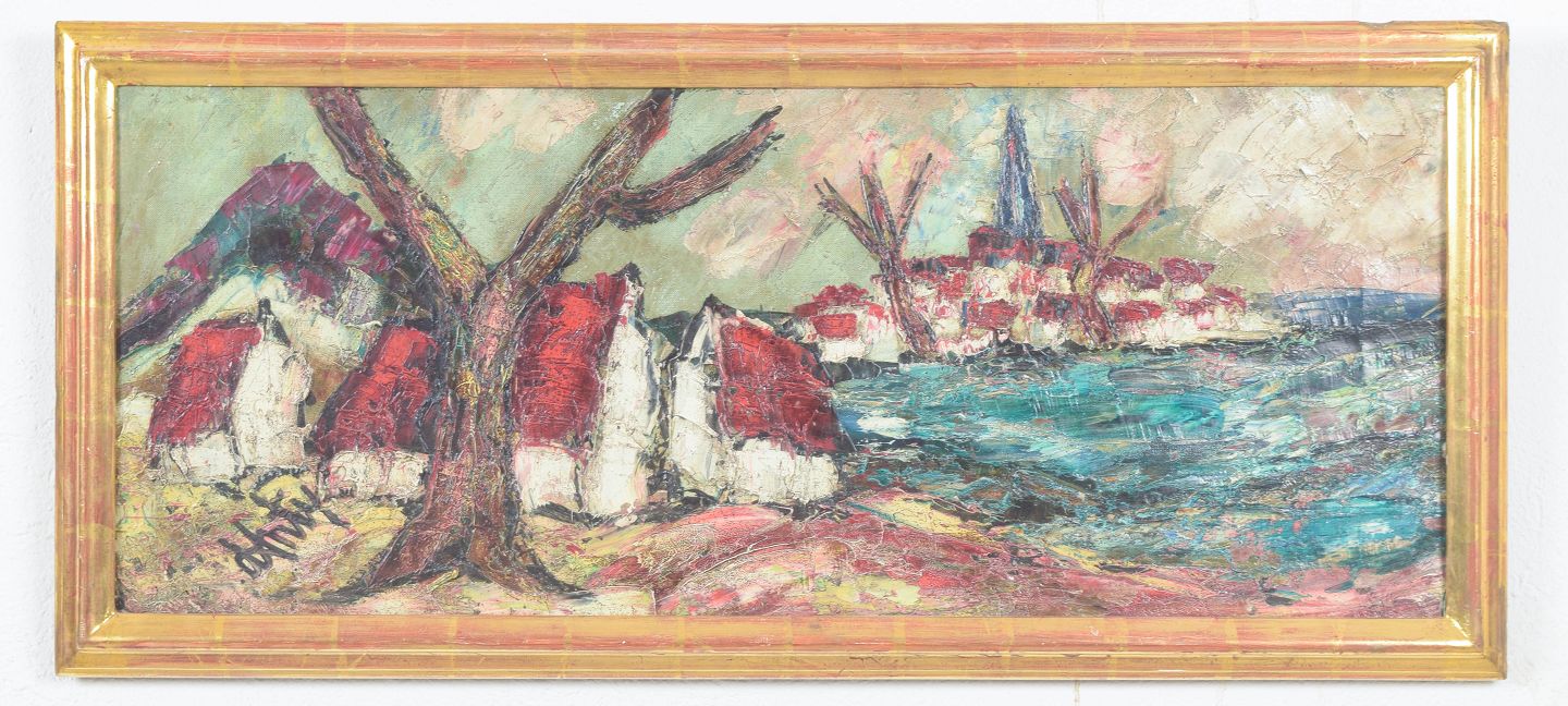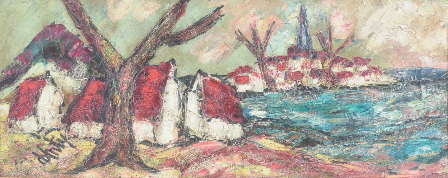 Expressive landscape with buildings and water rendered in a strong gestural manner with thick impasto application. The composition carries an abstract character with bold colour contrasts and dynamic structure. Signed.