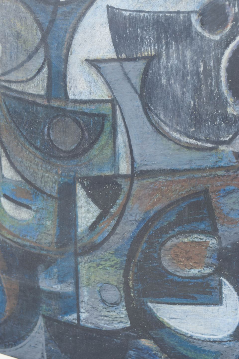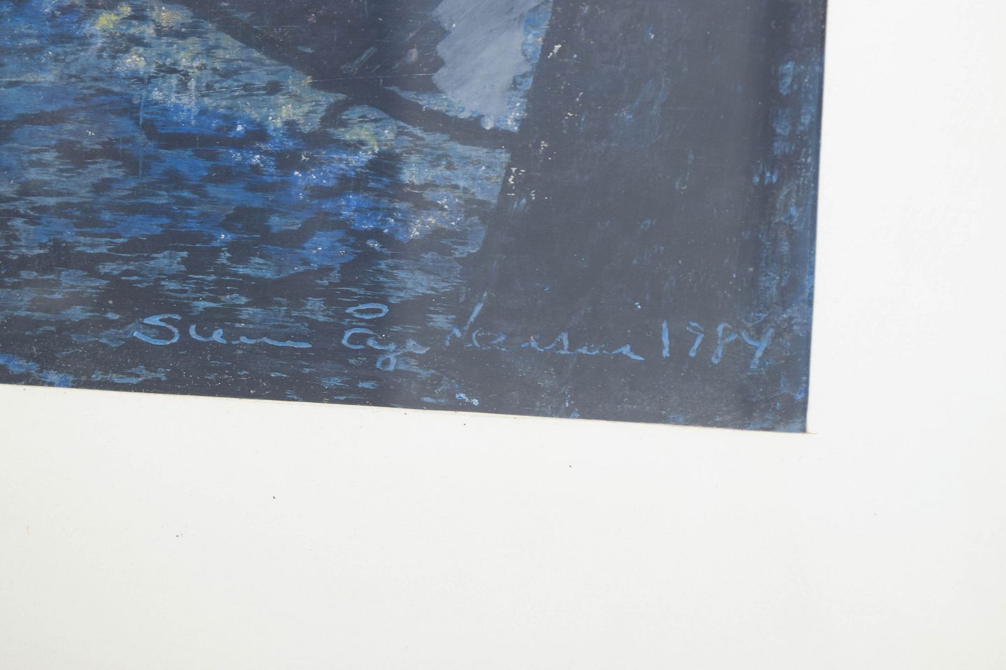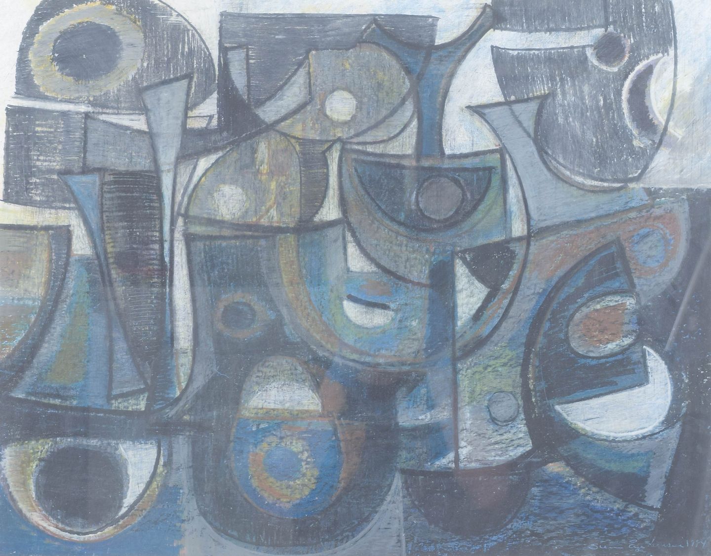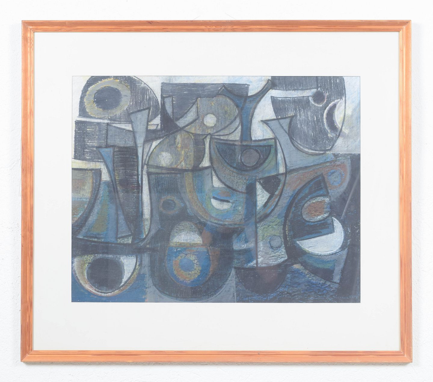 Svend Åge Larsen, crayon on paper, listed Danish artist.Non-figurative abstract composition in blue and grey tones with organic and geometric forms, executed in crayon on paper and mounted behind glass. Signed and dated 1984.