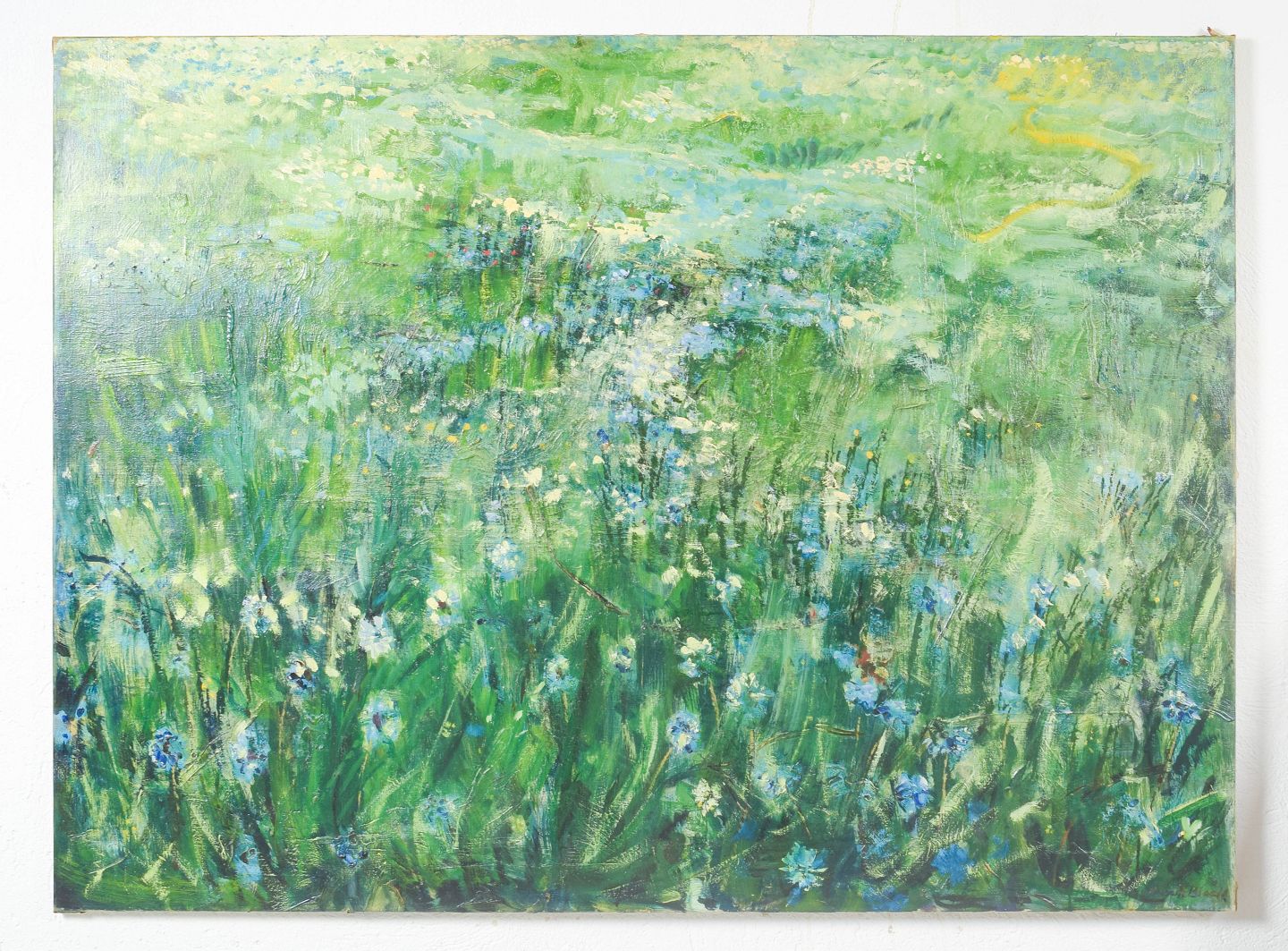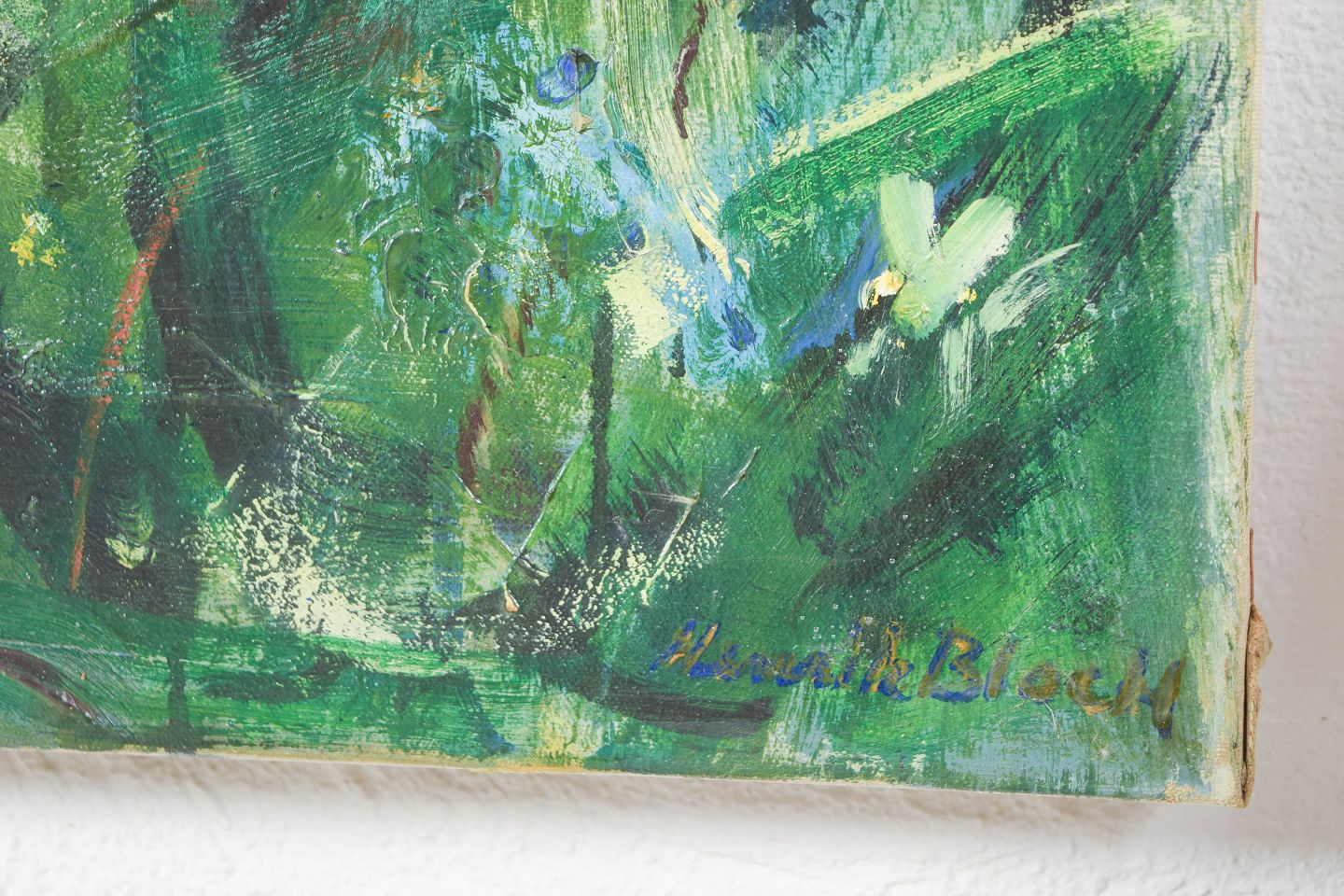 Henrik Bloch, oil on canvas, listed Danish artist.Expressionist landscape depicting a flowering field rendered with loose and vibrant brushwork. The composition conveys a light and atmospheric quality, dominated by green and blue tonalities. Painting of high quality. Signed.