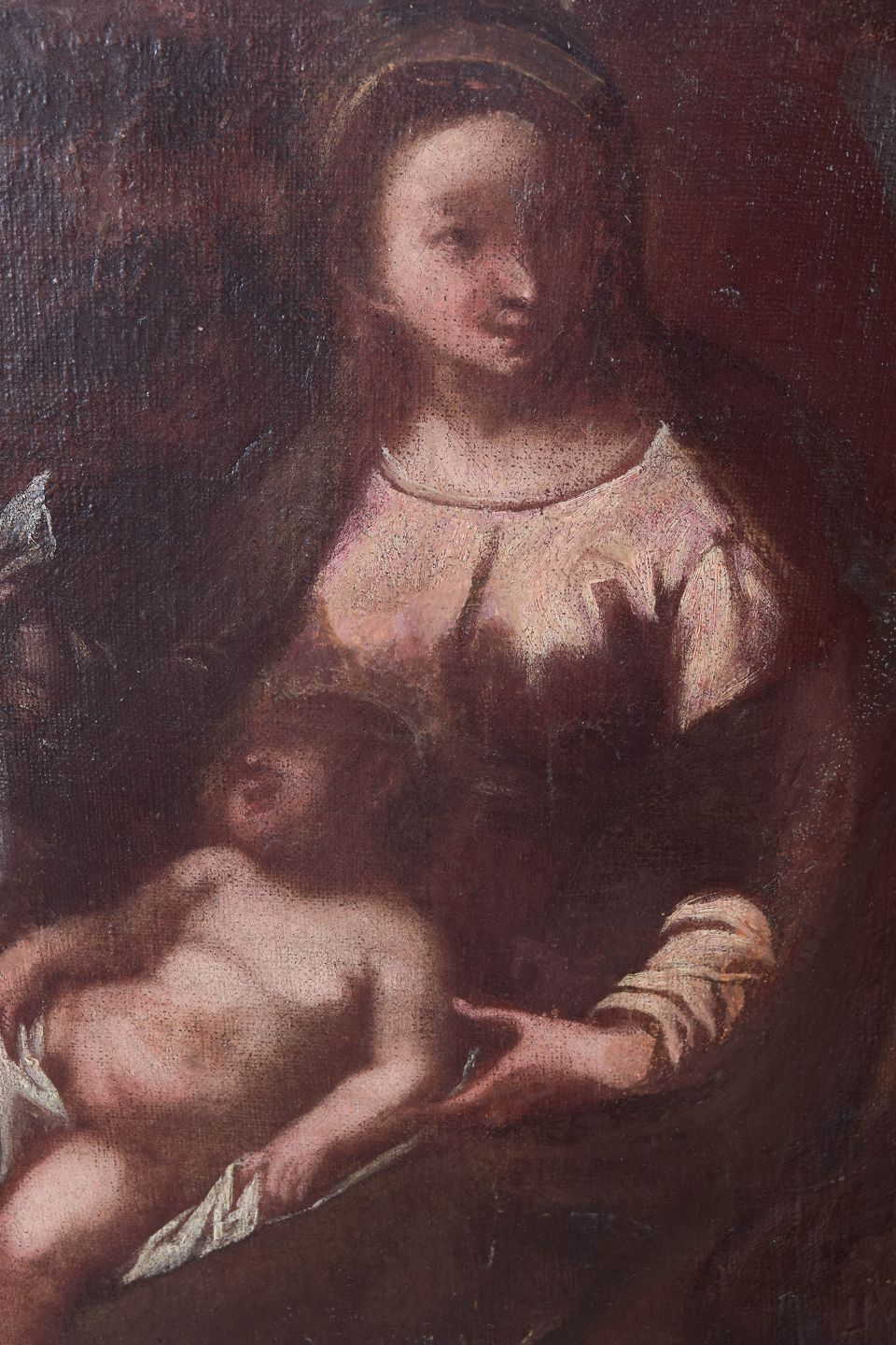 Flemish school, religious subject, old master.Classical religious composition depicting Madonna and Child accompanied by a saintly figure and an angel, rendered in a soft and subdued palette characteristic of the Baroque tradition. Executed in oil on canvas and later professionally restored.
