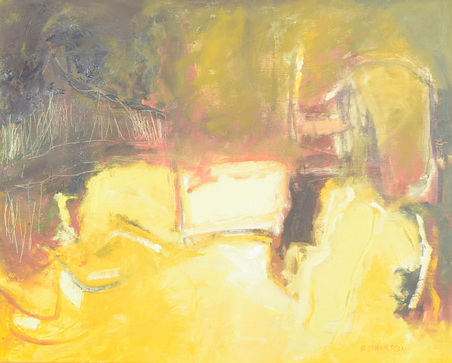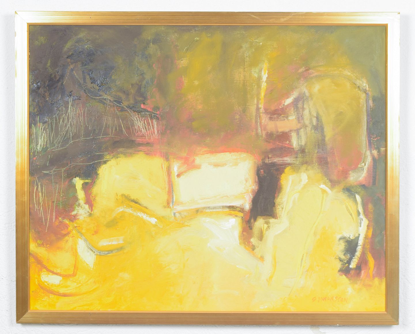 G. Johansson, abstract composition, Swedish artist.Abstract composition executed in oil on canvas with subtle figurative elements and soft, dissolved forms in warm tonalities. Signed.