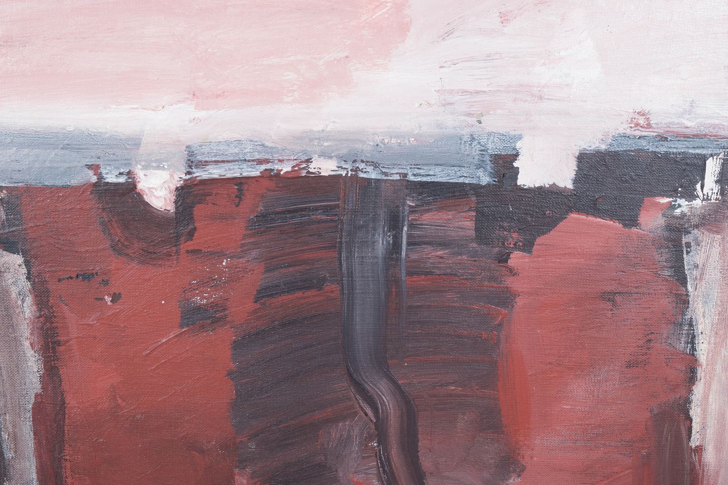 Göran Nilsson, abstract composition, listed Swedish artist.Abstract composition executed in oil on board with expressive brushwork and layered colour fields in muted reddish and grey tones. The composition shows a balanced tension between structure and spontaneity, signed.