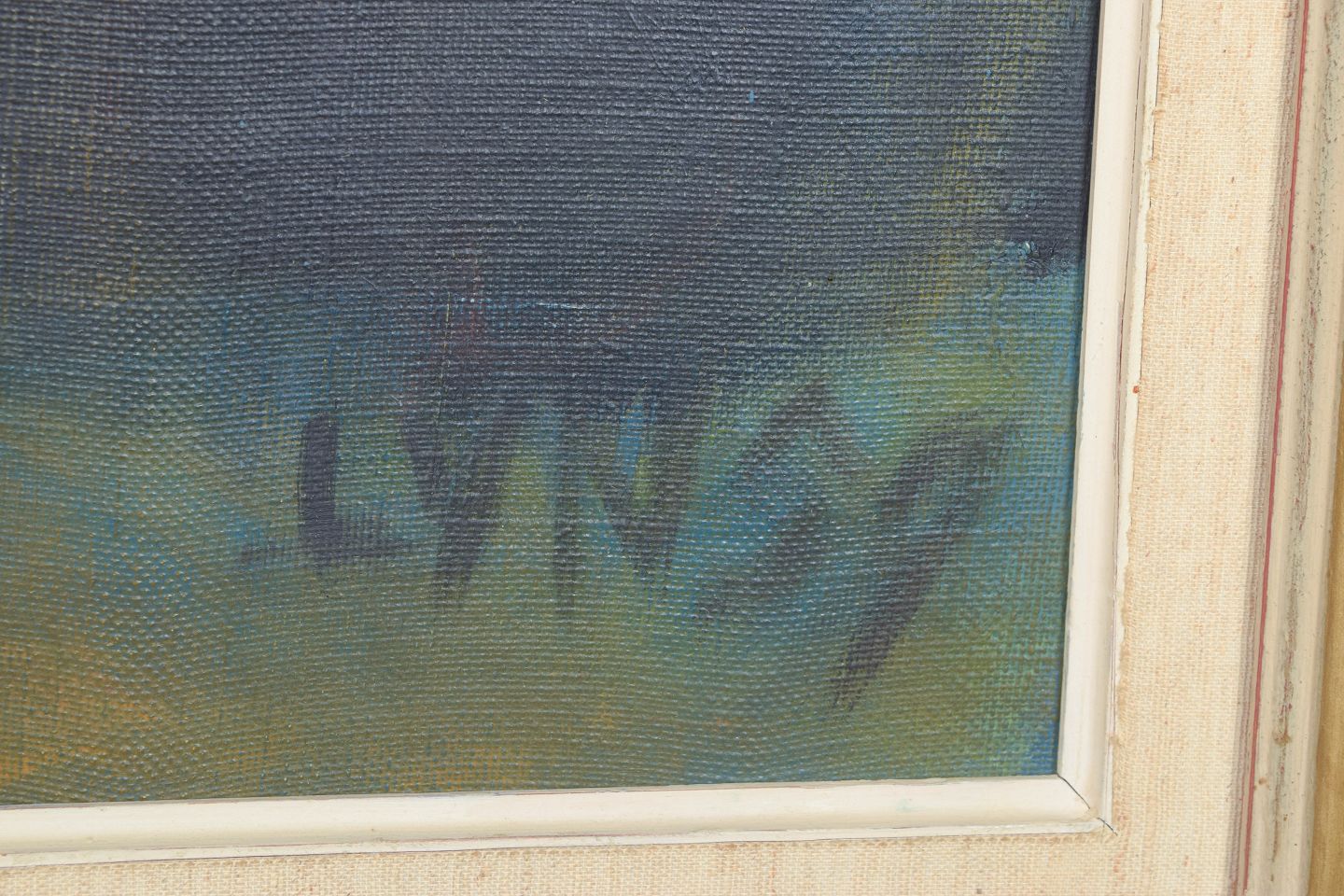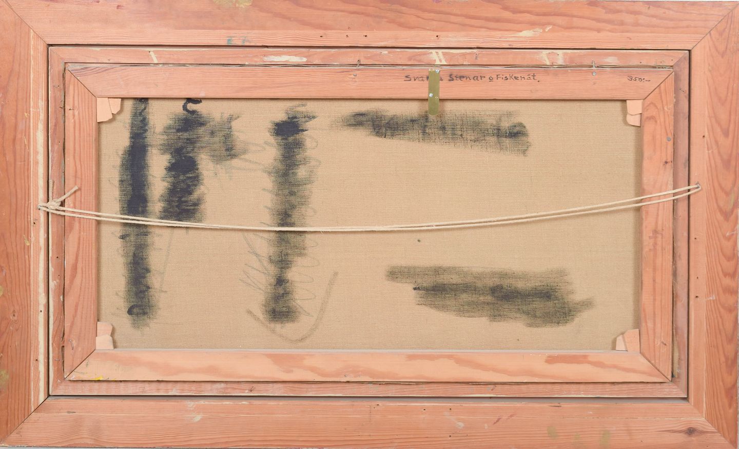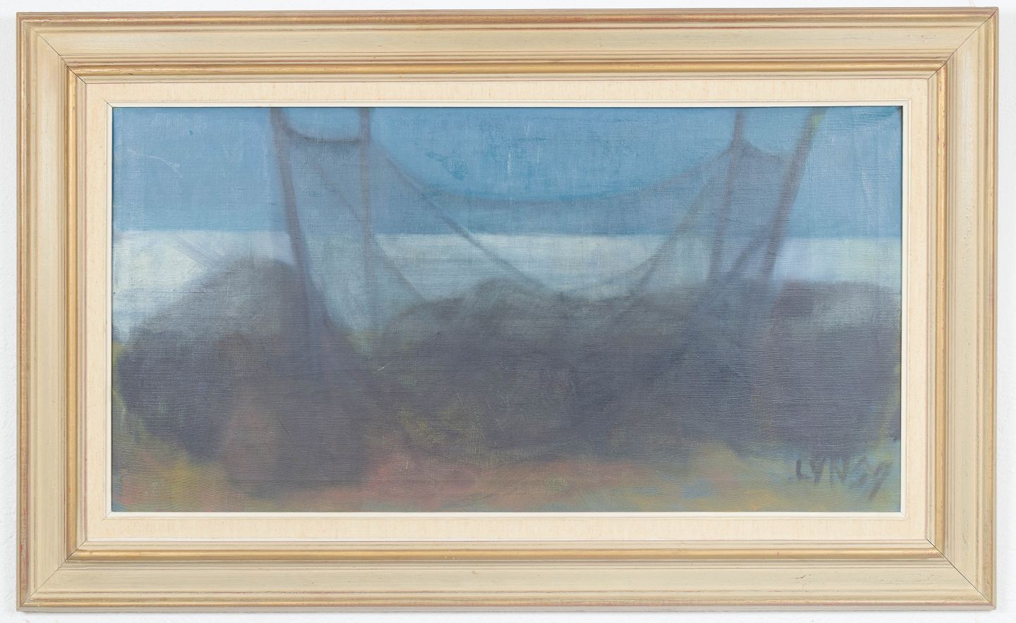 Lars Yngve Nilsson, “Svarta stenar o fiskenät”, oil on canvas, listed Swedish artist.Modernist composition with a stylised landscape motif, where dark forms and net-like structures are rendered in a subdued and atmospheric palette. Executed in oil on canvas, signed and dated 1959.