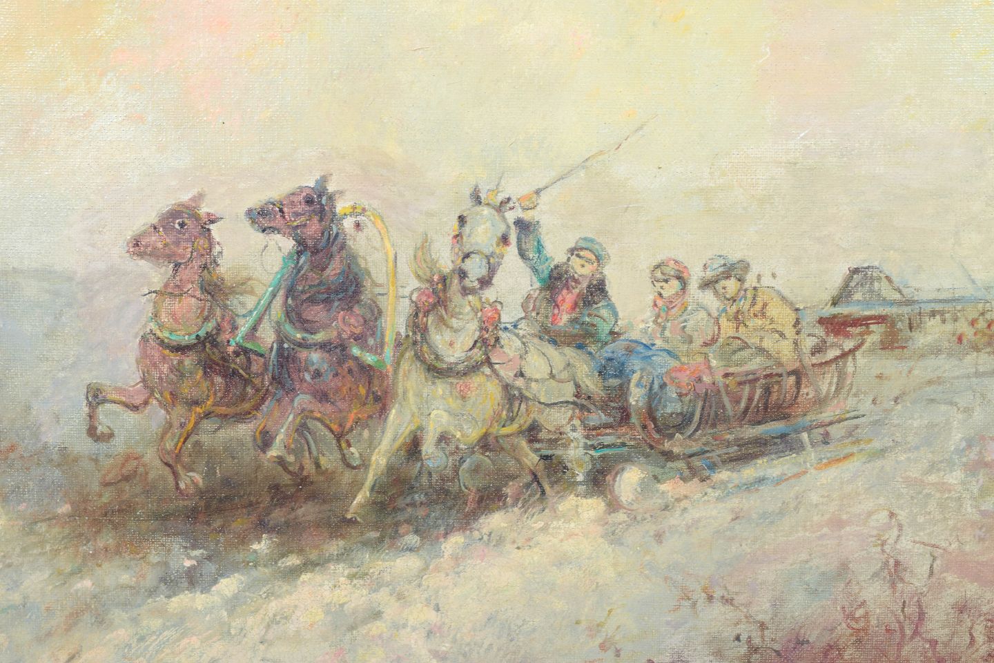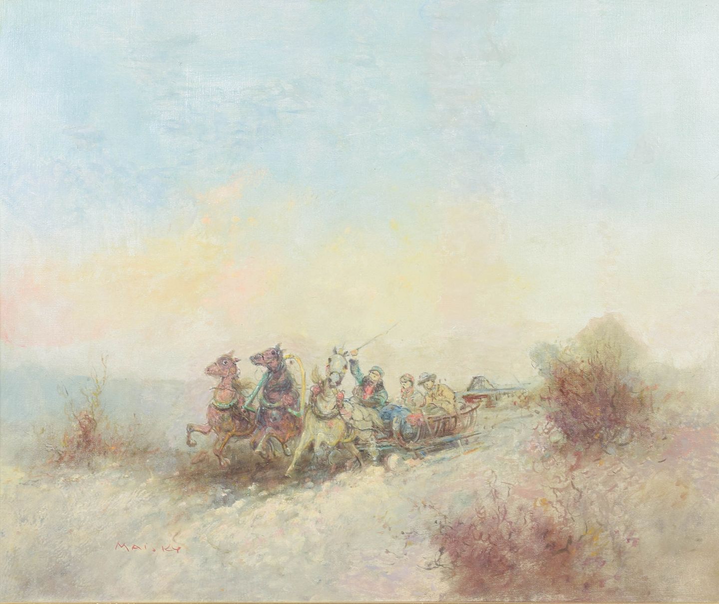 Fedor Maisky, oil on canvas, listed Austrian artist.Atmospheric composition depicting a horse-drawn carriage with figures in an open landscape, rendered in a light and delicate palette with soft transitions and a sense of depth. Signed.