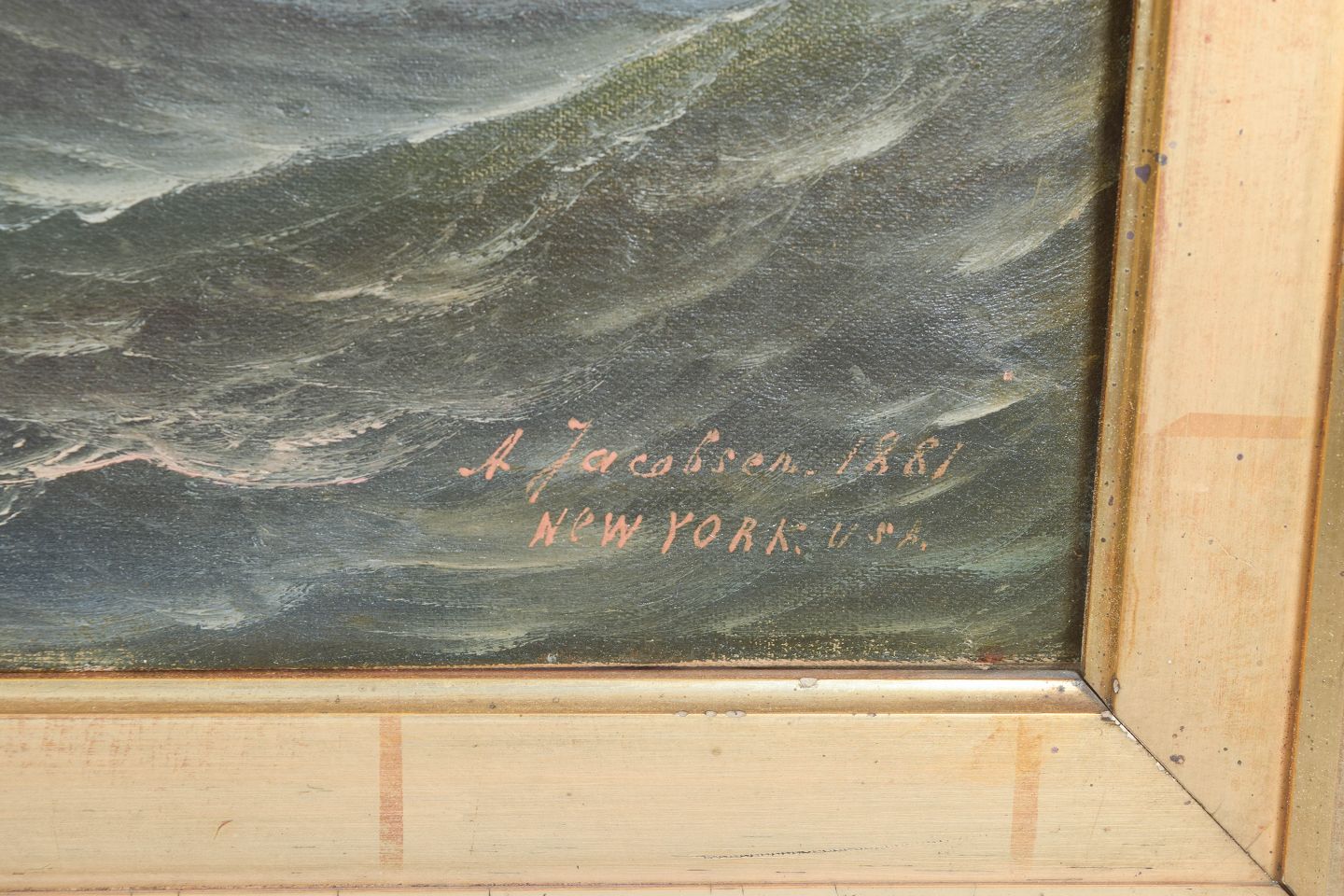 Antonio Jacobsen, marine painting, listed Danish-American artist.Detailed depiction of a steamship under sail on open water with rolling waves and a clear sky. The composition is executed with high precision in the rendering of the vessel’s structure and rigging, characteristic of the artist’s maritime works. Oil on canvas, signed and dated 1881.