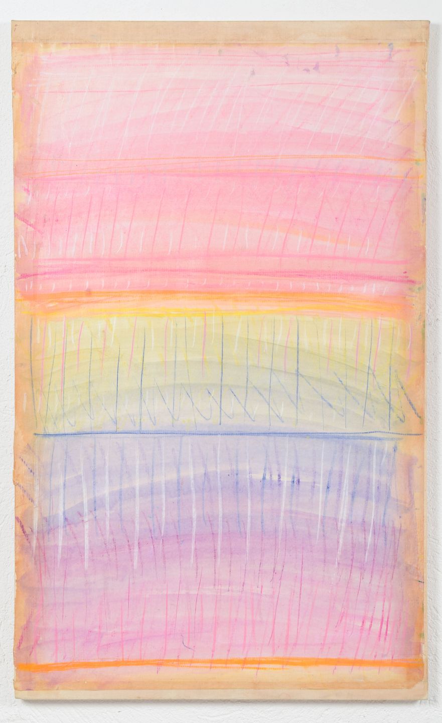 Monique Beucher (1934) French artist, mixed media.Abstract composition executed on paper mounted on canvas, with horizontal color fields in pink, yellow, and blue tones, combined with gestural line work.