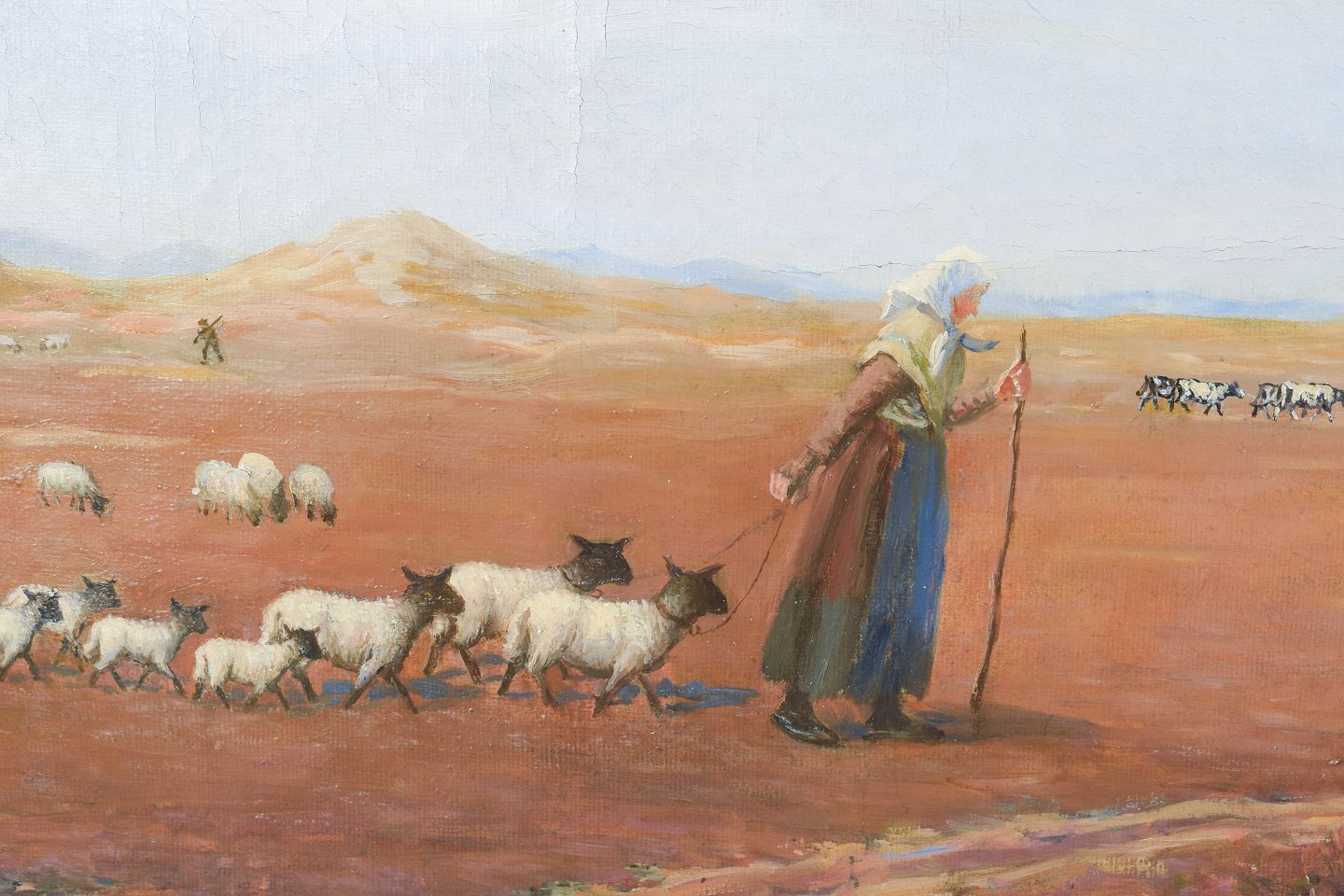 Albert Petersen, “Dyrene tages hjem”, oil on canvas, listed Danish artist.Naturalistic landscape scene depicting a shepherd with a flock of sheep in open terrain, rendered in a calm and atmospheric palette. The composition reflects rural life around the turn of the century, with emphasis on light, space, and narrative. Signed.