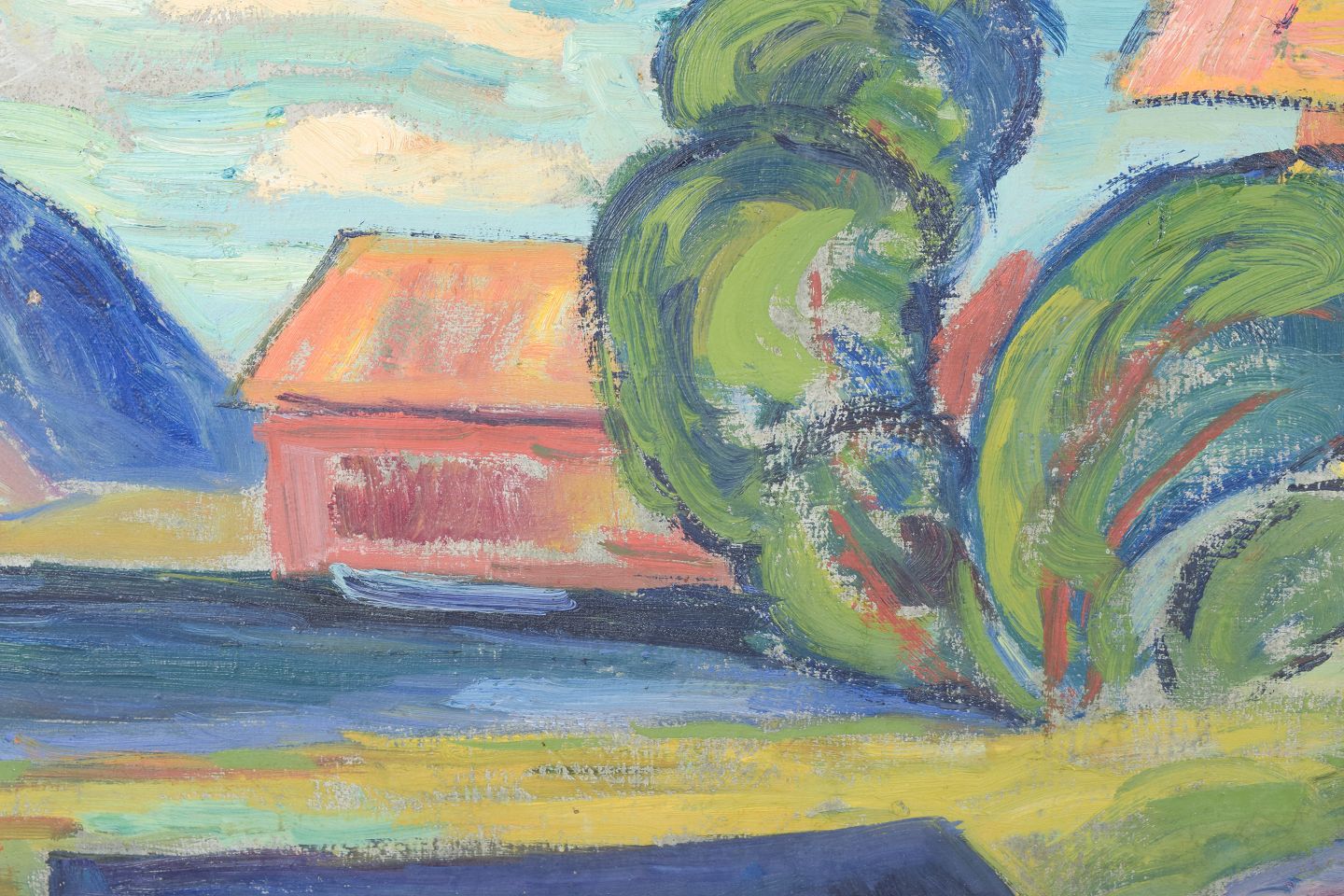 Gustaf Börtner, oil on canvas, listed Swedish artist.Colourful modernist landscape with stylised tree forms and architectural elements, executed in a free and expressive brushwork. Signed and dated 1945.