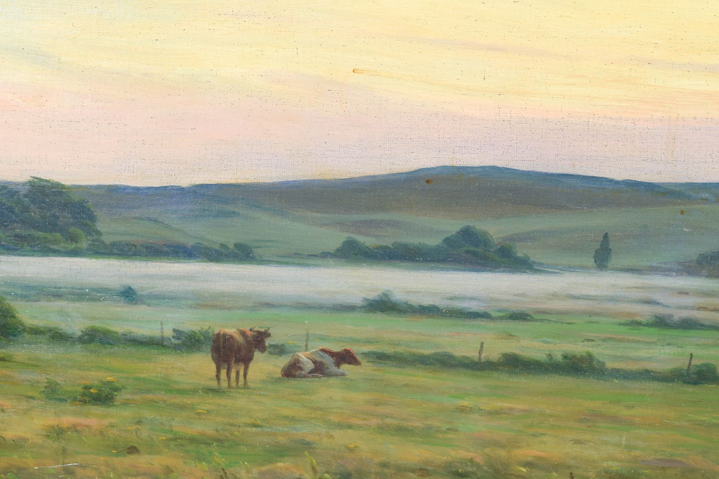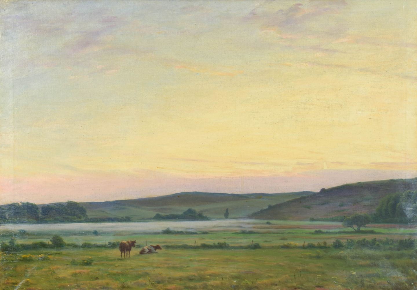 Sigvard Hansen, oil on canvas, listed Danish visual artist.Naturalistic landscape with grazing cows in open countryside beneath a soft sky, rendered with a refined palette and calm atmosphere. Signed and dated 1936.