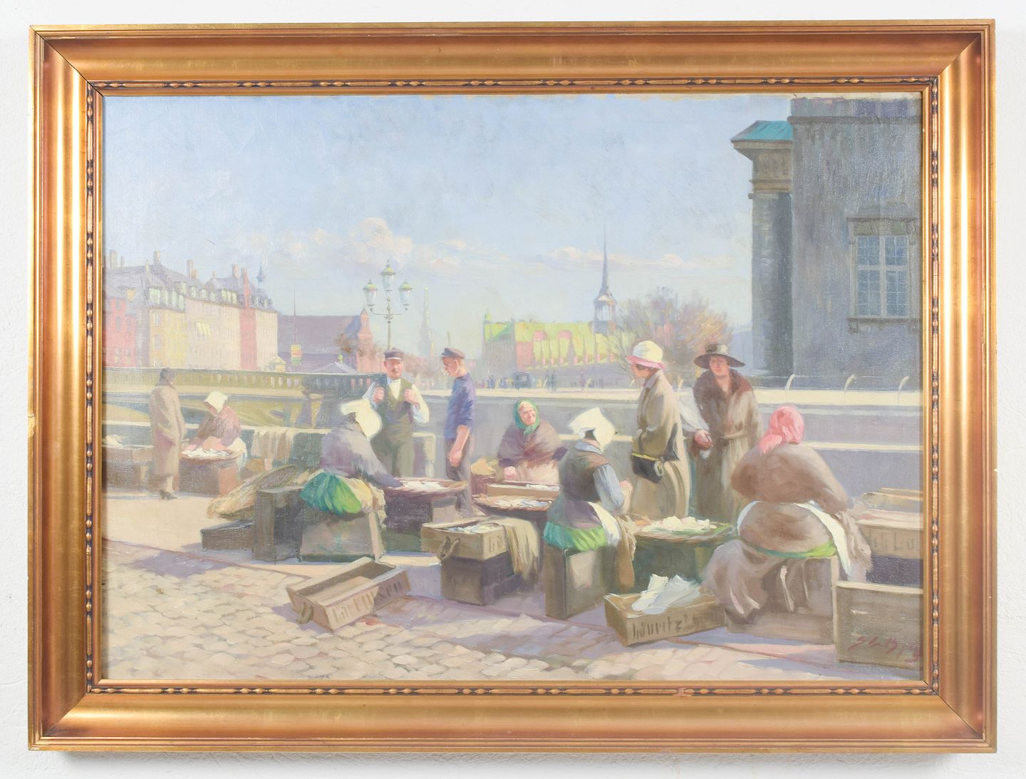 Søren Christian Bjulf, Gammel Strand, listed Danish artist.Atmospheric depiction of life at Gammel Strand in Copenhagen with fish-selling women and everyday urban activity, executed as a naturalistic and light-filled oil painting. Signed.