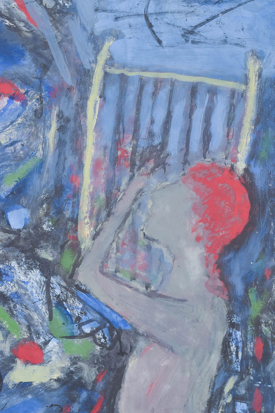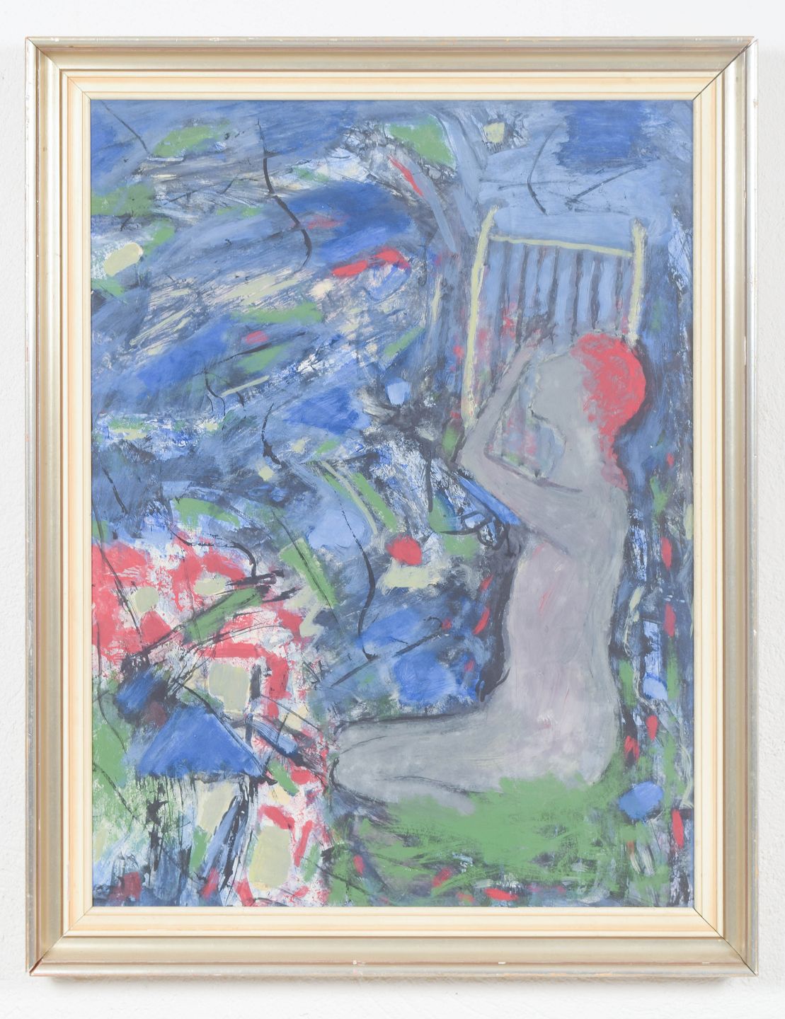 Viggo Loos, oil on board, listed Swedish visual artist.Abstract composition with dynamic brushwork and layered fields of colour in blue, green, and red tones, executed in oil on board. Unsigned.